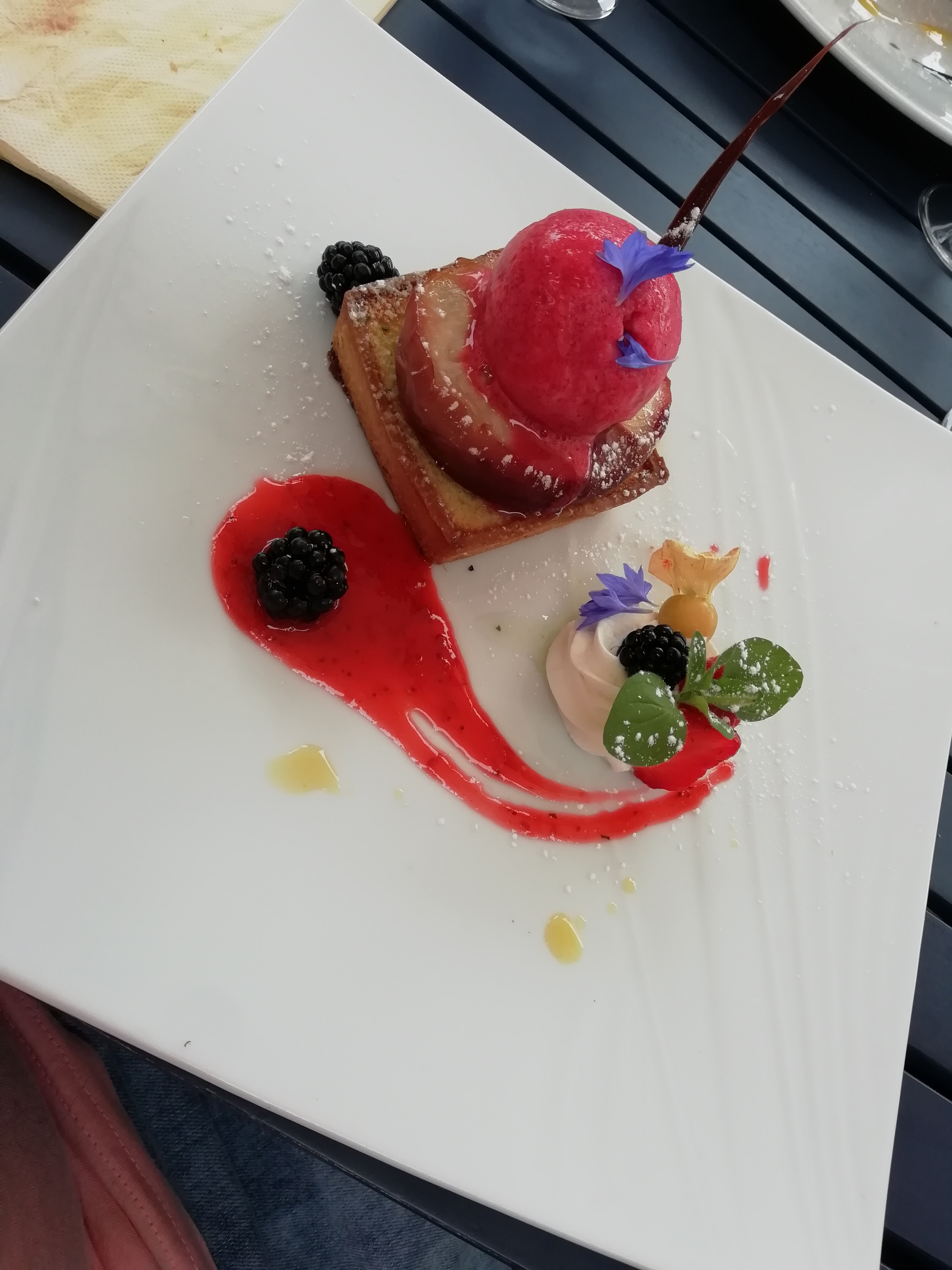 Assiettes magnifiques à la vue et au goût. Service un peu rapide et dommage que nous n ayons pas été très bien reçus. En arrivant on nous a demandé de parler moins fort, le temps que le serveur prenne la commande du 1er groupe. Et qu à 15 h 30 on nous a demandé de partir. Les serveurs avaient faim et il fallait dresser les tables pour le service du soir. Nous sommes arrivés à 12h40. C'est un peu juste... pour manger une salade OK, mais pas pour un apero, une entrée, un plat, un dessert et un digestif....