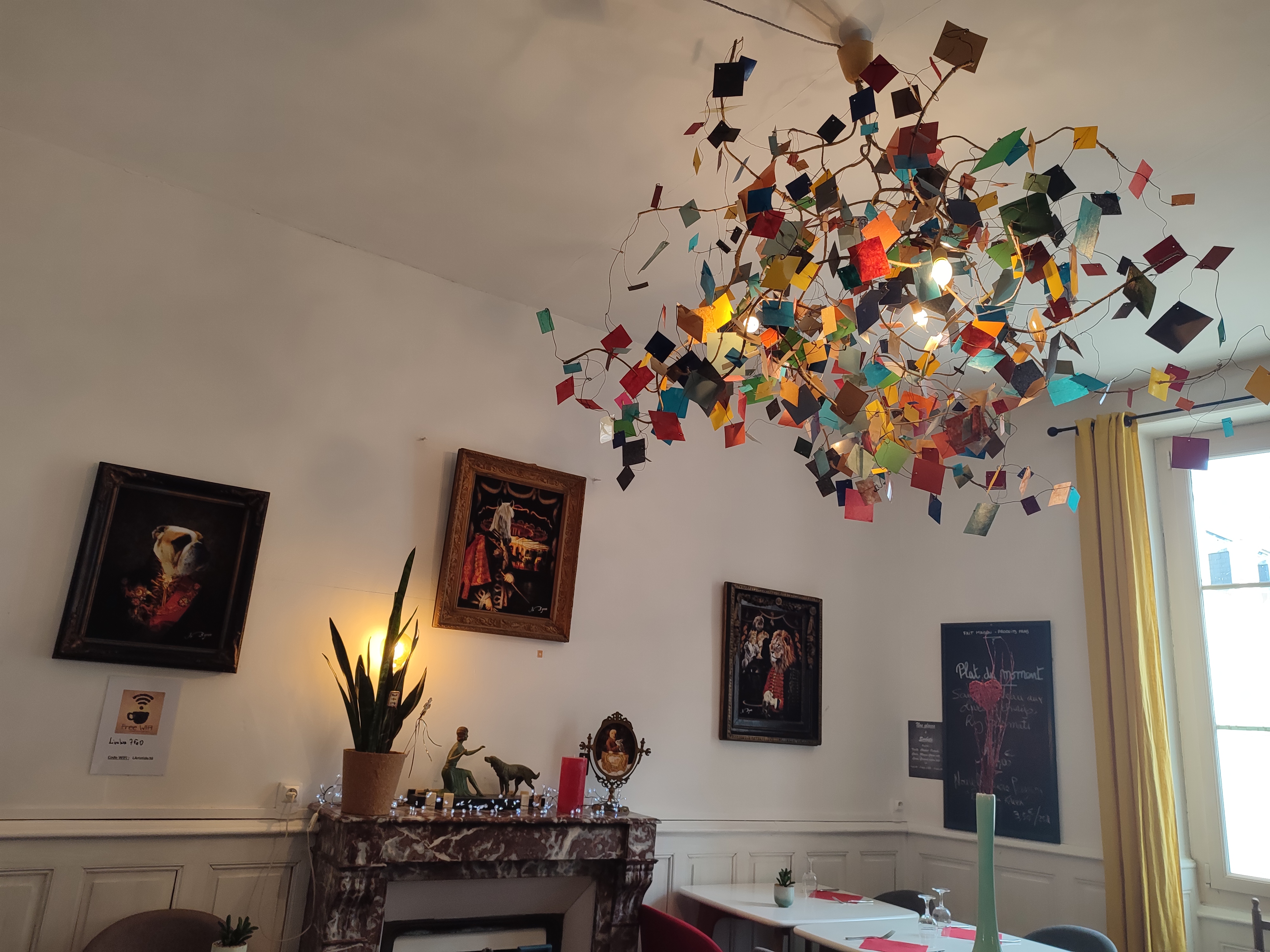 CONFORT, INTIMITE, PRODUITS FRAIS, PLAT DU JOUR SAVOUREUX et tarifs corrects. Et d'EXCELLENTES et copieuses SALADES VARIEES avec du POULIGNY SAINT-PIERRE sur PAIN AUX GRAINES ou avec les PRODUITS LOCAUX de FISH BRENNE. Et le cake aux carottes, un délice ... L'Après-midi, idéal salon de thé avec de bons thés et des jus de fruit d'Alain Milliat. Un de mes deux points de chute entre copines. A midi et après le marché, une pause idéale. Et le soir jusqu'à minuit, après le cinéma j'adore aller boire une bière Guinness, Brewdog, Ruby Jack ou une Spitfire. Mon mari c'est un bon verre de vin et il laisse le patron choisir. Une petite assiette de fromage ou de charcuterie de qualité, souvent les deux. Et nous pouvons débattre du film vu au Blanc. Parfait. Sortir le soir sans être obligé de se taper la cloche un rêve !!! Ambiance pub. Dans cette maison fin 19ème début 20ème, rénové avec soin et pertinence, avec une terrasse extérieure à l'abri des regards, le chef Christophe vous reçoit avec un sourire charmeur et une simplicité qui fait que l'on se sent déjà chez soi chez lui. Les planchers en bois ont été gardés, les couleurs mats sur les murs sont agréables. Originalité du lustre qu'une des mes amies est entrain de commander pour chez elle. Se succèdent ici petits salons et salles et l'on peut même en réserver un à l'étage pour être entre copains. C'est vraiment génial. Merci à l'enfant du pays qui a su innover dans la qualité.