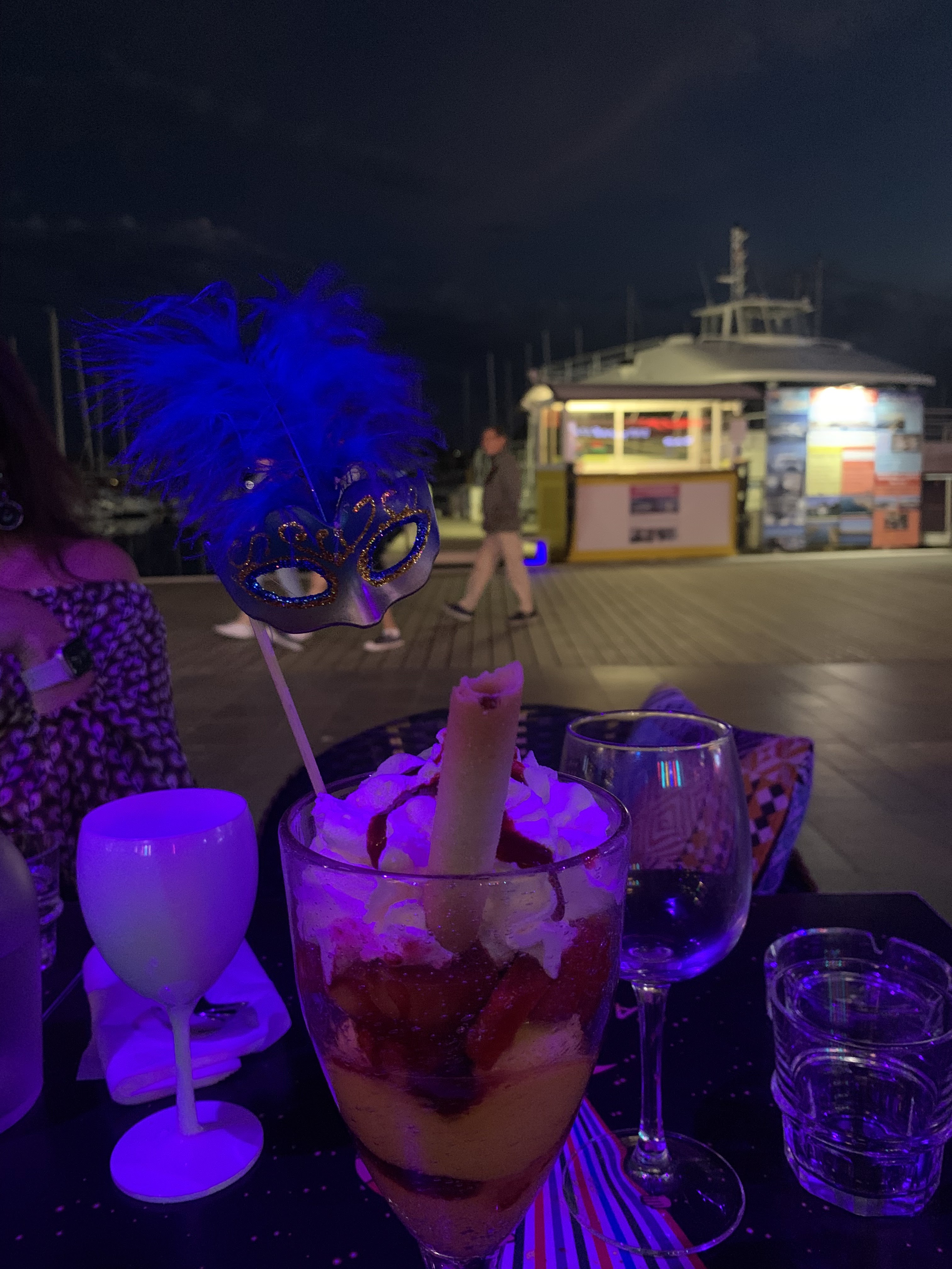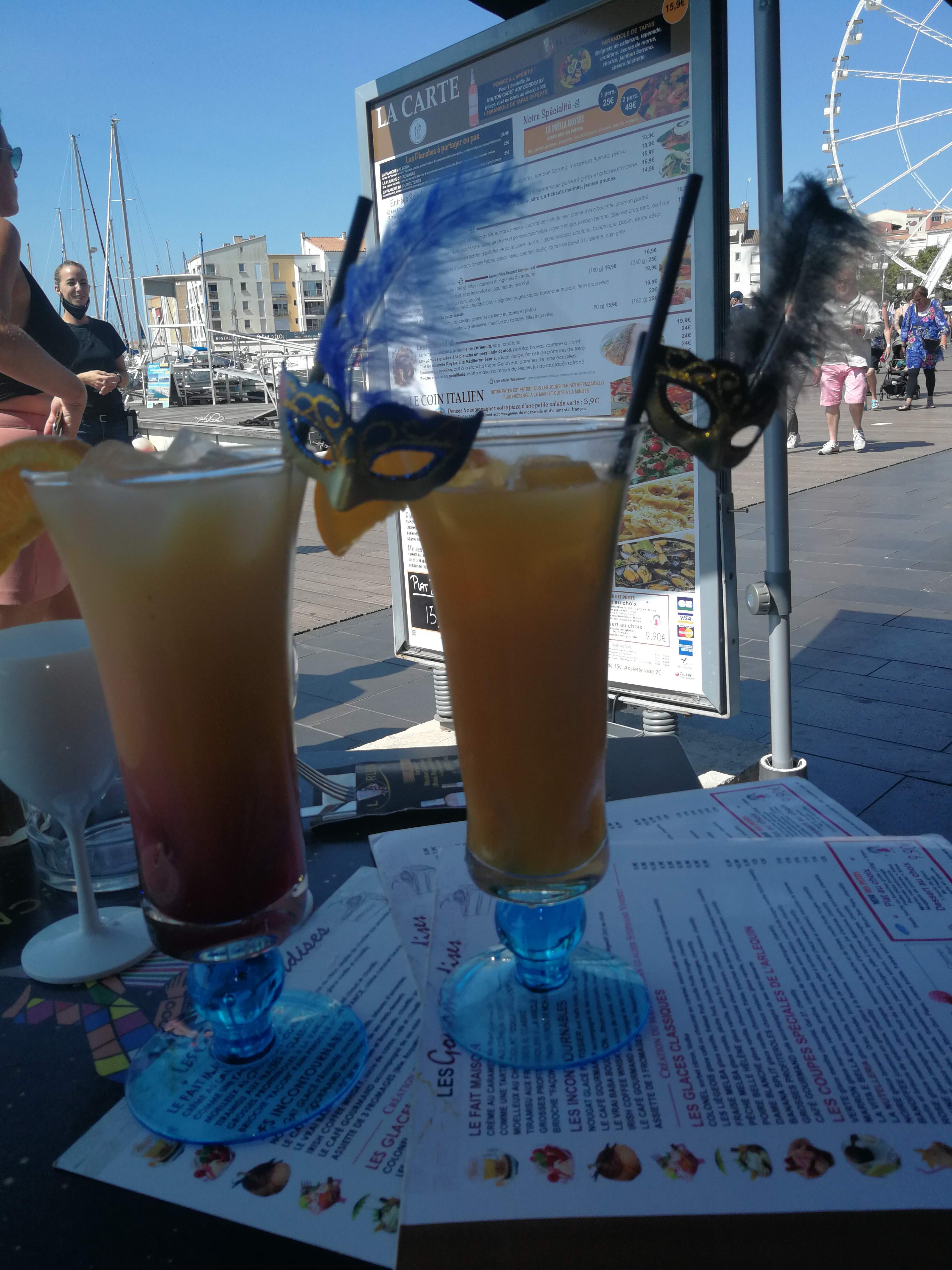 Belle accueil, cocktail au top, les glaces aussi plus leurs déco masque qui en font leur démarcation entre autres. Repas correct midi plus soir avec groupe chanteurs musiciens, belle animation qui je pense sont les seuls à représenté. Bien placé aussi sur le port au milieu des commerces, c'est non négligeable pour le mélange balade et dégustation. Personnels au top n'hésitez pas c'est une bonne adresse.