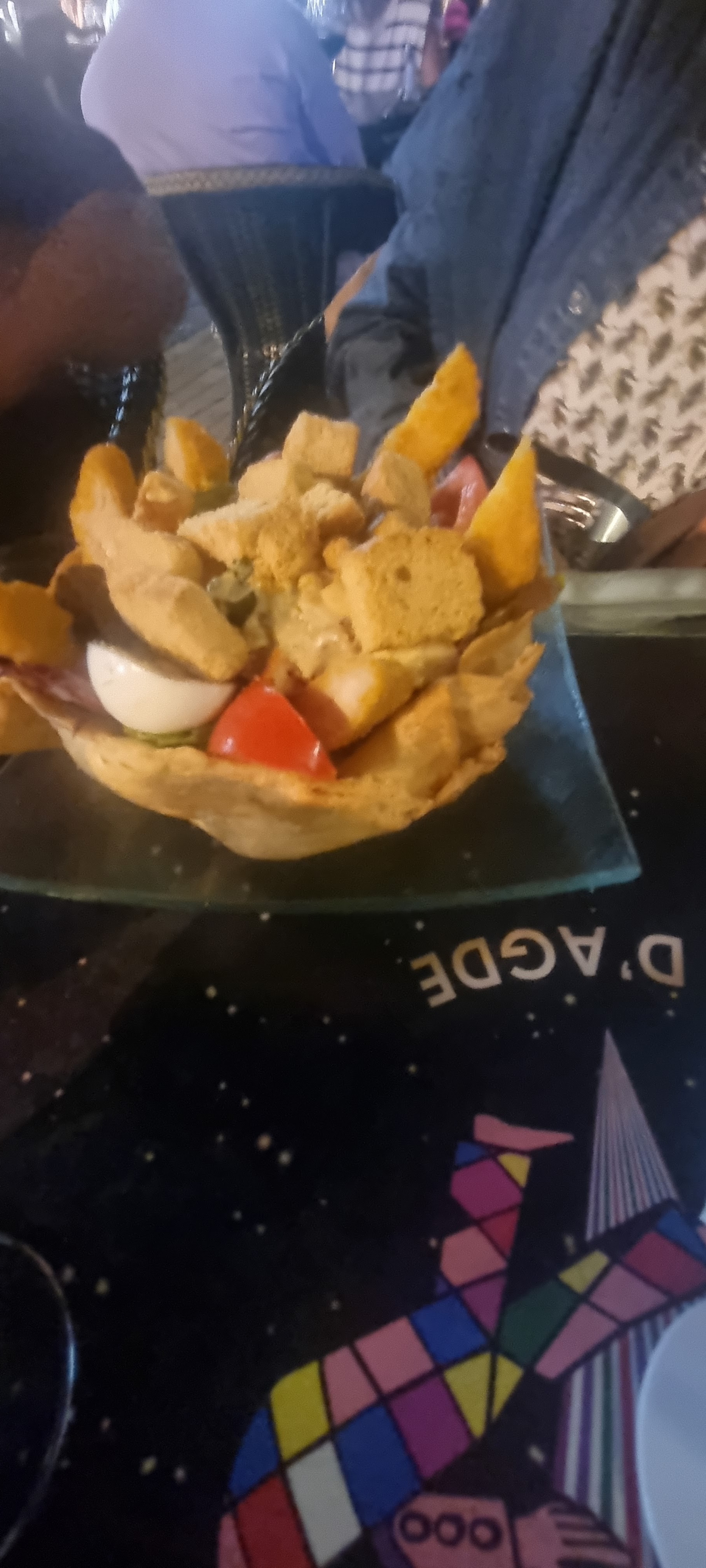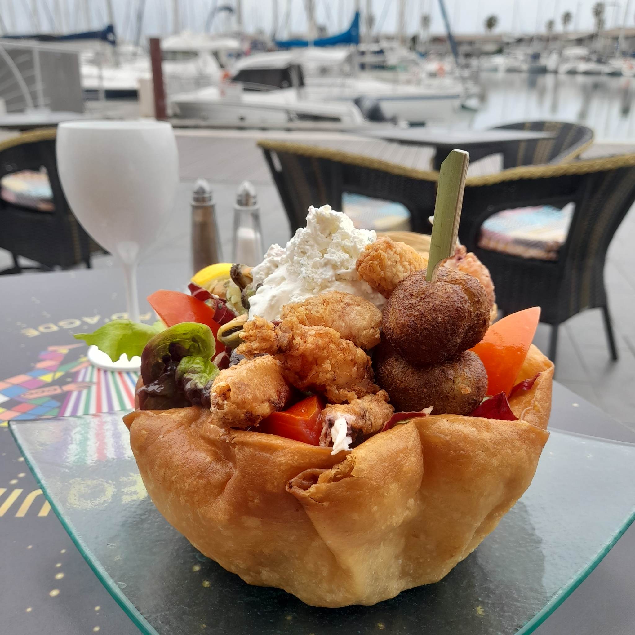 Cadre unique au bord de l'eau face au petit port !😎 J'ai adoré le spot et je l'ai testé malgré son ambiance très touristique. Je suis venu déjeuner un jour et prendre un café le lendemain !🥰 La salade de mer que j'ai eue le 1er jour était à l'origine servie et très généreusement servie. Tempura de calamar 🦑, accras de morue 🍘, fruits de mer 🍤 mélangés à des tomates, salade et accompagnés d'une crème de ciboulette servis dans un bol géant de galette de tacos 🌮 C'était frais et délicieux 🤤 Je n'ai pas pu le finir et demander un doggie bag vu sa taille 👉🏼 Il suffit de regarder la photo pour vous faire votre propre opinion Outre le plat, il faut souligner le professionnalisme, la gentillesse et l'attention du personnel. Ce n'est pas donné dans les lieux touristiques ! Je recommande fortement cet endroit et si jamais je reviens à Adge, soyez sûr que je retournerai à l'Arlequin pour mon prochain repas !