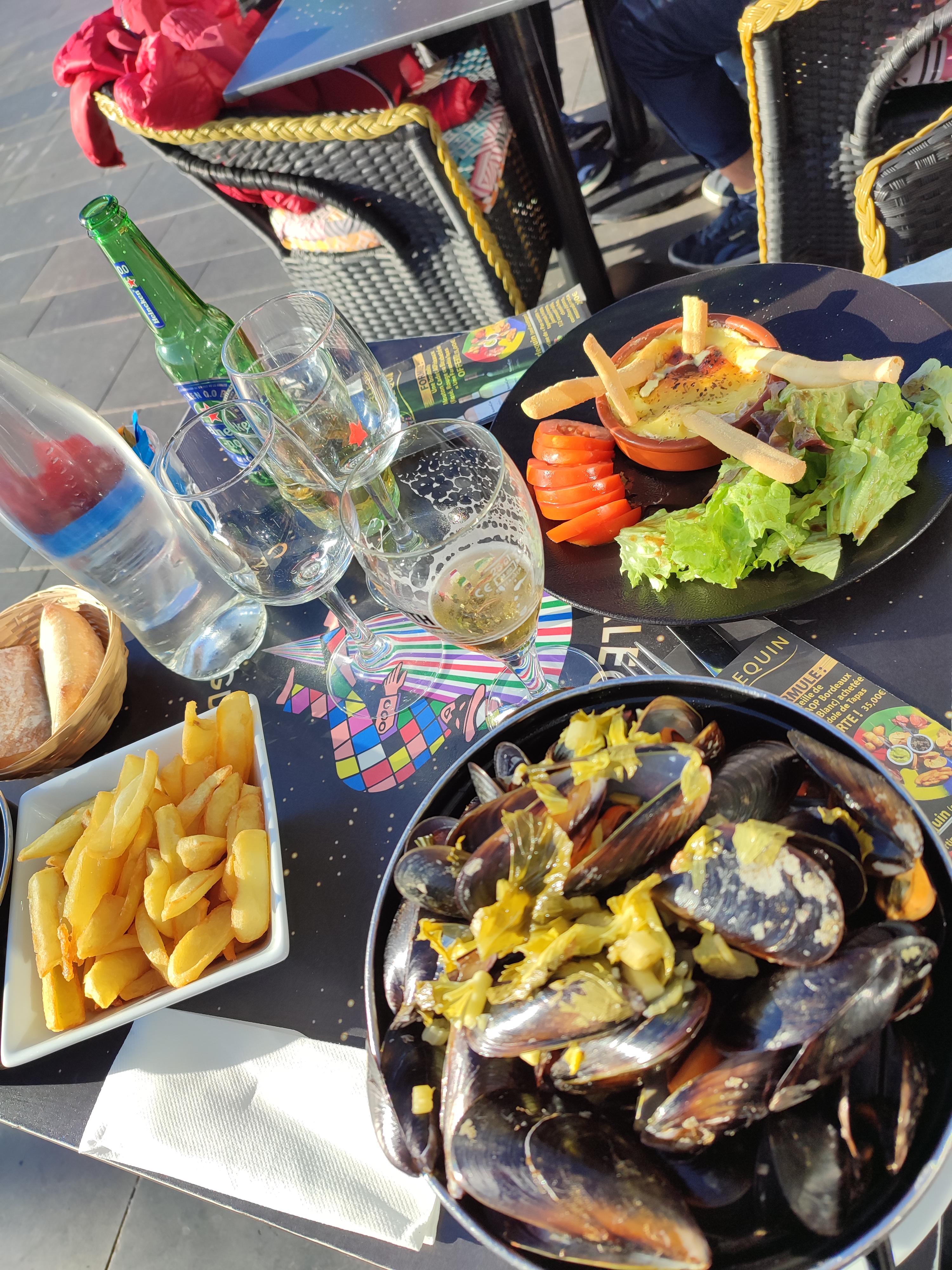 Patron bien lourdingue avec ses blagues Service à revoir très long !!!! Serveurs pas aimables ! Moules frites sans plus Frites pas très fraîches Camembert rôti tres bon