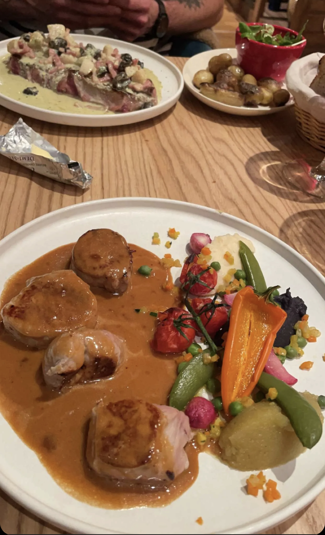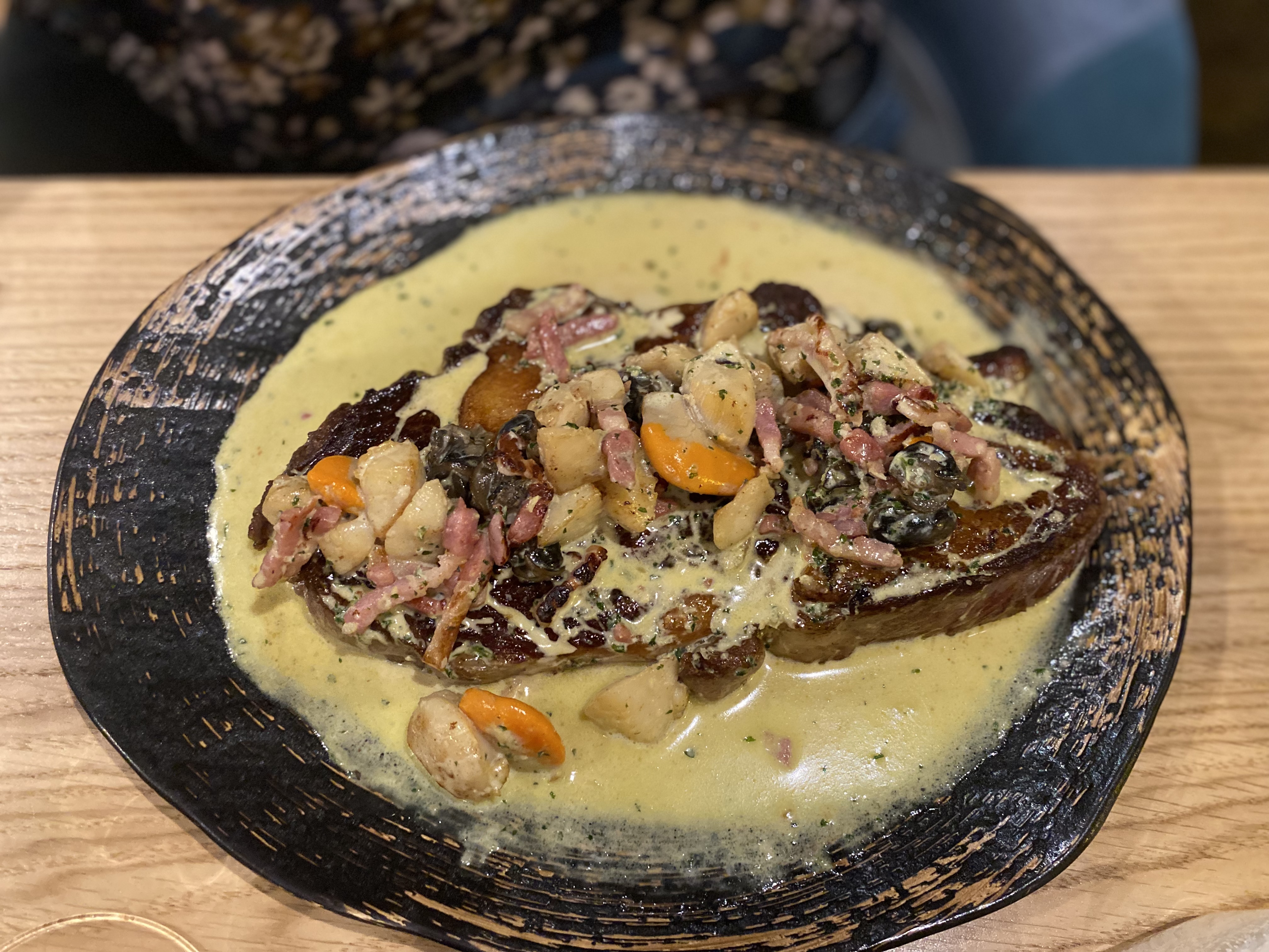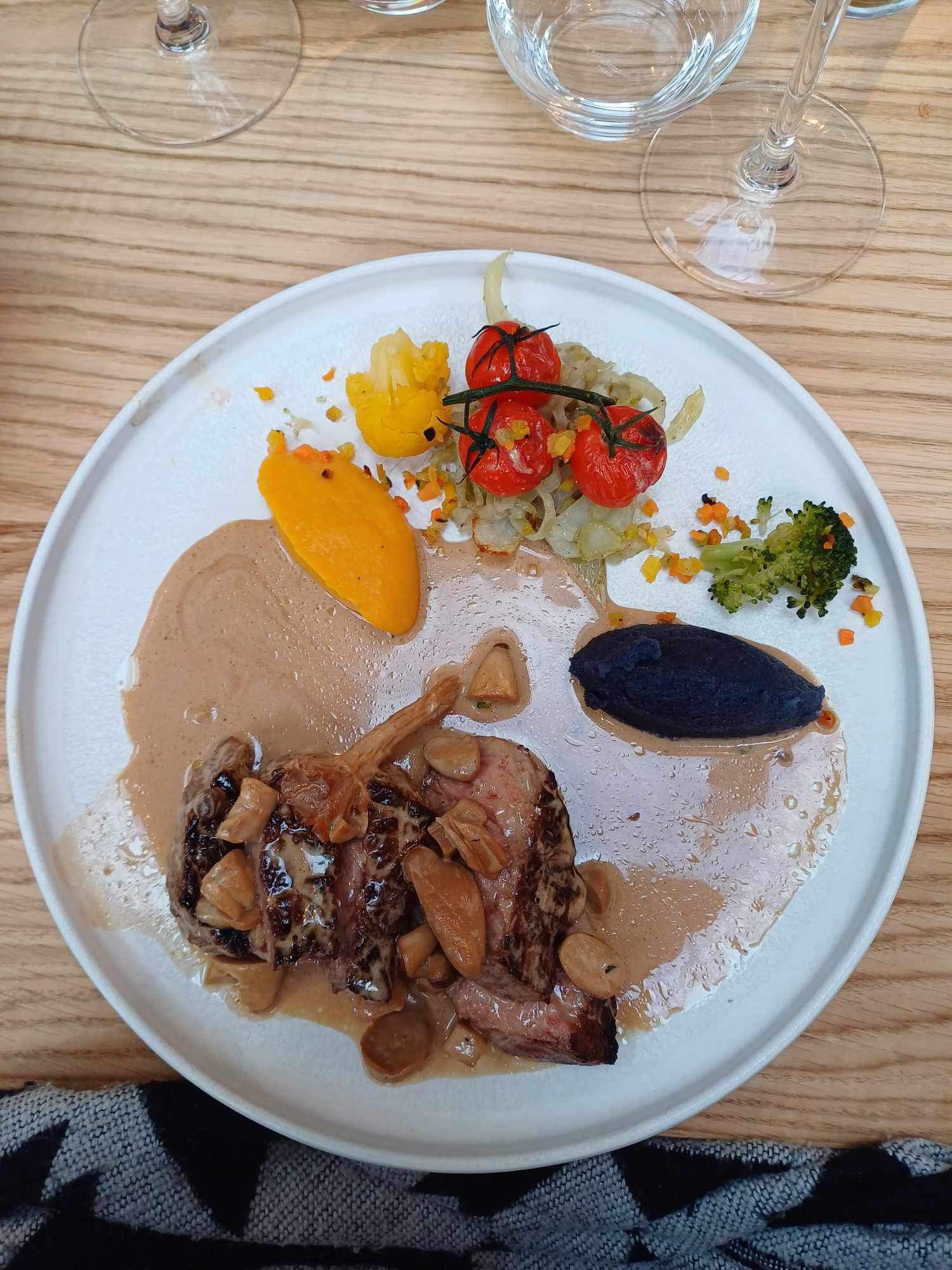 Nous avons pris en entrées cassolette de Saint-Jaques-lardon-poireaux-crème qui était fantastique. En plats ma conjointe a pris le filet mignon sauce caramel beurre salé « la viande cuite à la perfection tendre à souhait et cette sauce merveilleuse sucré salé ». Quant à moi, une entrecôte Saint-Jacques-lardons escargot-crème et beurre persillé. La viande était super tendre et le le combo terre/mer était fou. On a pris qu’un seul dessert à deux car on était rassasiés. Juste par gourmandise quoi. Le dessert du moment tarte au citron déstructurée que je recommande vivement. Une impression de gastro mais vraiment généreux en quantités ! À refaire !!