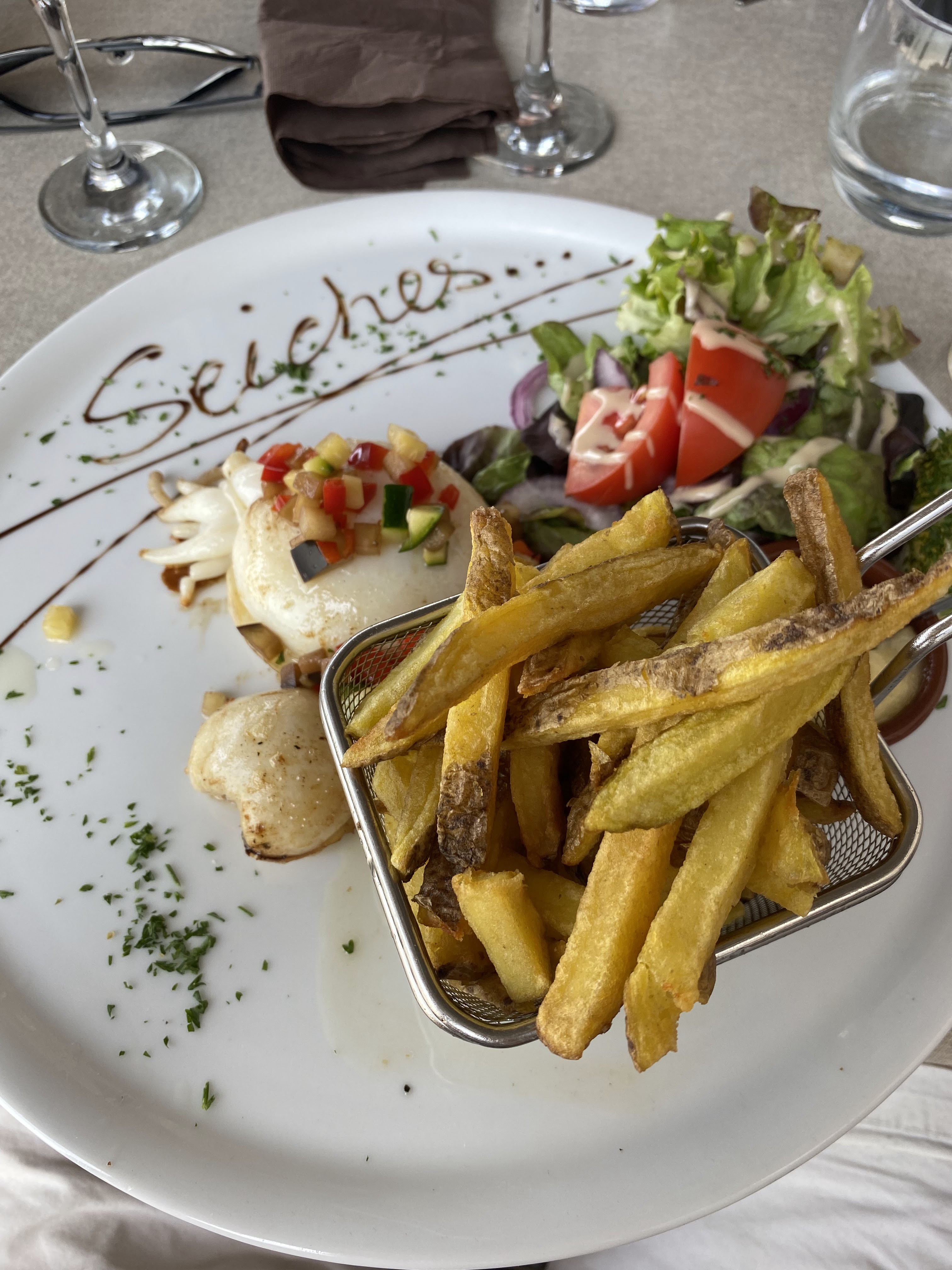 Très bon repas, c'est copieux, joli et bon. Salade de chevres en entrée et saumon en plat , le saumon qui était un peu gras, mais qui fait caler 😅 Les frites sont maison , et hyper bonne !