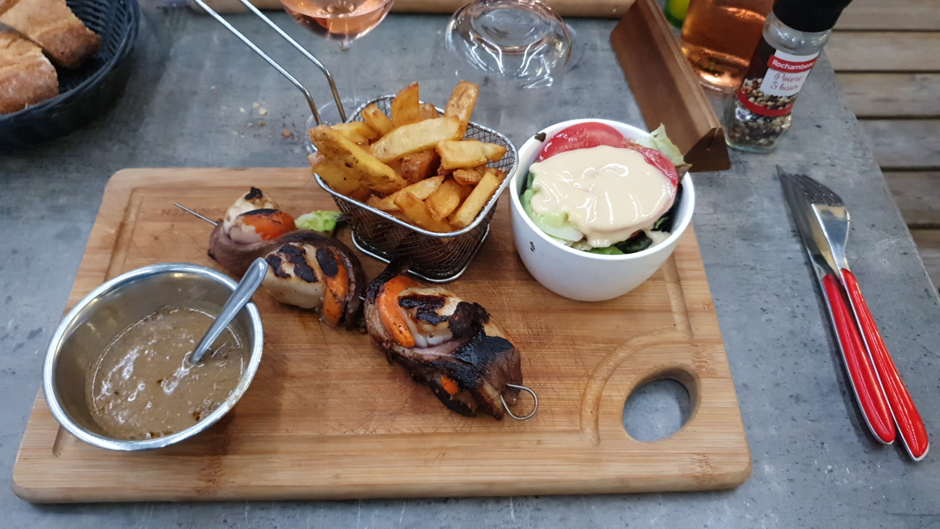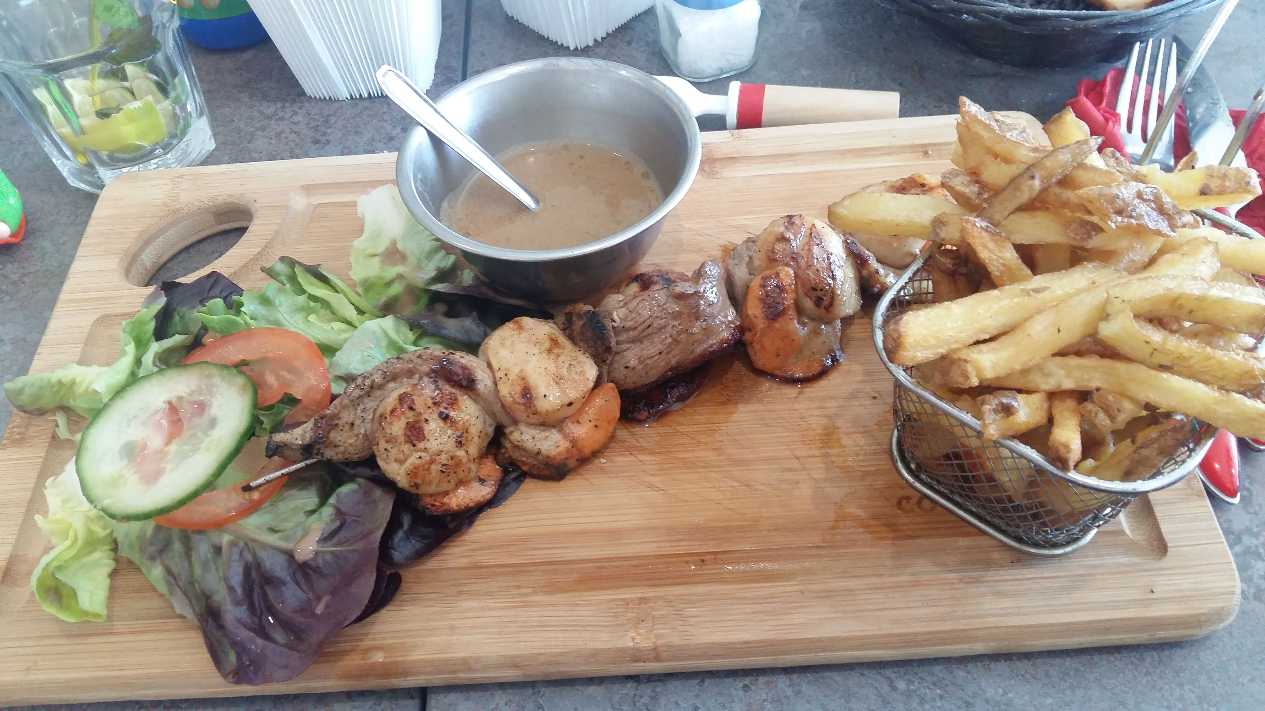 Réservé pour 19h. Le restaurant ouvre à 18h30 mais quand on arrive, le service n'est pas prêt Le personnel finit le nettoyage de la salle. Pas d'excuses ni proposition d'offrir un verre pour patienter. Repas décevant que se soit le menu à 22e ou 32e. Viande trop cuite, frites avec fort goût d'huile, brochette canard et St Jacques trop ou pas assez cuit, les 2 produits ne vont pas ensembles. Foie gras bon. Rapport qualité prix à revoir. Nous ne renouvelerons pas l'expérience.