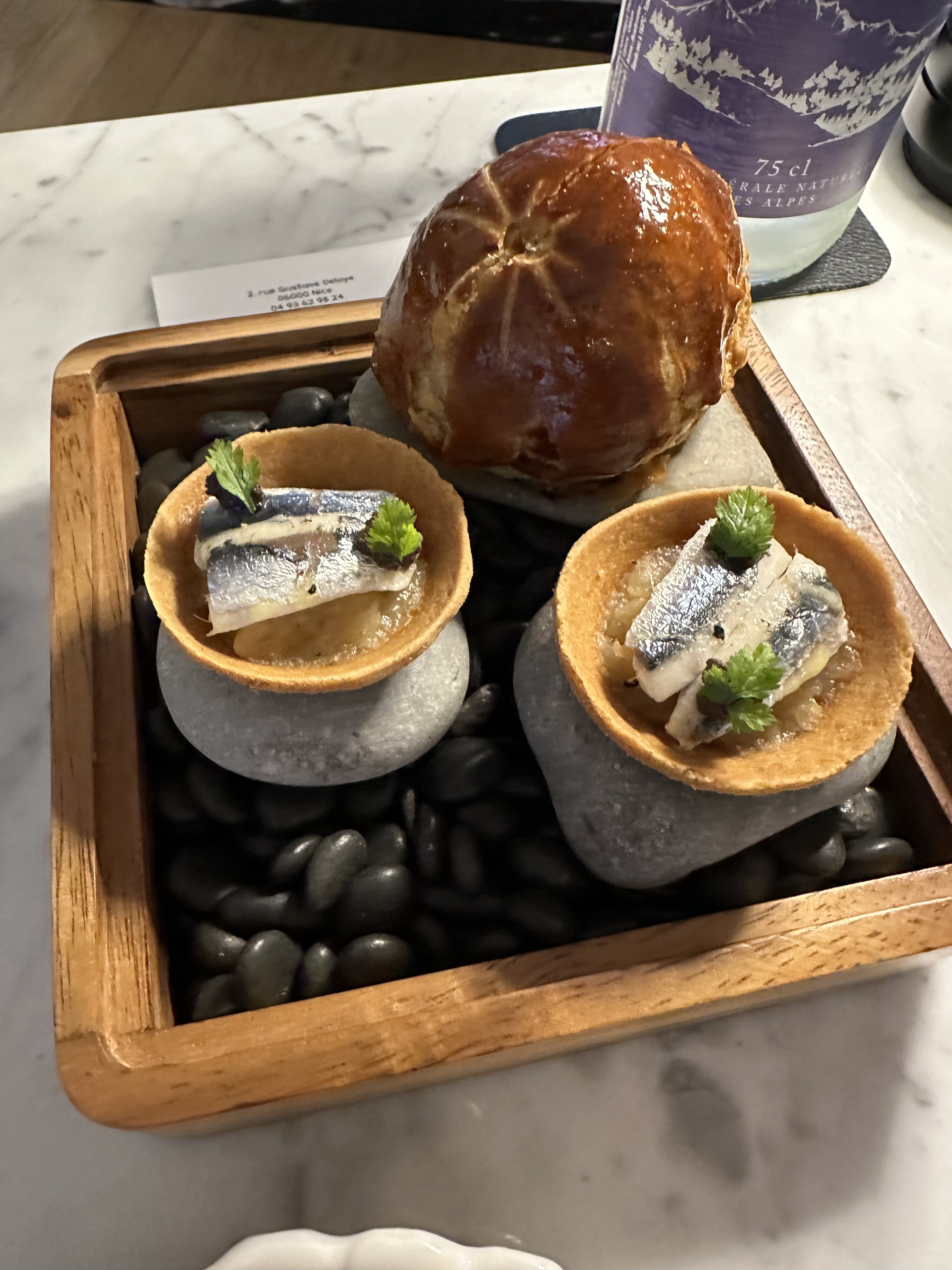 Très beau et bon restaurant a Nice. Dès la mise en bouche, petit voyage dans les saveurs niçoises de manière revisitée. Les pains faits maison sont également délicieux. Très belle et complète carte de vins. Un vrai plaisir et l'ensemble de l'équipe - dont la cuisine ouverte sur la salle - fait en sorte que l'on profite au maximum de ce moment.