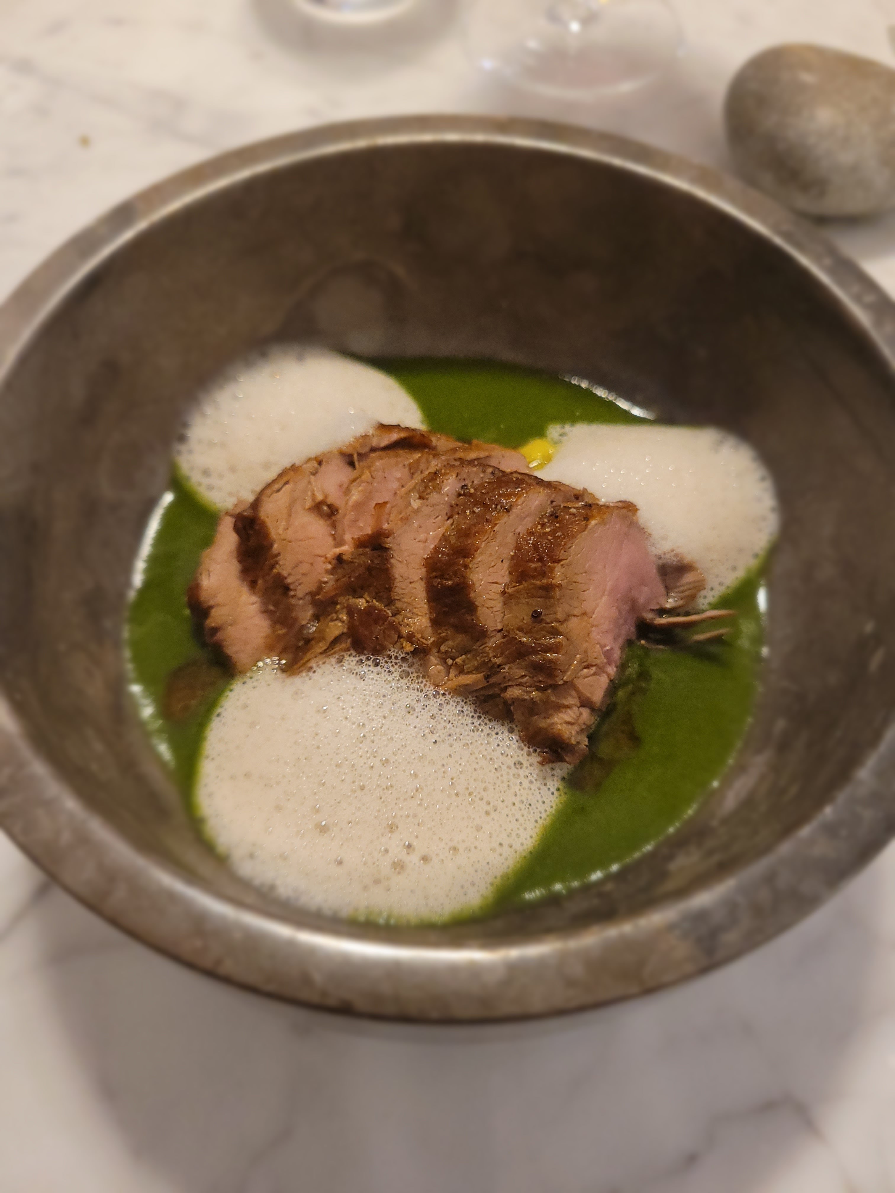 Délicieuse soirée! Avec une vue directe sur la cuisine, où le chef opère dans une concentration absolue, comme s'il observait un rituel. Le résultat se retrouve dans l'assiette : créatif, subtil, esthétique et ..... savoureux! Merci aussi à la qualité de l'accueil, manifestement intime avec tout ce qui est proposé! Quant à l'espace, c'est un très bel écrin pour recevoir le joyau d'une belle soirée!