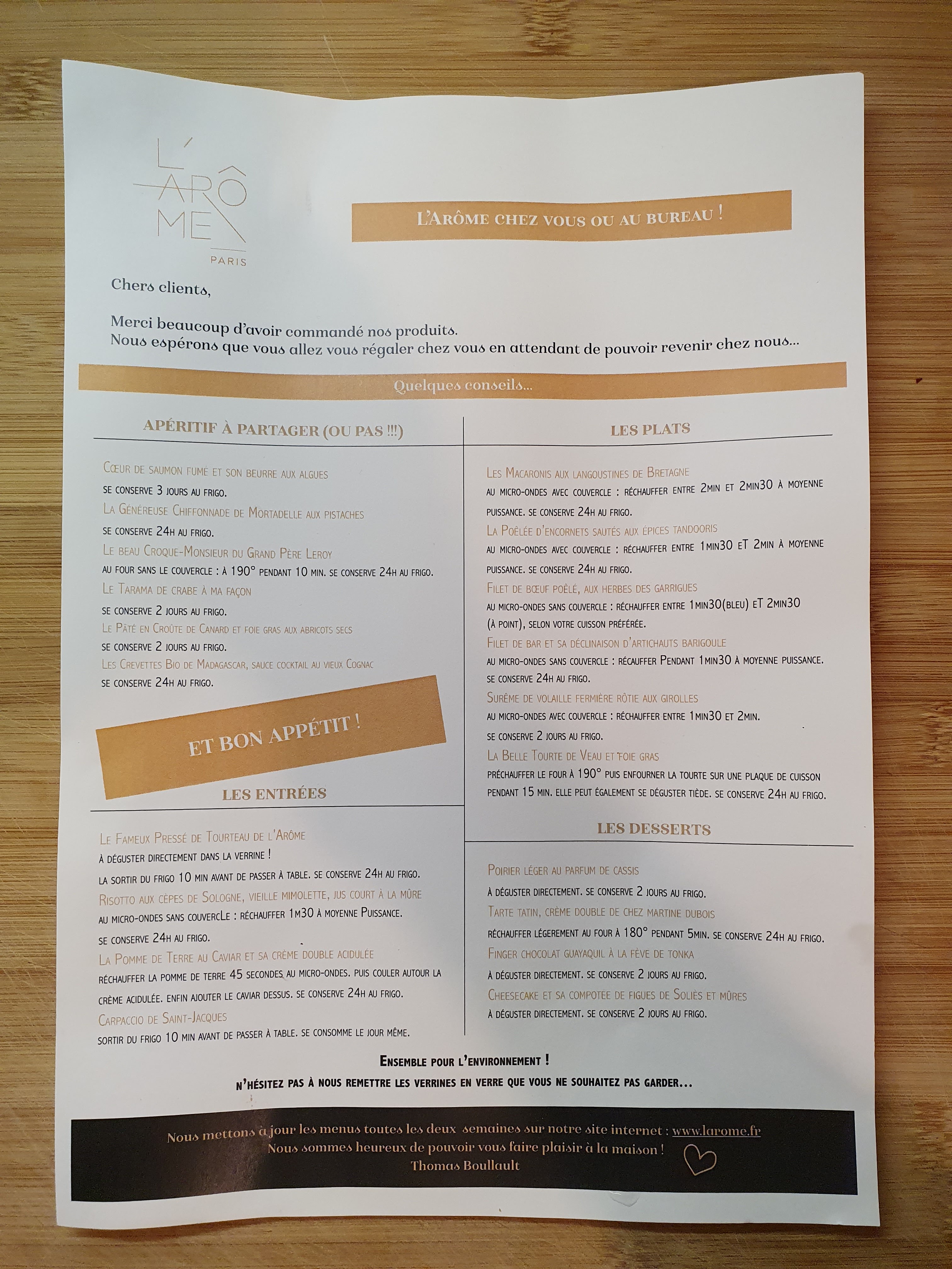 Magnifique expérience de l’Arome à emporter, testé deux fois de suite cette semaine de Janvier 2021 ! Je vous conseille vivement le pressé de tourteau en entrée et les saint jacques aux truffes et frégola sarda, un plat remarquablement réussi ! Contenants impeccables et idéaux pour réchauffer au bureau, vrais couverts en dur et pain délicieux dans les sacs... le Chef a pensé à tout, on mange du vrai étoilé au bureau ! Service de livraison ponctuel et efficace, rien à redire, que du bonheur !