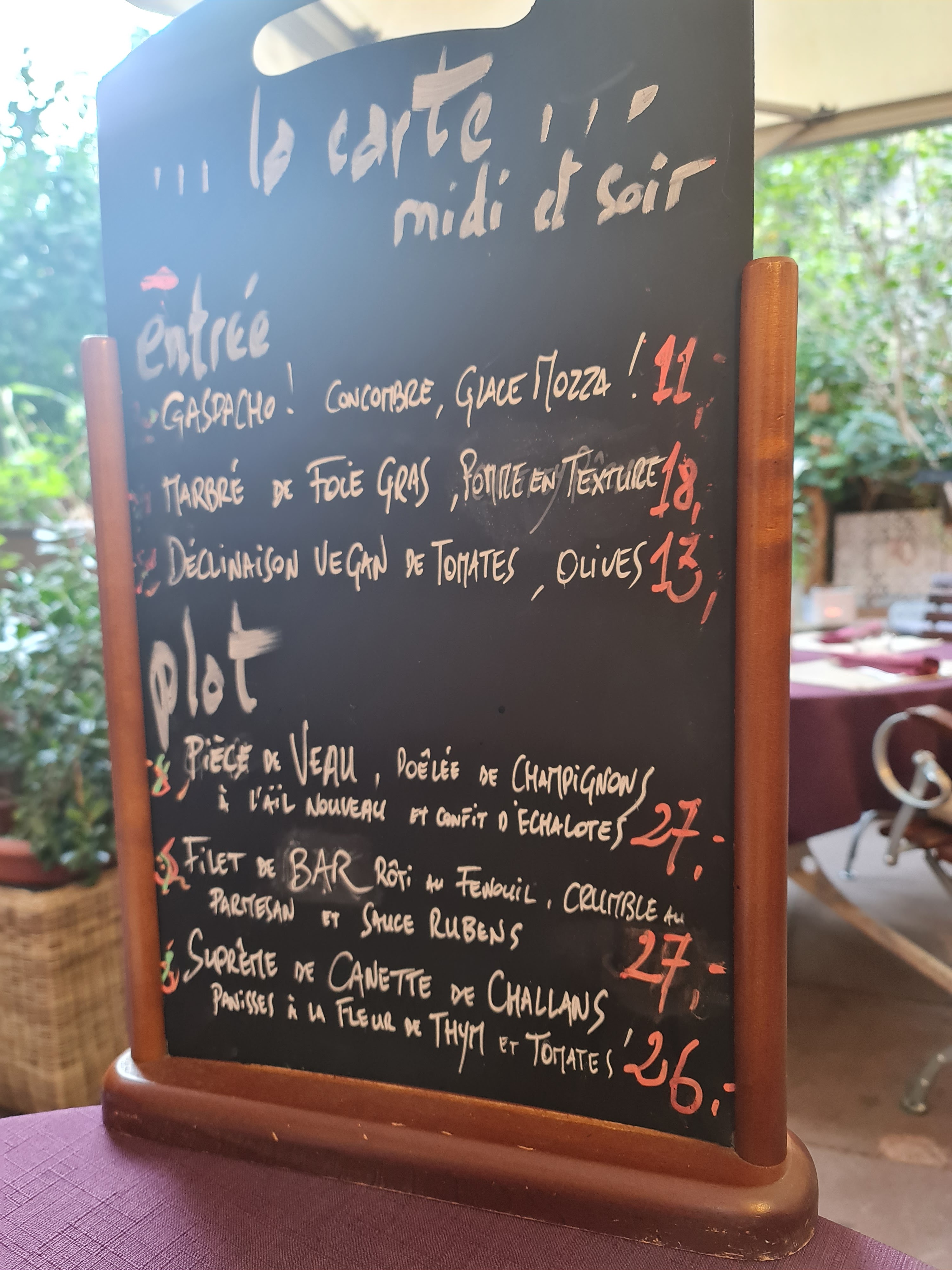 La terrasse est très agréable. Nous avons pris un menu du jour. Dommage que le choix des plats est entre végétarien et poisson. Nous aurions aimé de la viande. Rapport qualité prix correct. Les plats sont bien présentés et très bons. Service peut être un peu long mais très sympathique. Resto à recommander.