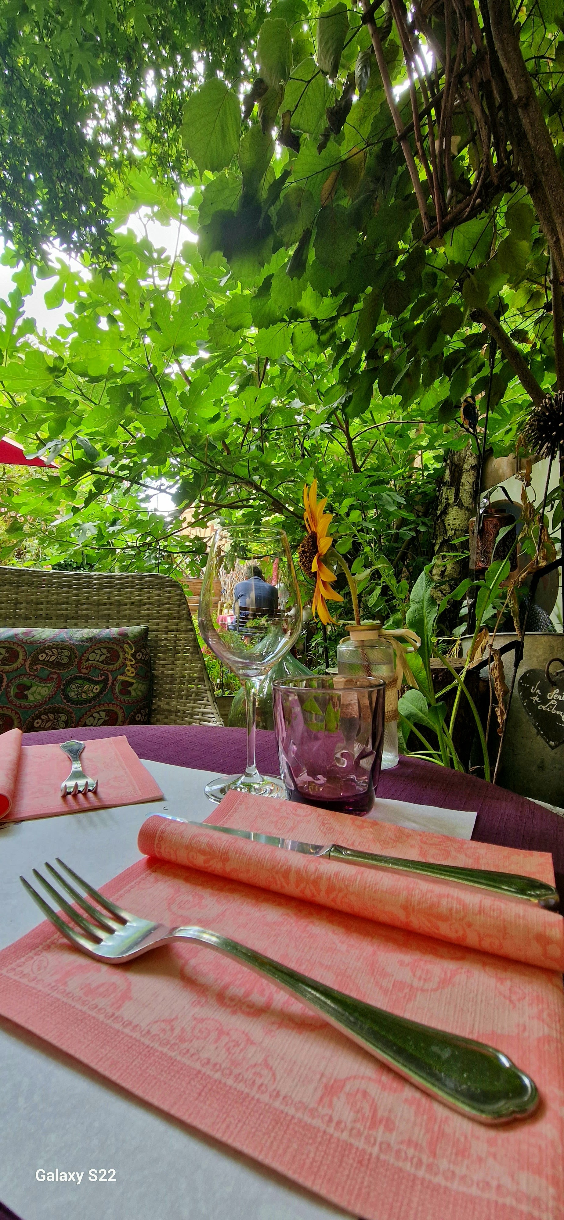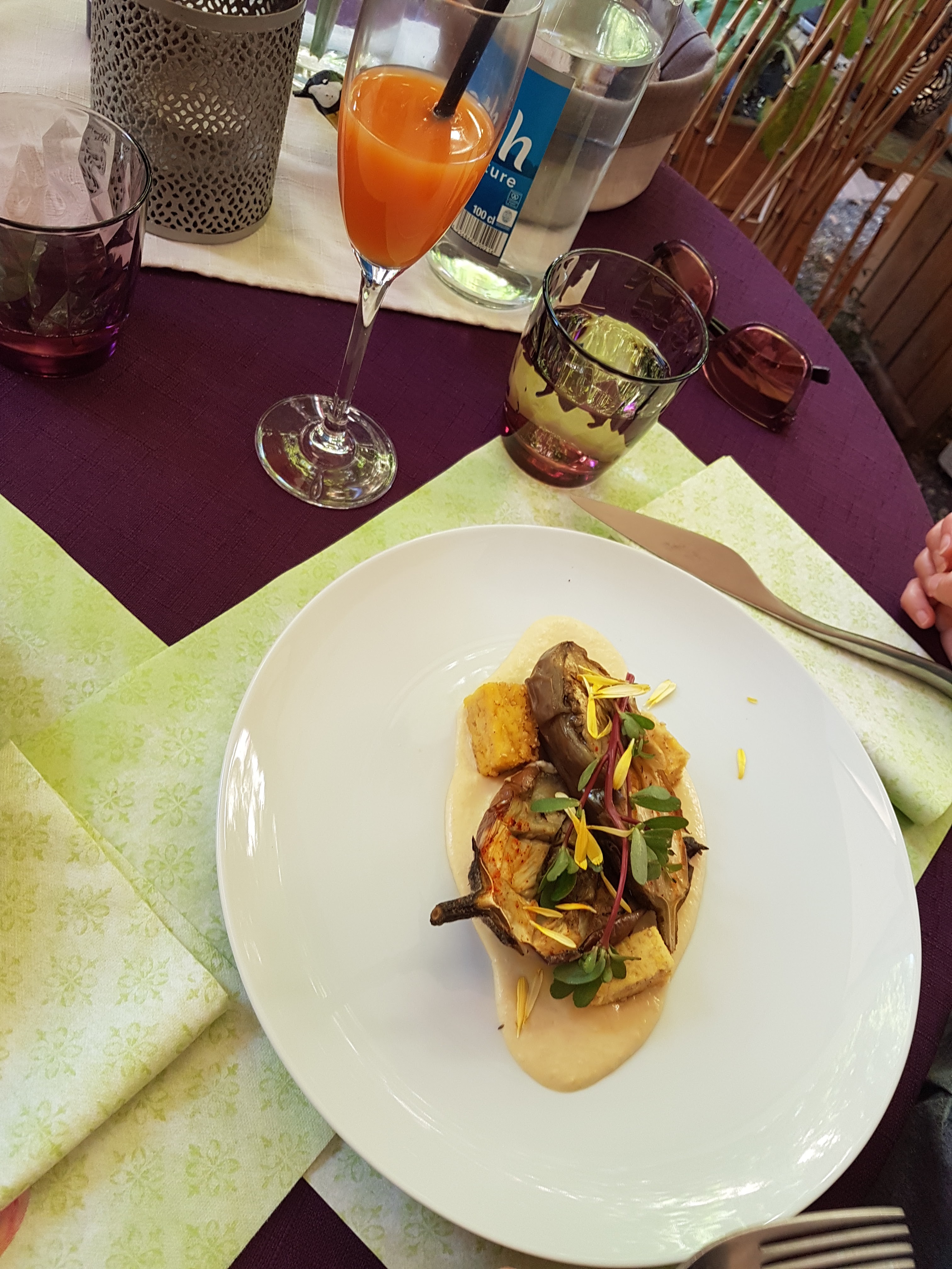 Bel emplacement dans le jardin arrière. La nourriture était également délicieuse, mais malheureusement, l'entrée végétarienne contenait du poisson, alors mon mari l'a mangé. Le plat principal était composé de seulement 2 tranches d'aubergines et de deux tomates cocktail. Beaucoup trop peu pour moi, quand j'ai quitté le restaurant, j'ai vite eu à nouveau faim.