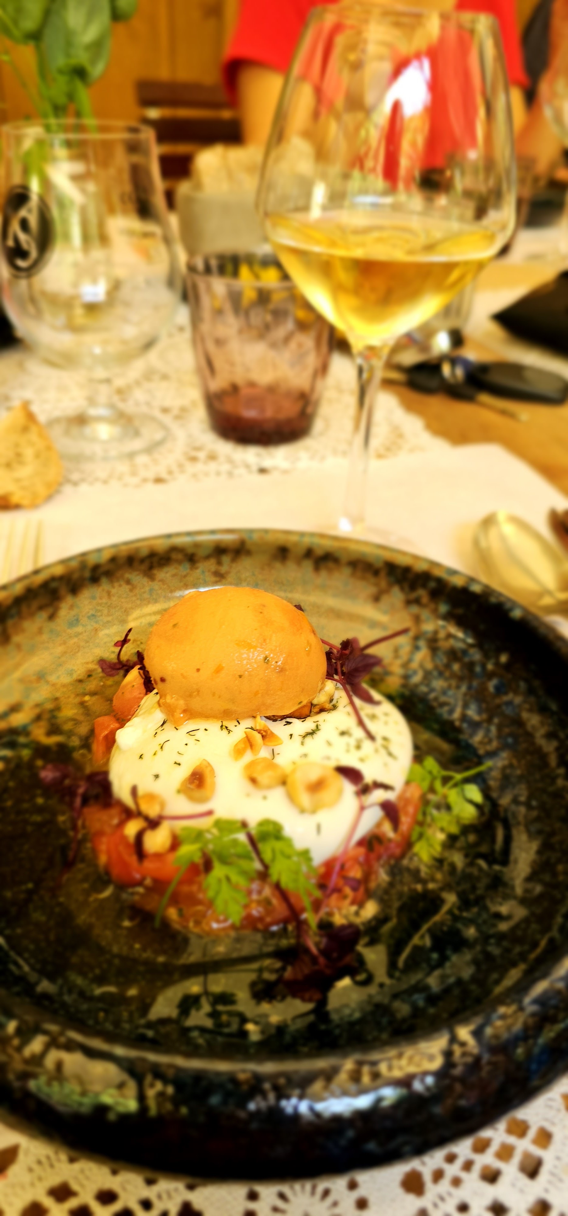 Restaurant très sympa, un peu caché. Si vous recherchez de la bonne nourriture et de l'ambiance, vous la trouverez. Nous y étions tous les deux à l'heure du déjeuner. Toutes les tables étaient occupées, nous avions réservé - sans cela, nous ne pourrions pas le faire. Personnel très sympathique et attentionné. Nous élaborons notre propre menu pour le déjeuner. Un menu était également disponible. Les plats sont tous préparés avec des idées, de l'imagination et du savoir-faire. Les entrées qui nous ont marqué étaient la burrata sur des dés de tomates, avec de la glace et des noix... les saveurs étaient très bien développées - un régal pour le palais, tout comme les courgettes avec une purée de tomates et d'autres ingrédients, des noix ici aussi. et aussi un délice pour le palais. Le tout à des prix assez modérés. Notre recommandation : réserver et déguster.