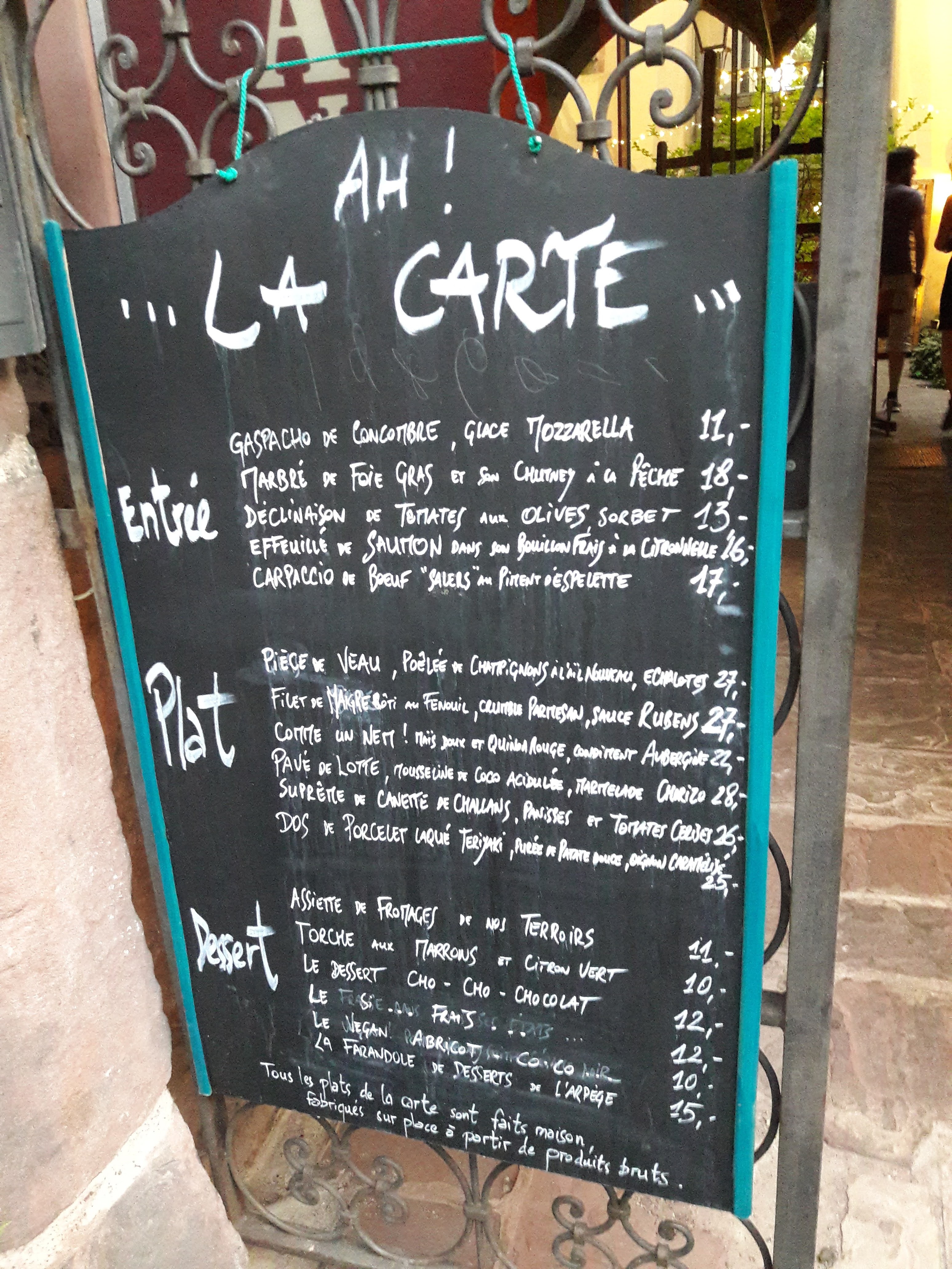 Une adresse où il ne faut surtout pas hésiter à s’arrêter ! Sur le chemin du retour, ma belle-mère et moi voulions se restaurer, on s’est dit : « Allons à Colmar ». Une fois arrivé, nous avons visiter la ville tout en cherchant un restaurant. Quand nos regards sont tombés sur le devanture du restaurant « L’arpège », notre curiosité a pris le dessus pour y voir de plus près. La cour extérieur est magnifique, l’intérieur étant complet, nous avons déjeunés sur la terrasse qui est un vrai petit cocon. Le cadre vous fait voyager ainsi que les plats. Nous avons pris le menu du jour : entrée, plat, dessert (choix entre un menu végétarien ou un menu poisson). La qualité et la quantité sont exquises, on voit le cuisinier est passionné par son métier. Il y met tout son cœur dans sa cuisine. Les serveurs sont d’une gentillesse et très serviables, si vous avez un doute sur la composition d’un plat : appelez Grégoire, il connaît tout sur les plats 😉