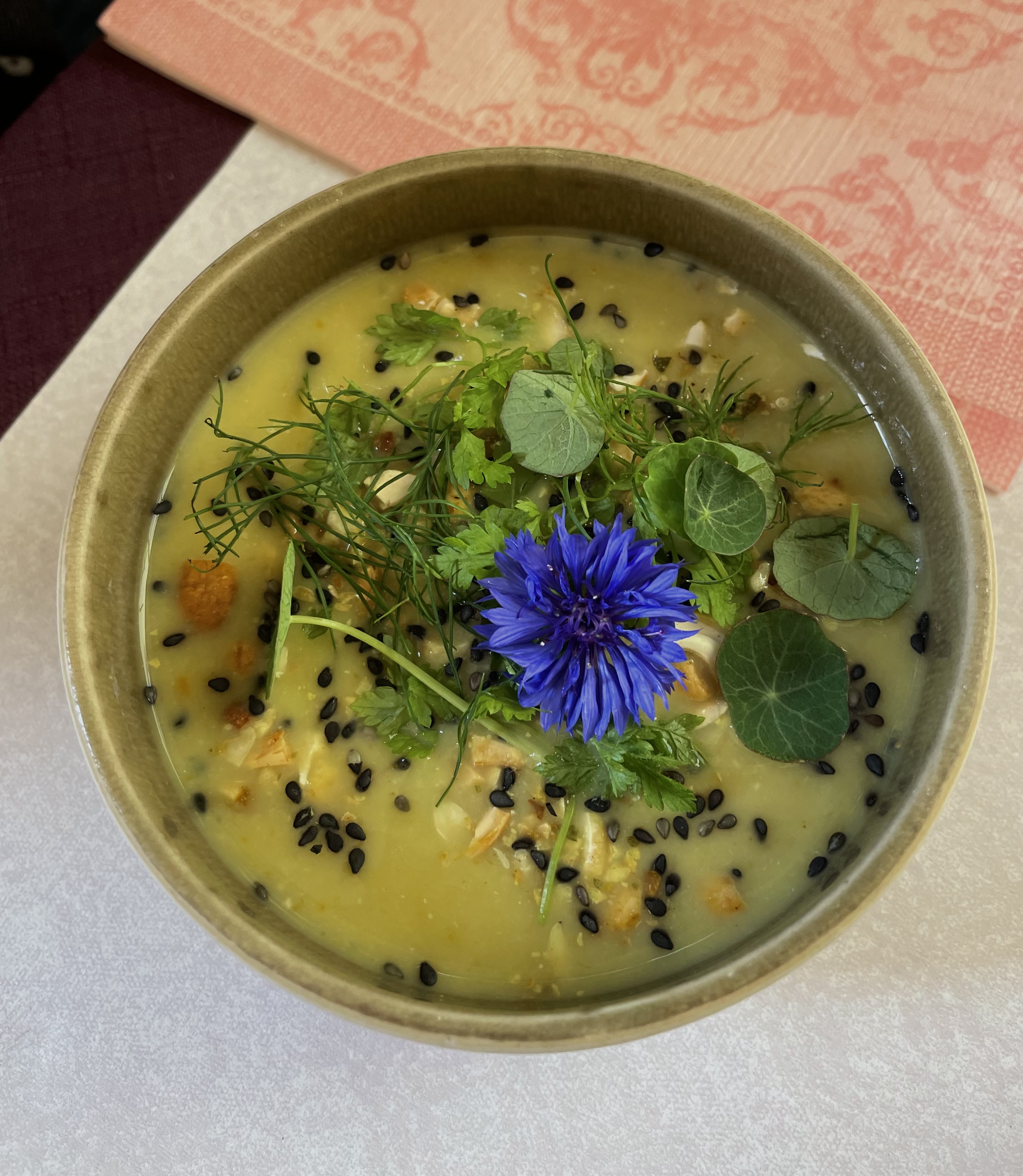 Excellente cuisine. Nous avons eu des options végétariennes très imaginatives et extrêmement savoureuses. Le personnel est super sympa, explique tout avec patience et compétence. Le jardin est un endroit charmant pour savourer un repas aussi délicieux.
