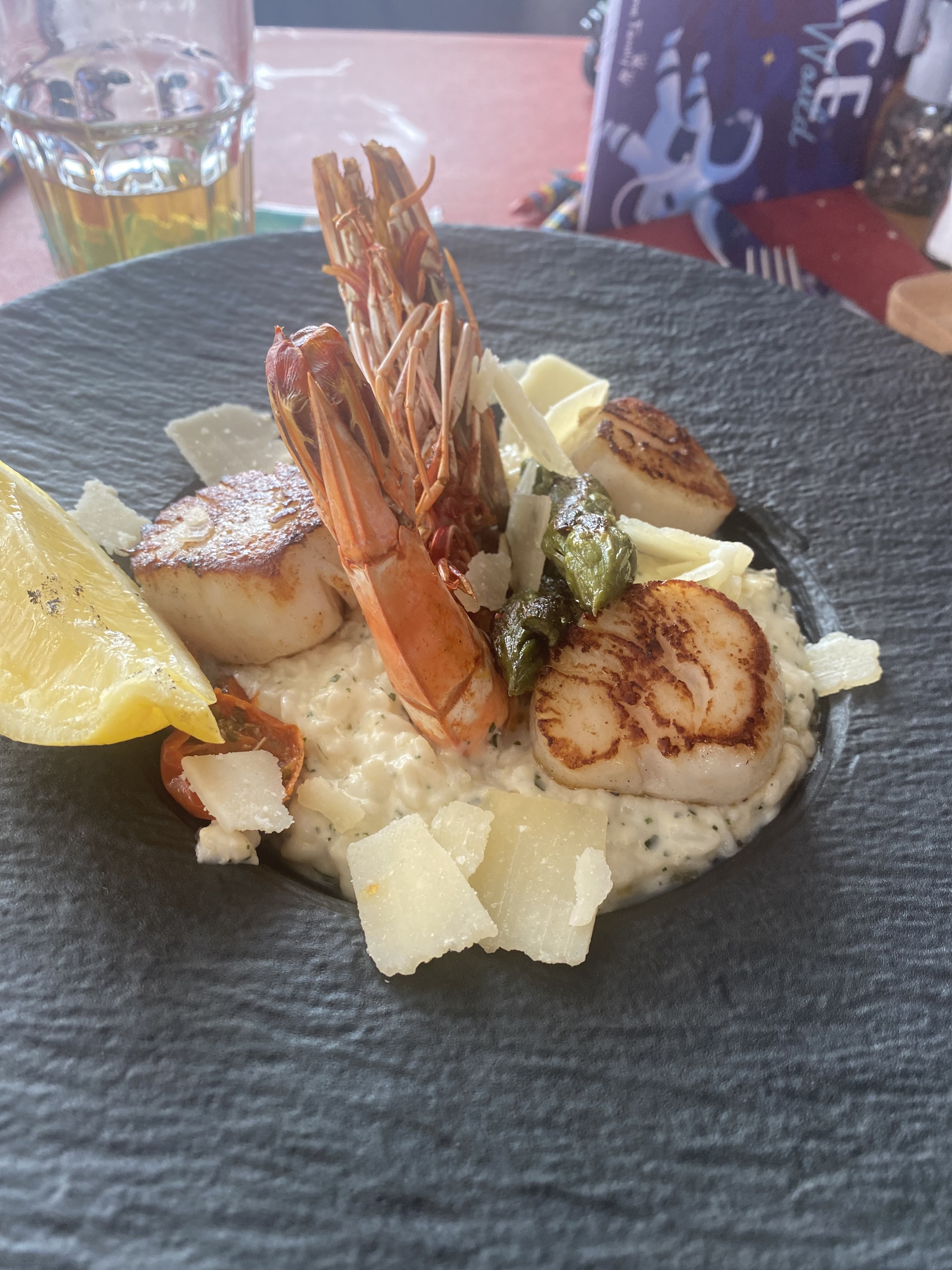 Nous avons extrêmement bien mangé, je recommande sans hésitation, si vous souhaitez bien mangé dans un joli cadre et être bien accueilli, c’est ici. Risotto de saint Jacques et gambas excellent 👌. Le burger était également très bon et copieux, le pain est au graines ce qui change un peu du classique. Merci pour l’accueil et le service 😊