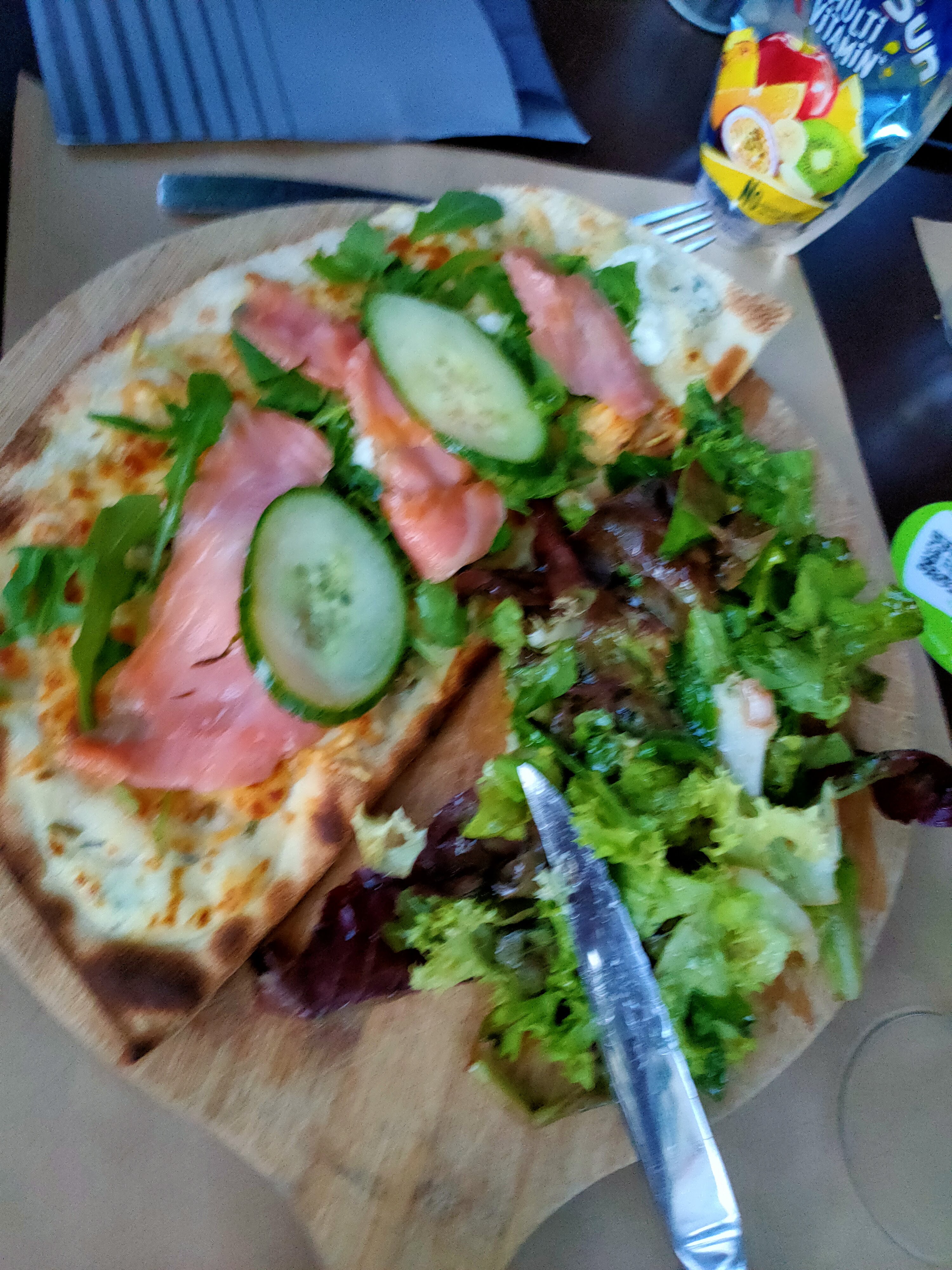 Mis à part notre serveur qui était vraiment sympathique,souriant et très disponible, je n'ai jamais mangé une pizza aussi immonde que celle qu'on m'a servie. Je m'explique : pâte bien trop fine et trop cuite car elle ne croustille pas mais CASSE sous les dents. Ma pizza avait une base crème et celle ci était tellement cuite que la crème s'était ÉVAPORÉE!!! Le saumon de ma pizza a été déposé dessus APRÈS que ma pizza a été cuite . C'était décevant, surtout quand on ne s'y attend pas ...! Pour couronner le tout, j'ai eu droit, en guise de déco j'imagine, à 4 rondelles de concombres trop épaisses et qui n'étaient pas proposées dans le descriptif de la pizza. Bref, 14 euros ma pizza.... Je suppose que j'ai payé l' emplacement du resto.... Autant dire que je me suis fait VOLER. Manque de pot pour nous, nous avions réservé pour 7 personnes. C'était cher payé JE NE CONSEILLE PAS DU TOUT CE RESTAURANT