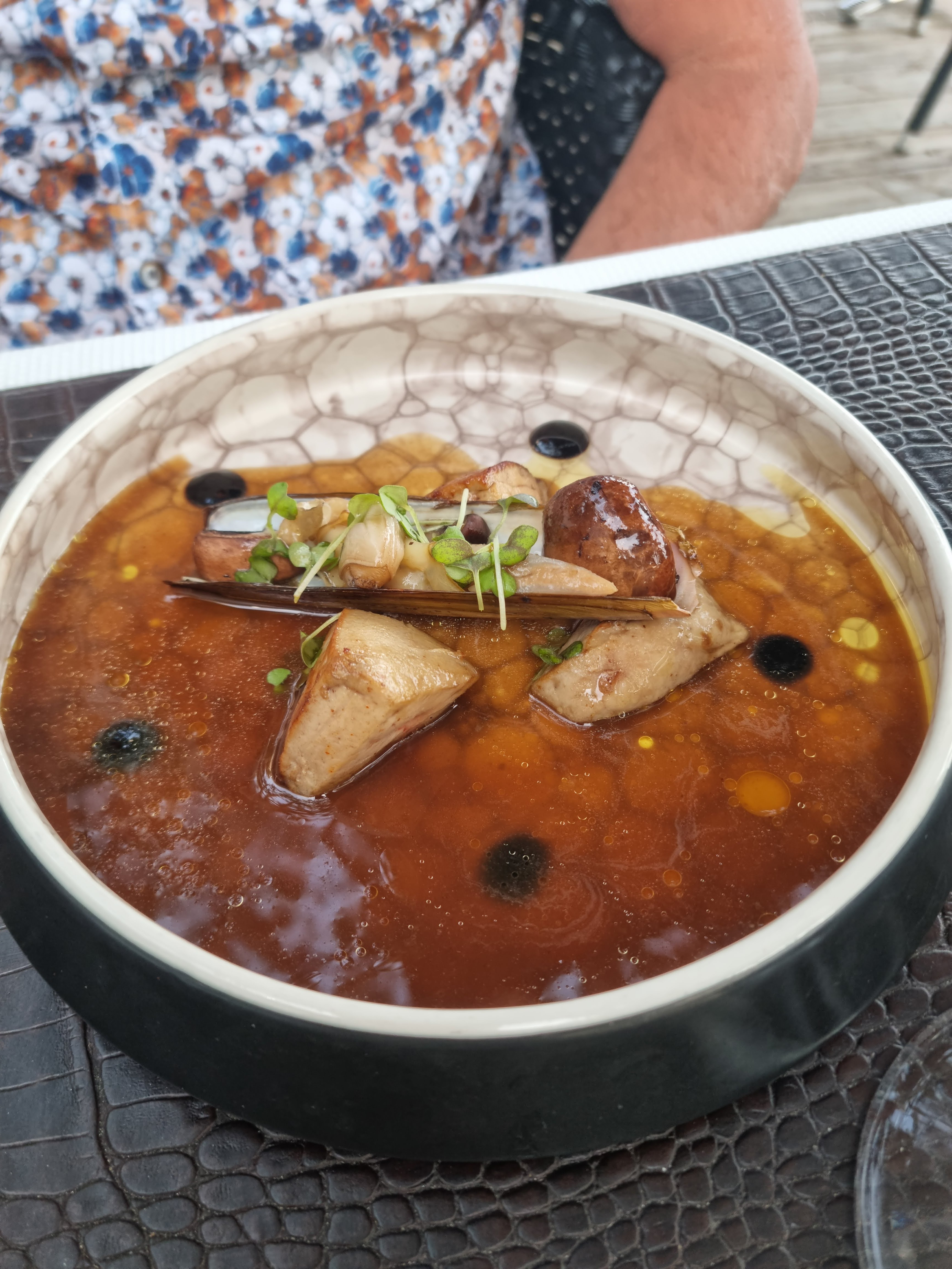 Cuisine originale Foie gras poché dans un bouillon de canard façon Dashi, excellent Épaule confite en tournedos, jus infusé au sumac, cuisson parfaite, goût excellent Vrai restaurant bistronomique