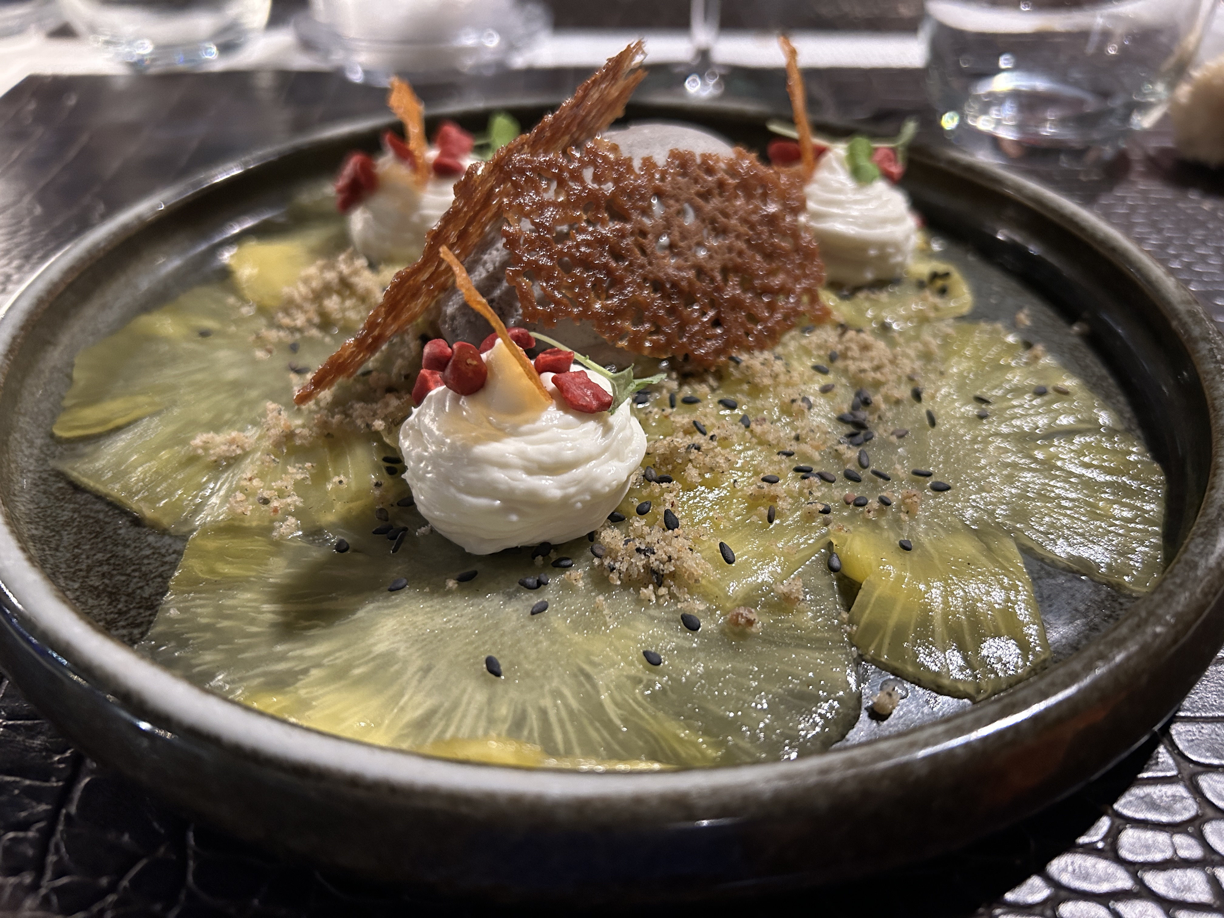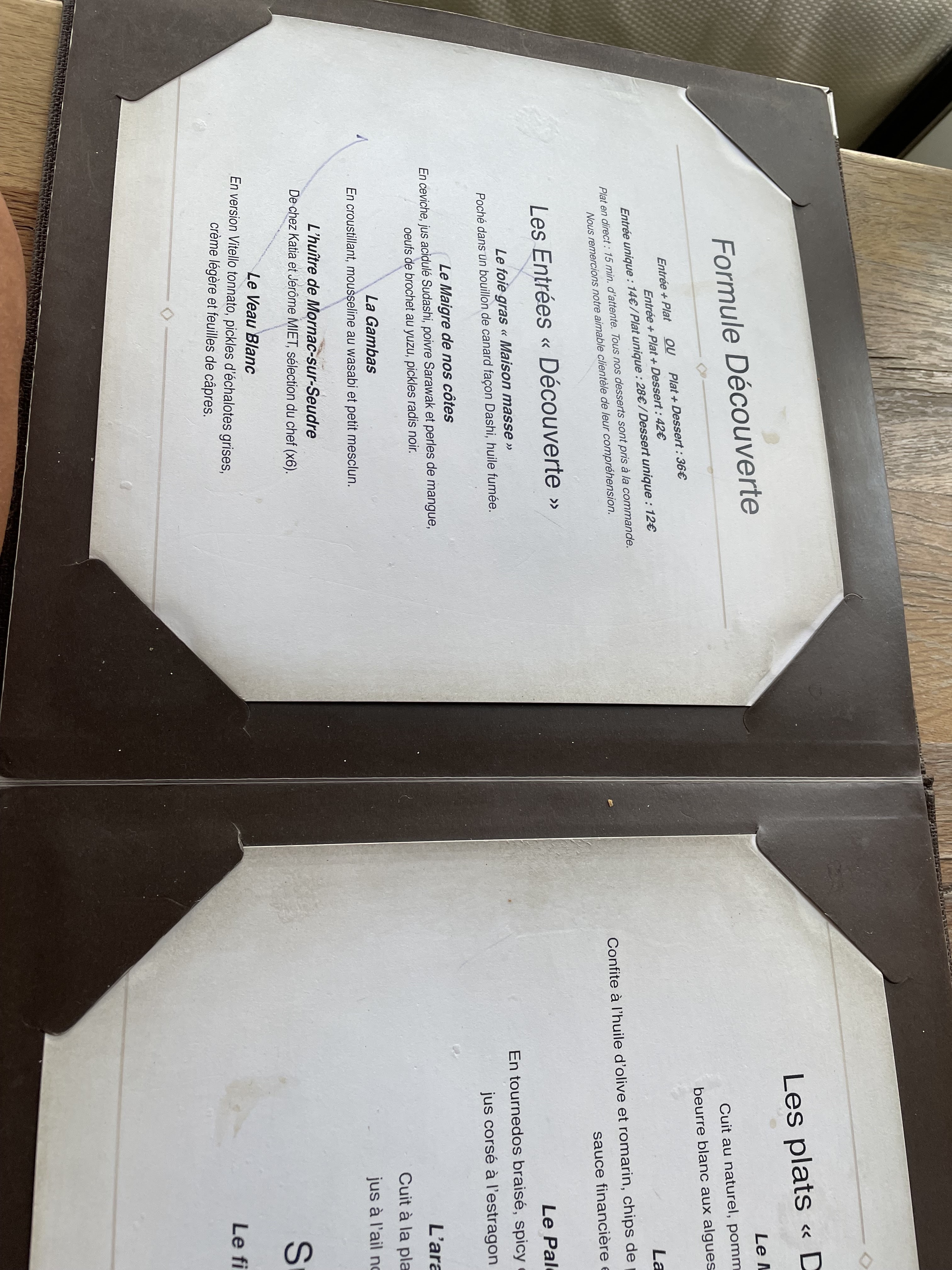 Carte sans grands choix, mélanges de saveurs qui laisse à désirer...( très très spéciale) Nous étions 6 nous avions pris les 4 choix de la carte et personne n'a aimé son entrée et son dessert... Seul le plat était bon mais les quantités dans les assiettes très limitent pour le prix... 410€ payé en ayant pratiquement rien aimé. .. Ça fait mal au cul. Donc si vous n'aimez pas les mélanges de saveurs très très spéciales ( ex: dessert au pignon de pin) n'allez pas vous y aventurer. Ou alors prenez le menu enfant copieux et esquis😂
