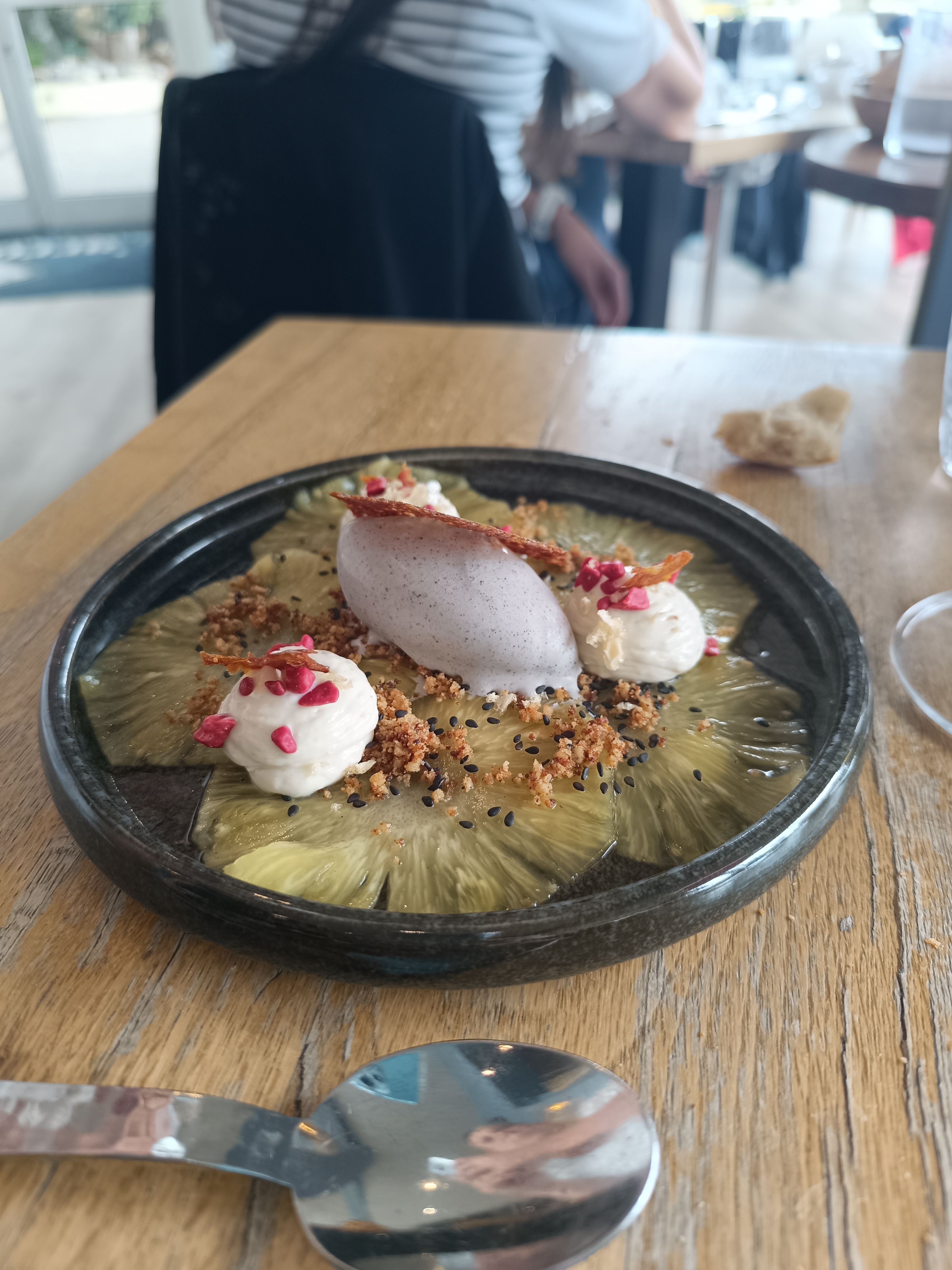 C'était ma deuxième visite dans ce restaurant. Bien qu'il soit satisfaisant, je pense que le rapport qualité-prix laisse à désirer, car je le trouve un peu onéreux. Néanmoins, la vue est absolument splendide, donnant sur la mer. Mon repas comprenait une entrée, un plat et un dessert. L'entrée était très bon, le plat était acceptable pas plus. Mon coup de cœur a été le dessert qui m'a agréablement surpris : des fines tranches d'ananas accompagnées d'une délicieuse glace au sésame noir. En résumé, je recommande vivement cet endroit malgré quelques réserves sur le prix.