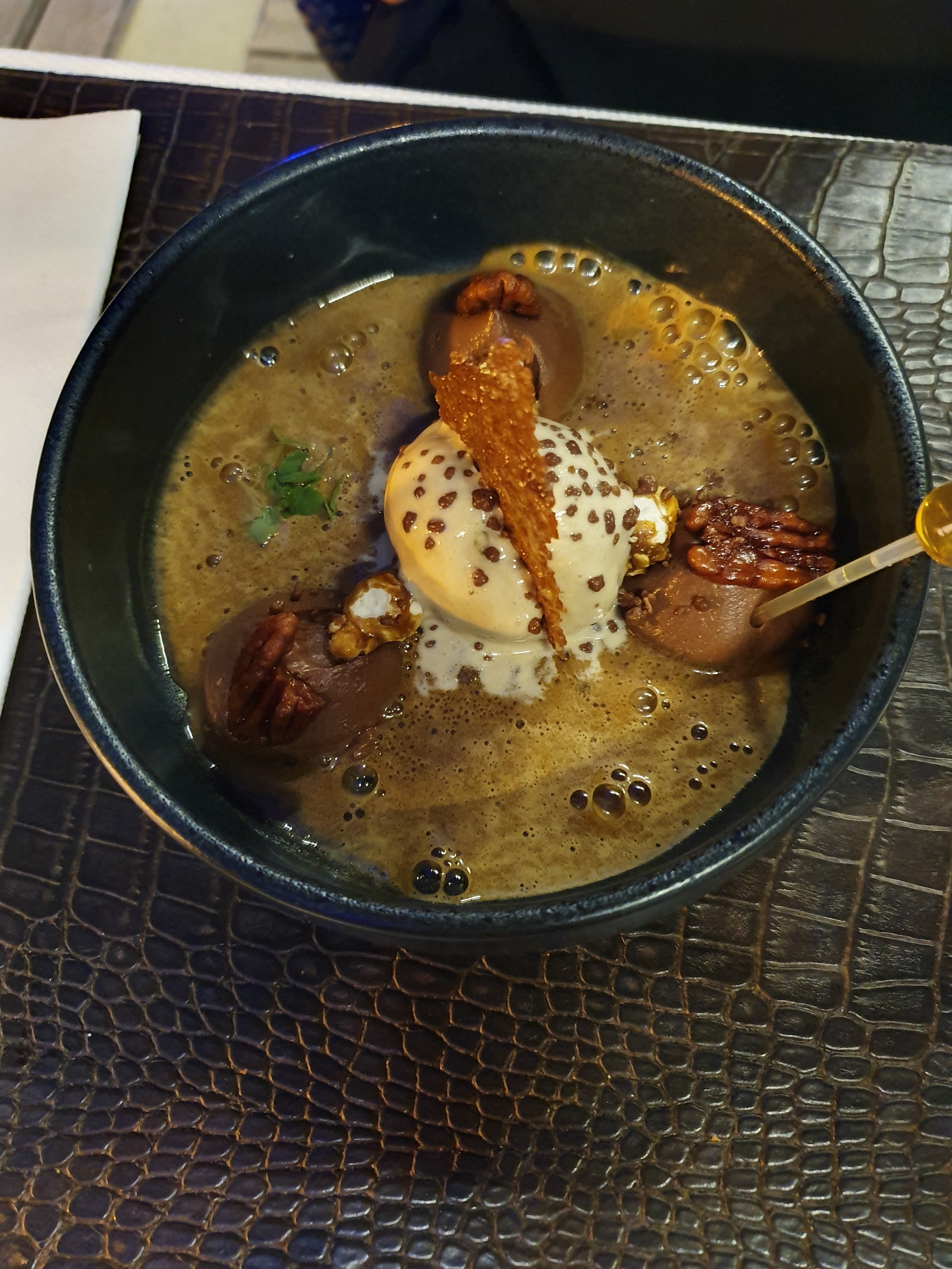 Le chef essaye d’associer saveurs et épices, c’est bon, bien entendu, mais je ne me suis pas régalé au sens propre du terme. Le carpaccio de saumon et le quasi de veau restent somme toute banal. La bonne surprise vient au dessert où on est vraiment « un cran » au dessus et qui est une réussite totale. En ce qui me concerne j’attend plus, au vu du prix, de ce genre d’établissement. Donc avis mitigé pour moi. Petites erreurs sur le service, oubli des vins au verre qui sont arrivés à la fin du plat principal, et lors du débarrassage de notre table par la serveuse, je me suis retrouvé avec une cuillère souillée sur le pantalon.