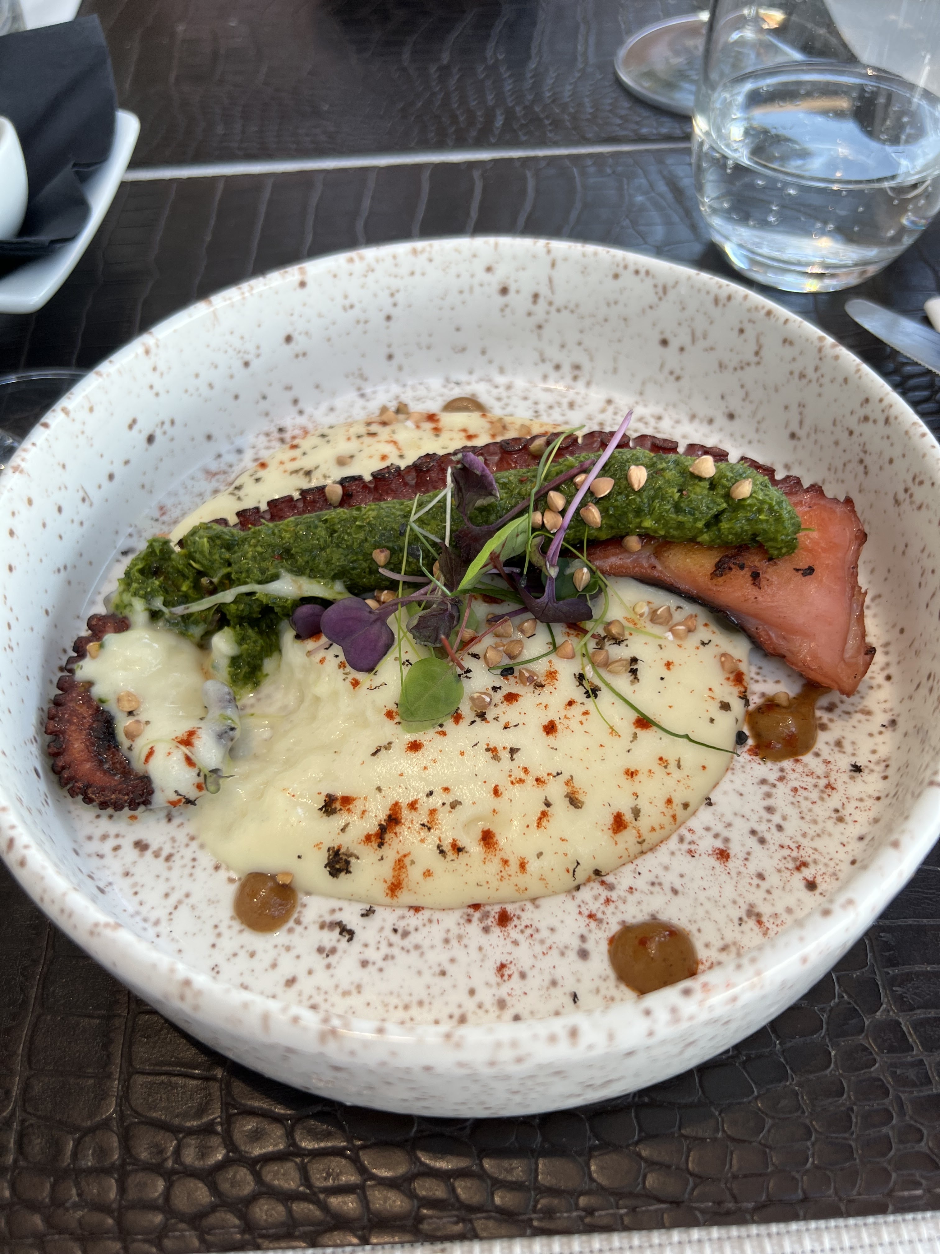 Lieu agréable avec une belle vue Dommage de nous refuser une table plutôt qu'une autre soit disant réserver alors qu elle est restée vide Merci au chef pour le repas très bon produit bien présenté pour l' épaule d' agneau confite un régale.attention le poulpe très bon mais que 2 petits bouts prévoir au moins 3 très bon dessert. Serveuse très agréable attention a prévoir de changer de verre au client pour chaque couleur.