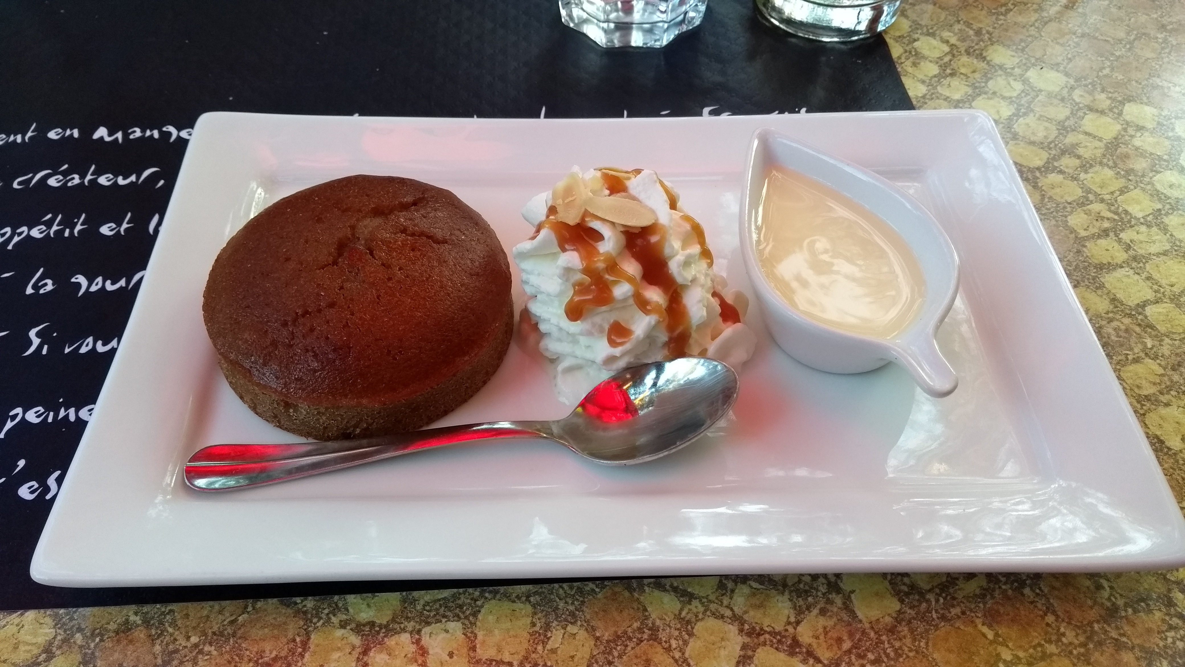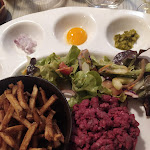 Le tartare à mon goût était parfait la viande annoncée d'Aubrac délicieuse tout y était condiment ,sauce ,et la quantité+++ Le désert délice a base de produit issu de la pomme je crois très bon ,personnellement j'aurai mis une génoise a la place du palet plus facile a manger .