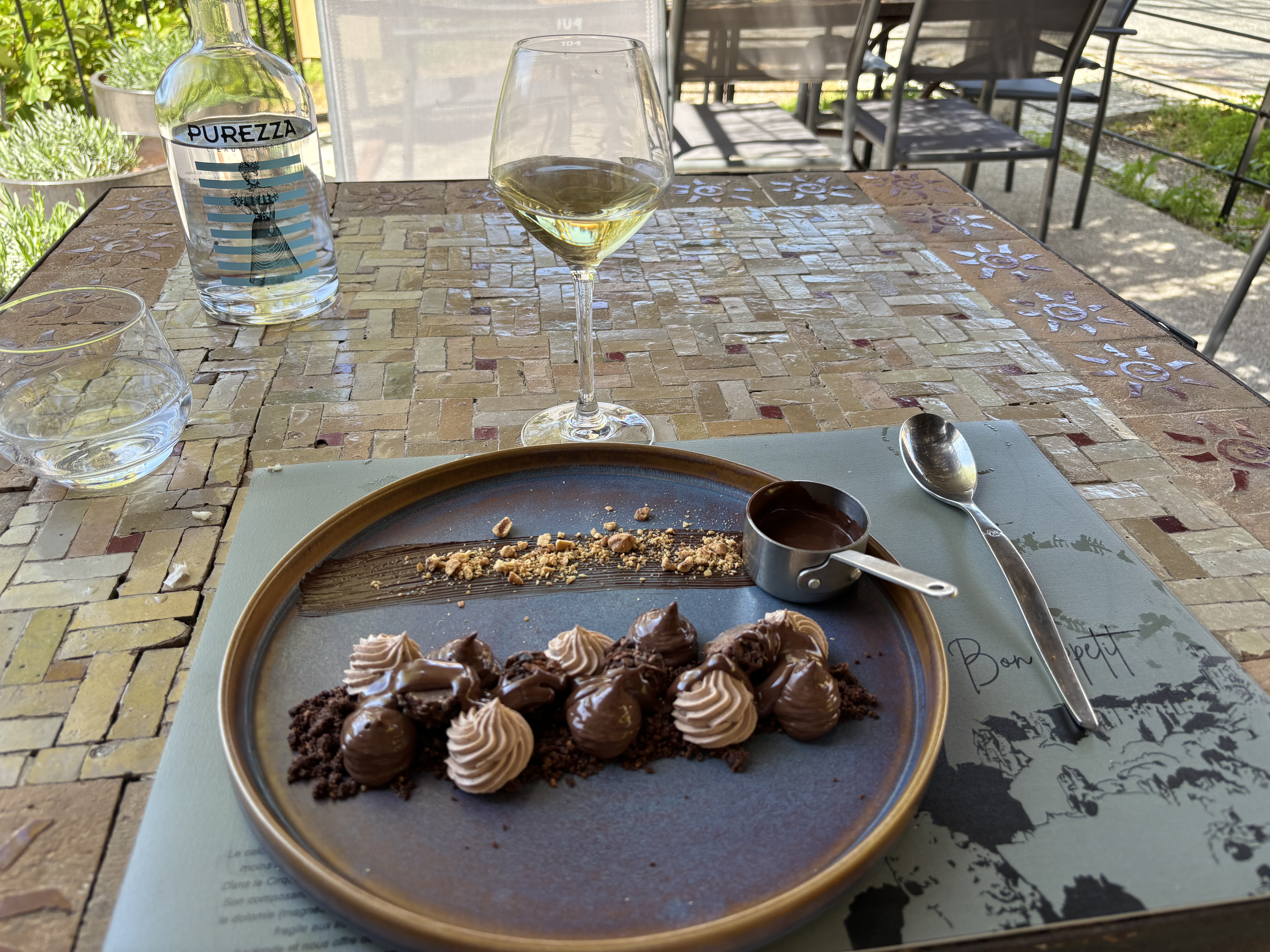 Accueil exceptionnel par le patron et les serveuses, une magnifique vue et une cuisine locale, fraîche...La carte des vins est incroyable et à des prix abordables. Allez-y les yeux fermés. Je n'ai pas pris de photo de la planche ni des plats car trop savoureux, on a tout dévoré sans que je pense à photographier ! Mais voici le vin et le dessert !