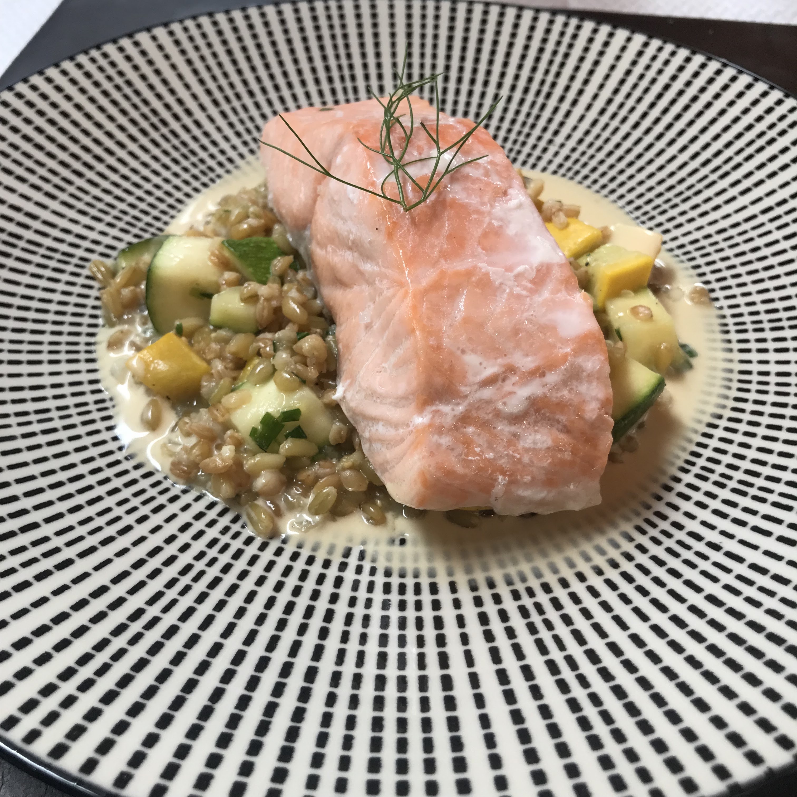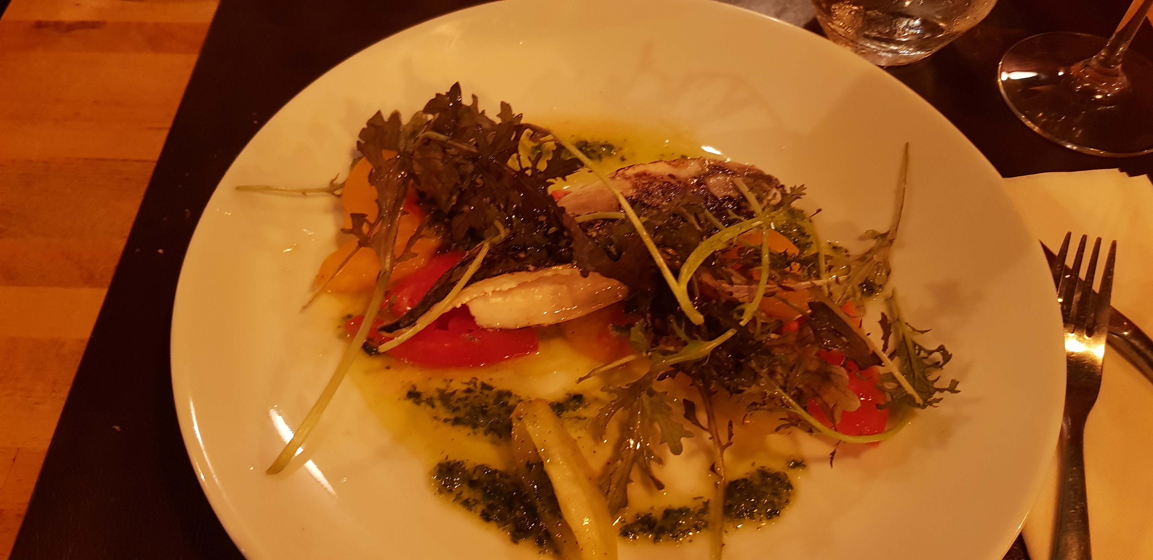 Un endroit qui mérite vraiment sa réputation. Excellente nourriture et service encore meilleur, avec une décoration chaleureuse et élégante en plus. Les serveurs et la gérante du restaurant étaient joviaux, accueillants et très professionnels, heureux de nous conseiller sur le menu et d'engager la conversation. Le bar, accompagné de légumes d'été de saison, était tout simplement excellent. Je recommande vivement.