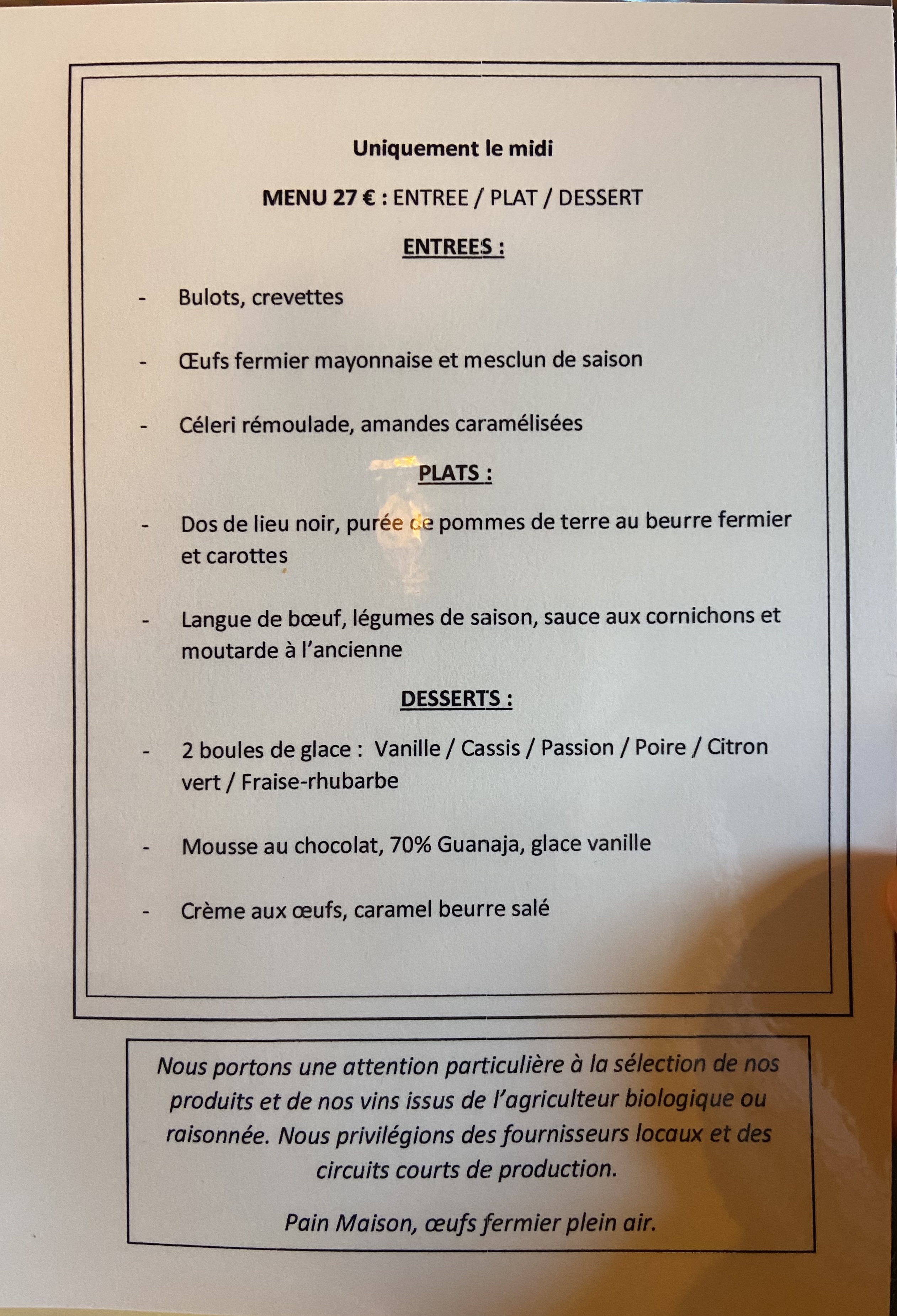 Un cadre très agréable et intimiste, parfait pour les adeptes du circuit court ! Une équipe au top et une ambiance cocooning ! Je recommande vivement cet établissement !
