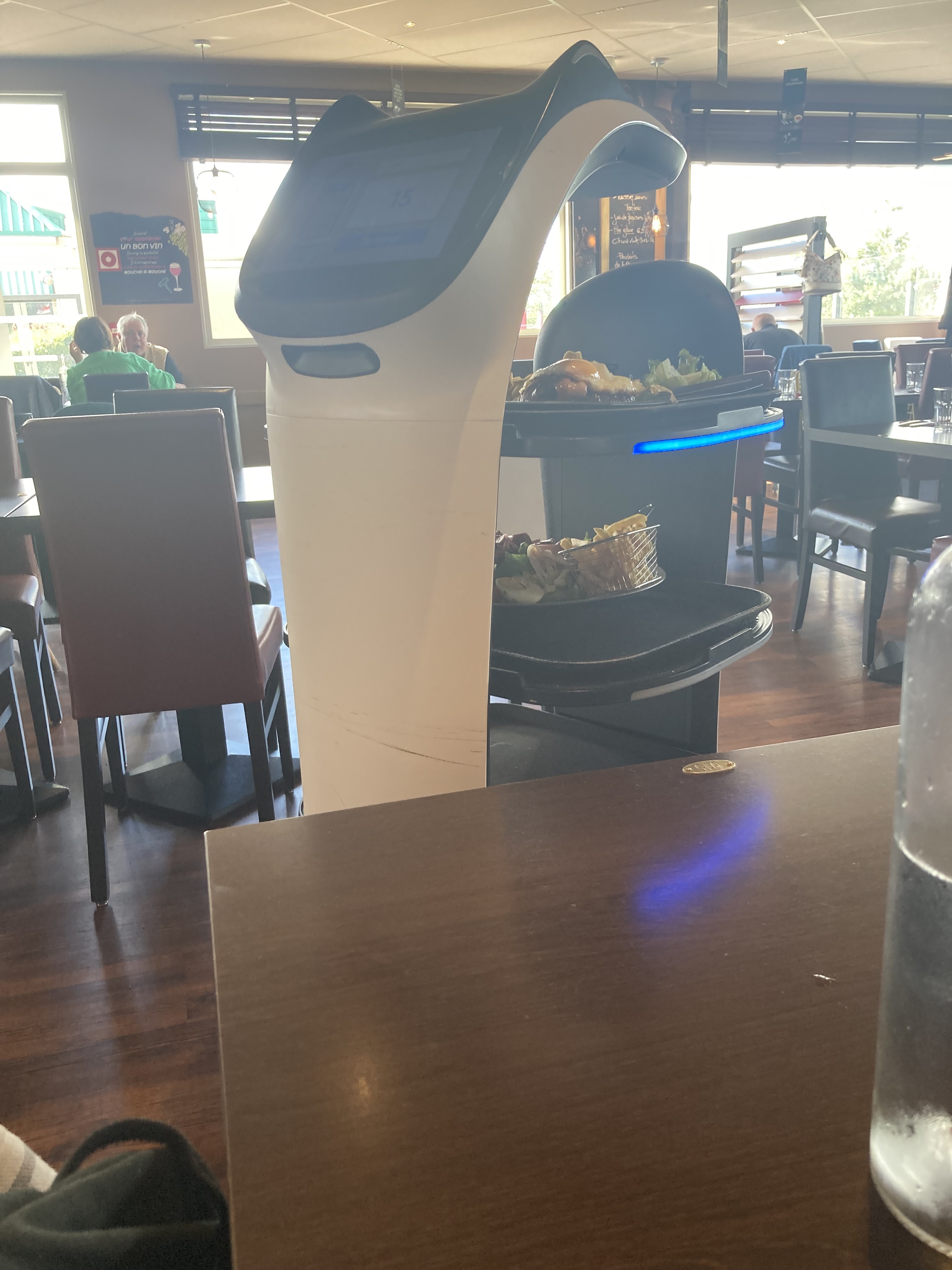 Bonjour les plats sa allez juste que je viens pas dans un restaurant pour etre servi part un ROBOT ou les plateaux n étaient pas propre et que je doivent moi récupérer mais plat a faire je vais chez MCDO de plus sa tue l emplois et apres on se plein qu il n y a plus de retraite ou de liens social cordialement Alain