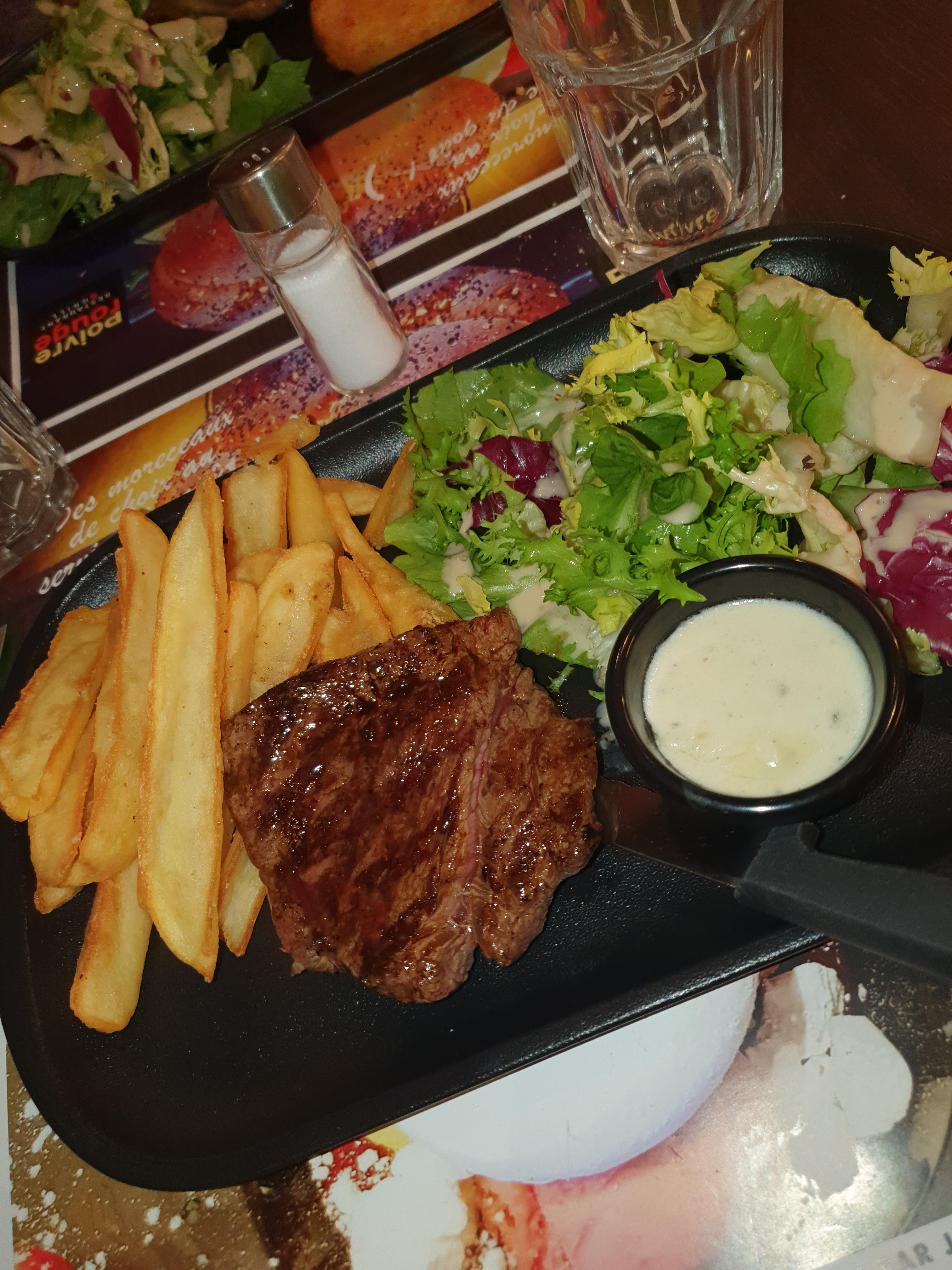Le restaurant en lui-même sors de l'ordinaire, appel à la curiosité, avec leurs déco très appréciable. Cela apporte un côté rassurant ne connaissant pas le restaurant. Cependant restaurant non rempli, nous étions environ 20 clients y compris nous. Arrivés à 21h00 servi à 22h00 oui ils ferment à 21h30 je comprends tout à fait que la cuisine s'arrête cependant lorsque l'on prend un plat avec frite à volonté on pourrait nous avertir que nous risquons de ne pas en avoir. Ayant un seul serveur (le soir de notre passage) c'est dommage car nous n'avons pas eu un service digne, où l'on a la phrase typique de la restauration qui est Mrs dame tout se passe bien nous n'aurions pas eu à courir derrière vous pour avoir de l'eau supplémentaire et j'en passe. Vraiment déçu, j'ai regardé les commentaires sur place à table, et cela ne nous a pas encouragés à nous plaindre. je ne reviendrais pas.