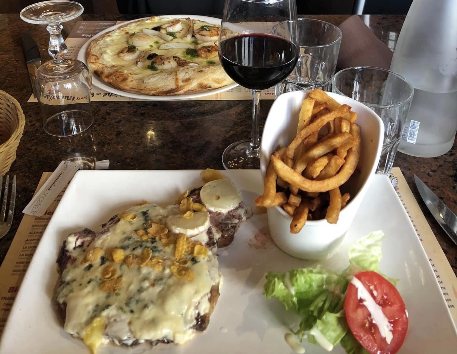 Je n’ai pas pour habitude de mettre des commentaires négatifs mais vu l’expérience que nous avons passée au sein de ce restaurant je me dois de faire un retour pour que des améliorations soient faites sur tous les points : Nous avons diné à 4. En ce qui concerne le service et l’accueil ce n’était pas top : nous avons eu 3 serveurs différents (ce qui m’a paru bizarre). Le principal serveur était un petit jeune sympathique mais qui manquait beaucoup d’expérience (frites oubliés, verre de vin ramené en plein milieu du repas) Au niveau de la cuisine alors là clairement je ne comprends pas du tout les commentaires positifs, je pense que nous avons dû certainement venir un mauvais soir (soir de match, j’imagine que le cuistot était plus concentré sur le match que sur les plats). Ce n’était vraiment pas bon ! Les deux pizzas avaient vraiment le goût de pizzas surgelées (autant la pâte que les ingrédients). Une pizza est arrivée froide (le camembert au-dessus était dur et froid) nous l’avons renvoyée pour qu’elle soit plus cuite et chaude et là elle nous est revenue littéralement cramée (le cuisinier l’avait oublié dans le four) mais je ne sais pas comment ils ont pu oser nous ramener une pizza aussi cramée. Heureusement je l’ai présentée au serveur en disant que ce n’était vraiment pas possible et la pizza a été refaite. Je précise qu’il y a quand même eu un geste commercial car la pizza a fini par être offerte (ce qui est quand même la moindre des choses même s’ils ont bien insisté en nous rappelant au moins 5 fois qu'ils nous offraient la pizza). Pour la suite, la viande était non pas bleue mais saignante voir à point alors que nous sommes censés être dans un restaurant qui est spécialisé là-dedans. Le camembert rôti et les frites à l’exception des autres plats étaient plutôt bons. Au vu des plats nous n’avons évidemment pas pris de dessert donc rien à dire là-dessus. Mais ce qui me choque ce sont les prix exorbitants (oui c’est vraiment très cher pour ce que c’est) au vu de la qualité des produits ! Je trouve que c’est une arnaque de payer ce prix-là au vu de ce que l’on a mangé ! Cela a vraiment été une mauvaise expérience pour nous tant au niveau du service que des plats. Nous avons vraiment eu la sensation de nous être fait avoir. En gros, passez votre chemin vous trouverez bien meilleur dans le coin pour bien moins cher !