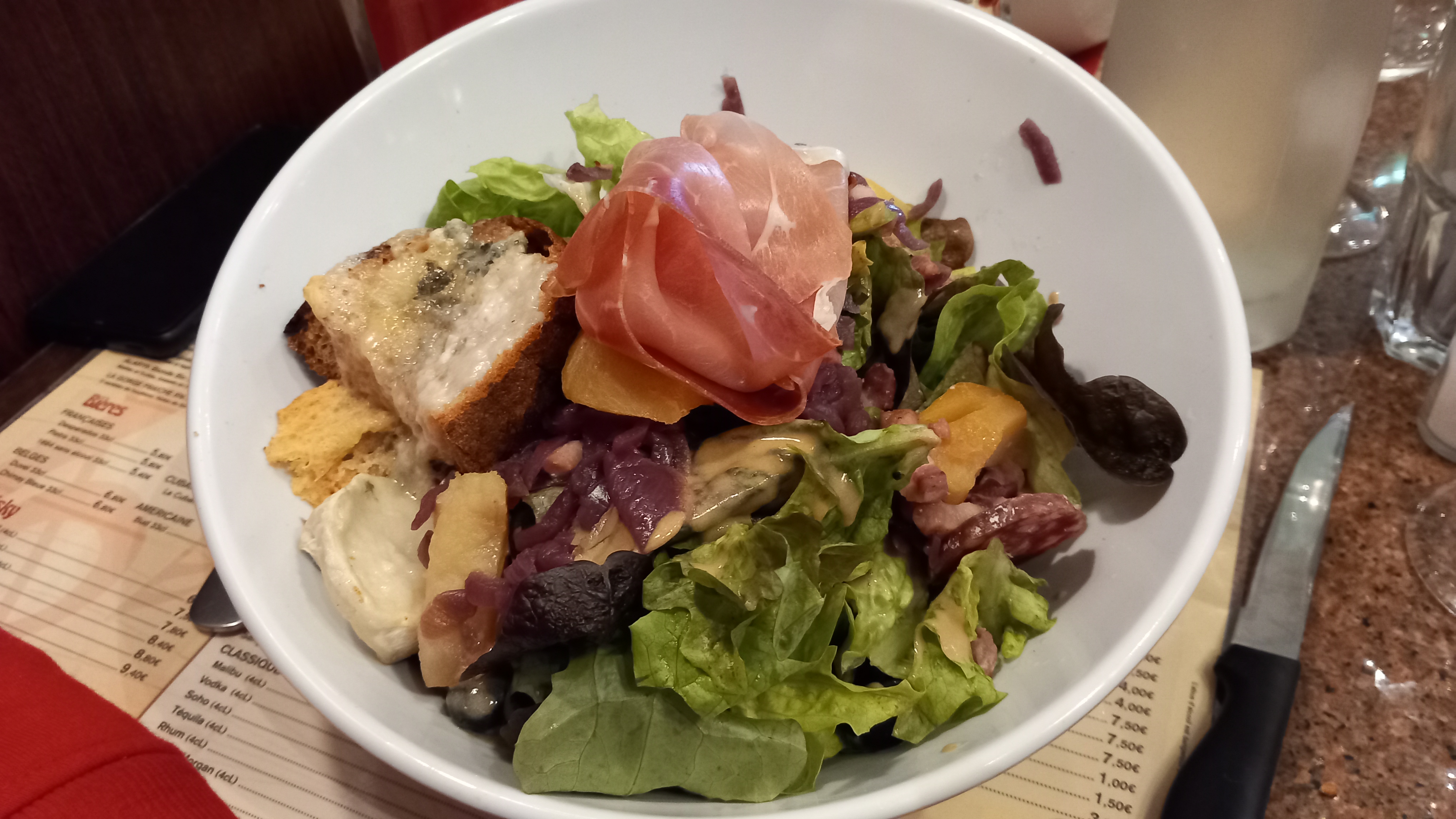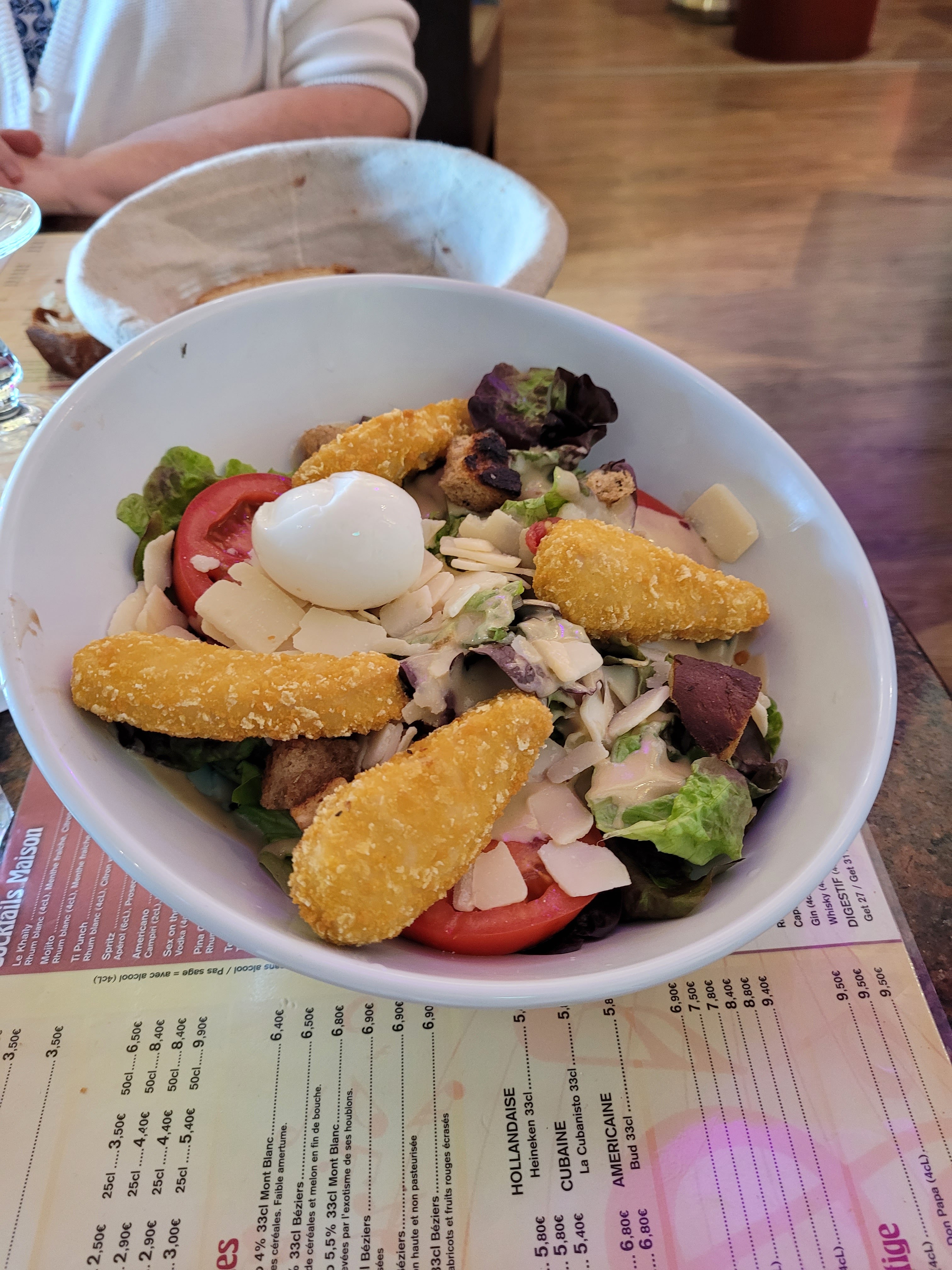 La salade landaise est copieuse et très bonne. Le vin et la panacota maison aussi. Il y avait un orchestre très bien mais le son était vraiment trop fort. Le cadre est original.