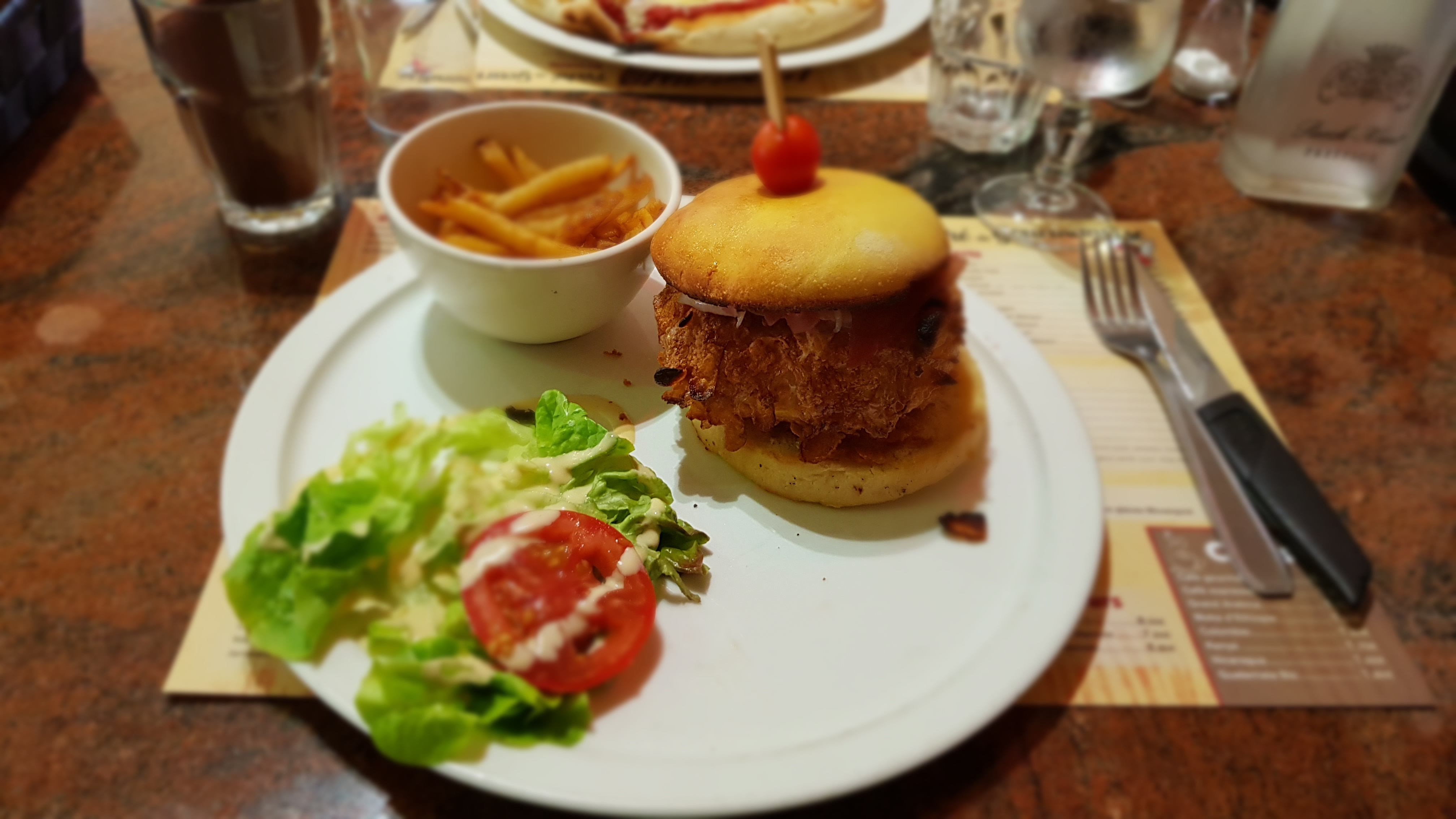 Apparemment un bar ou la moto à une bonne place vu la déco et quelques clients motorisés. Les assiettes sont belles mais arrivent un peu trop lentement (45mn), le serveur est seul on est 17 clients mais en cuisine je sais pas. C'est bon et généreux 👍