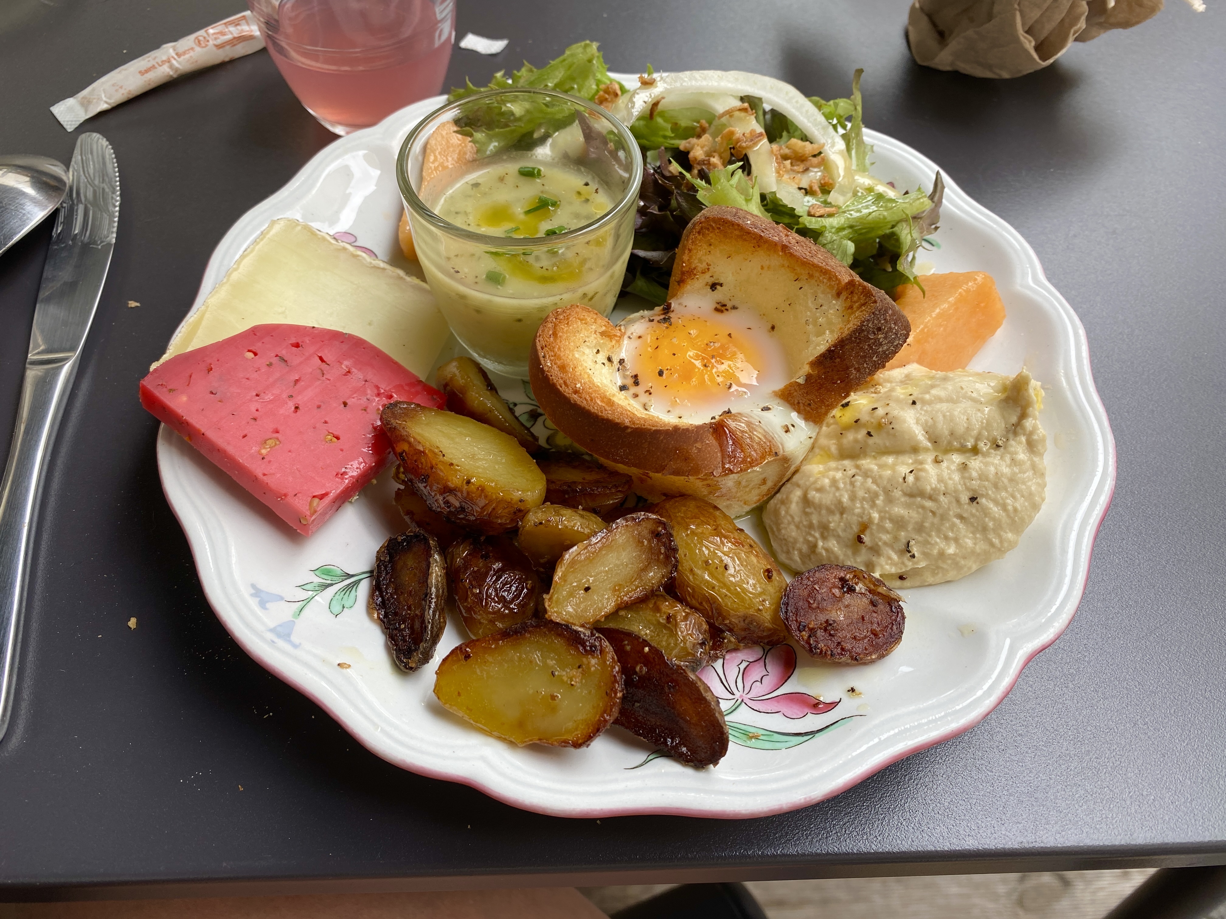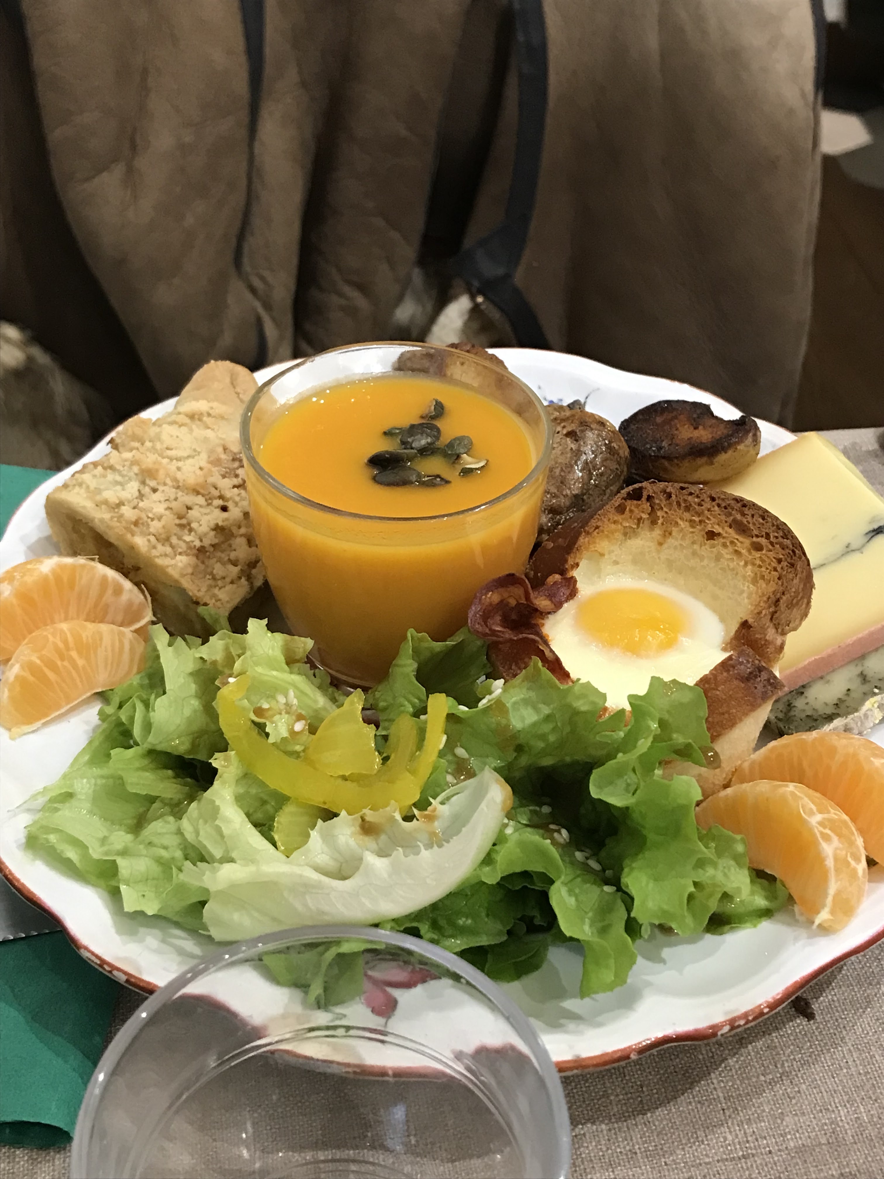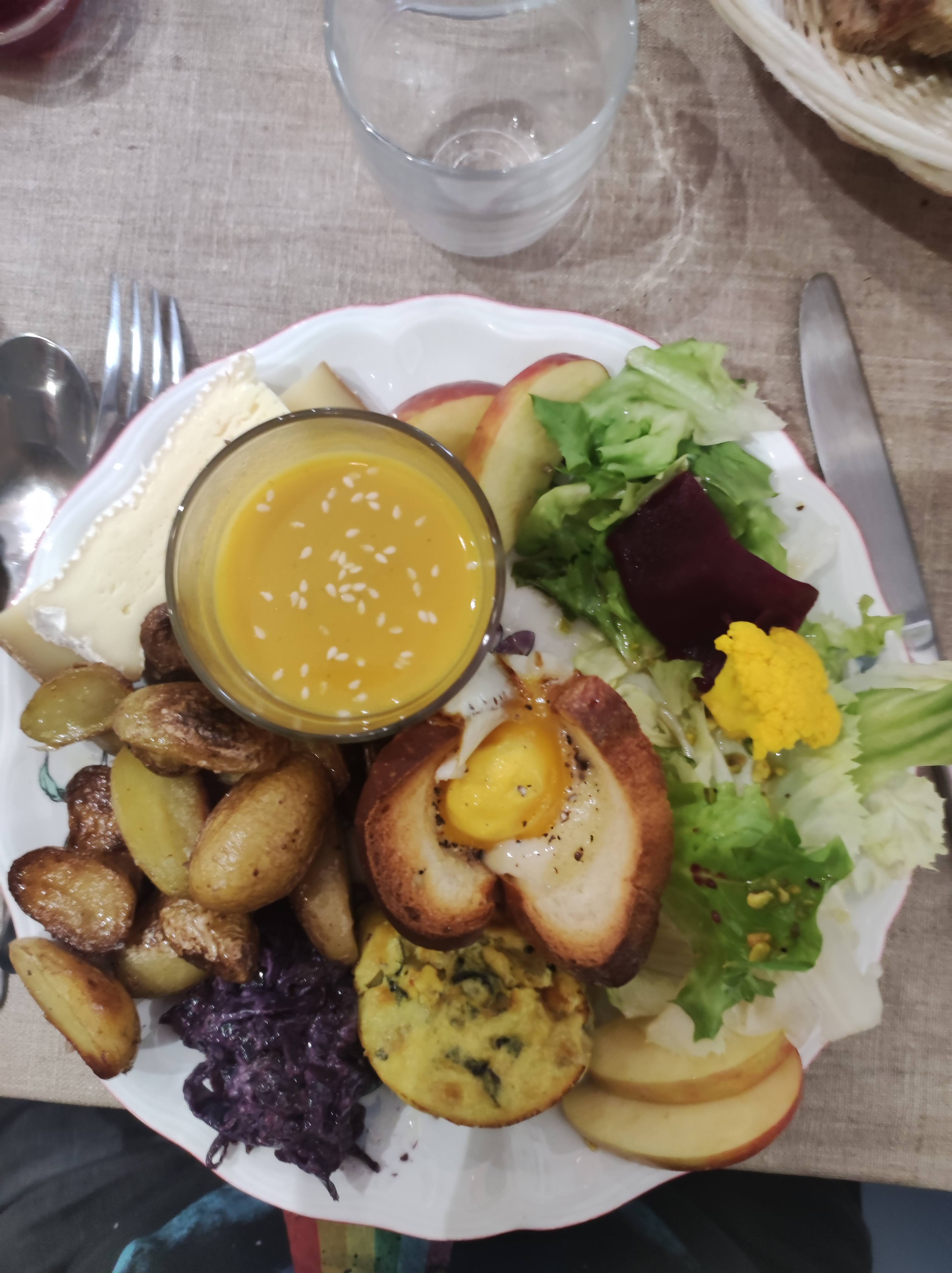 Brunch du dimanche, 25,5€/personne. Au menu : - pain/brioche/cookie avec beurre et confiture - boisson thé café ou chocolat chaud (possibilité lait végétal) + accueil avec jus de pomme - puis assiette avec salade, fromage, pommes de terre sautées, salade, petite soupe, oeuf poché - option végétarienne: brocolis et champignons avec sauce blanche - option carnée : jambon et chorizo Très bon 😊