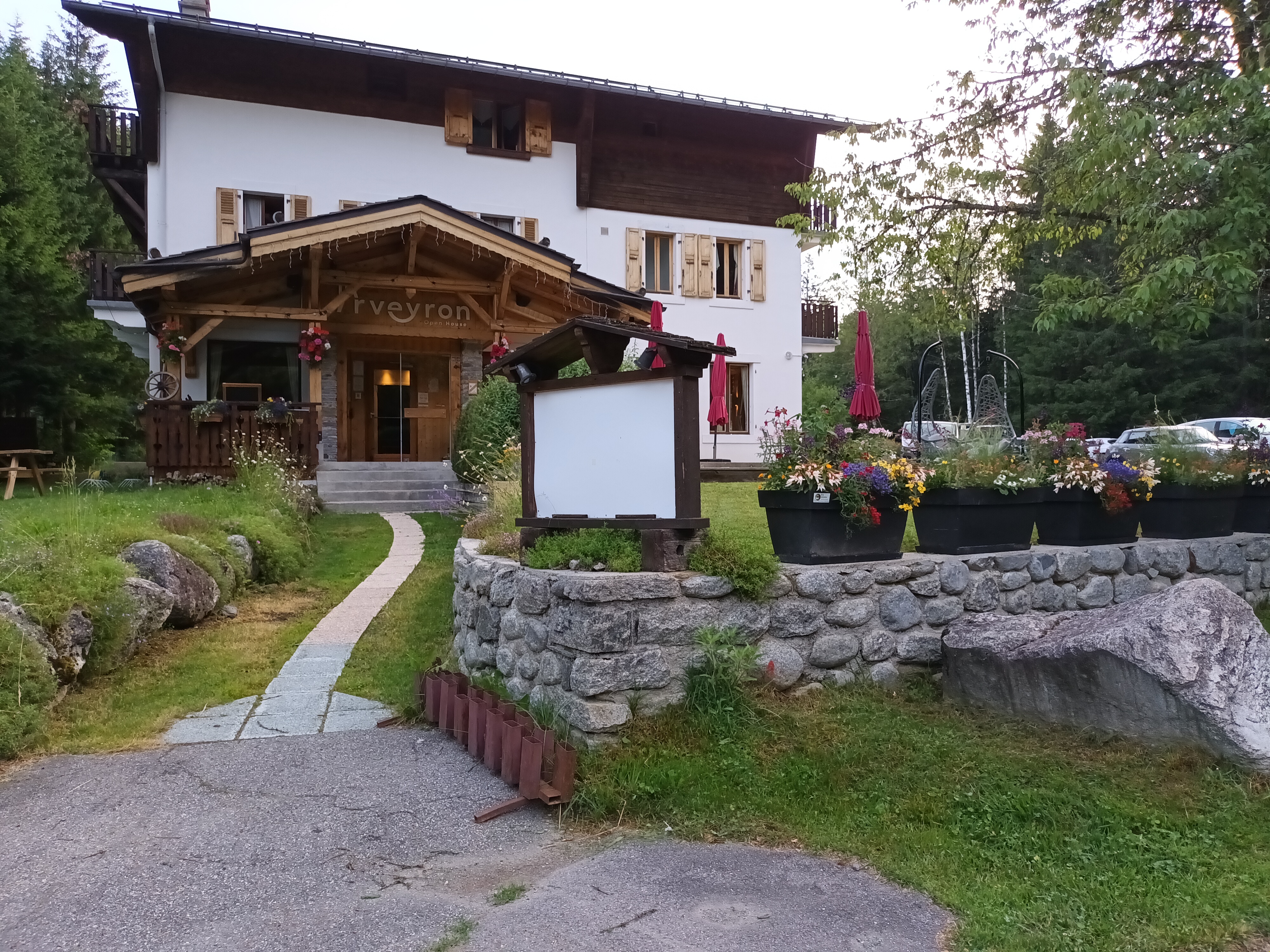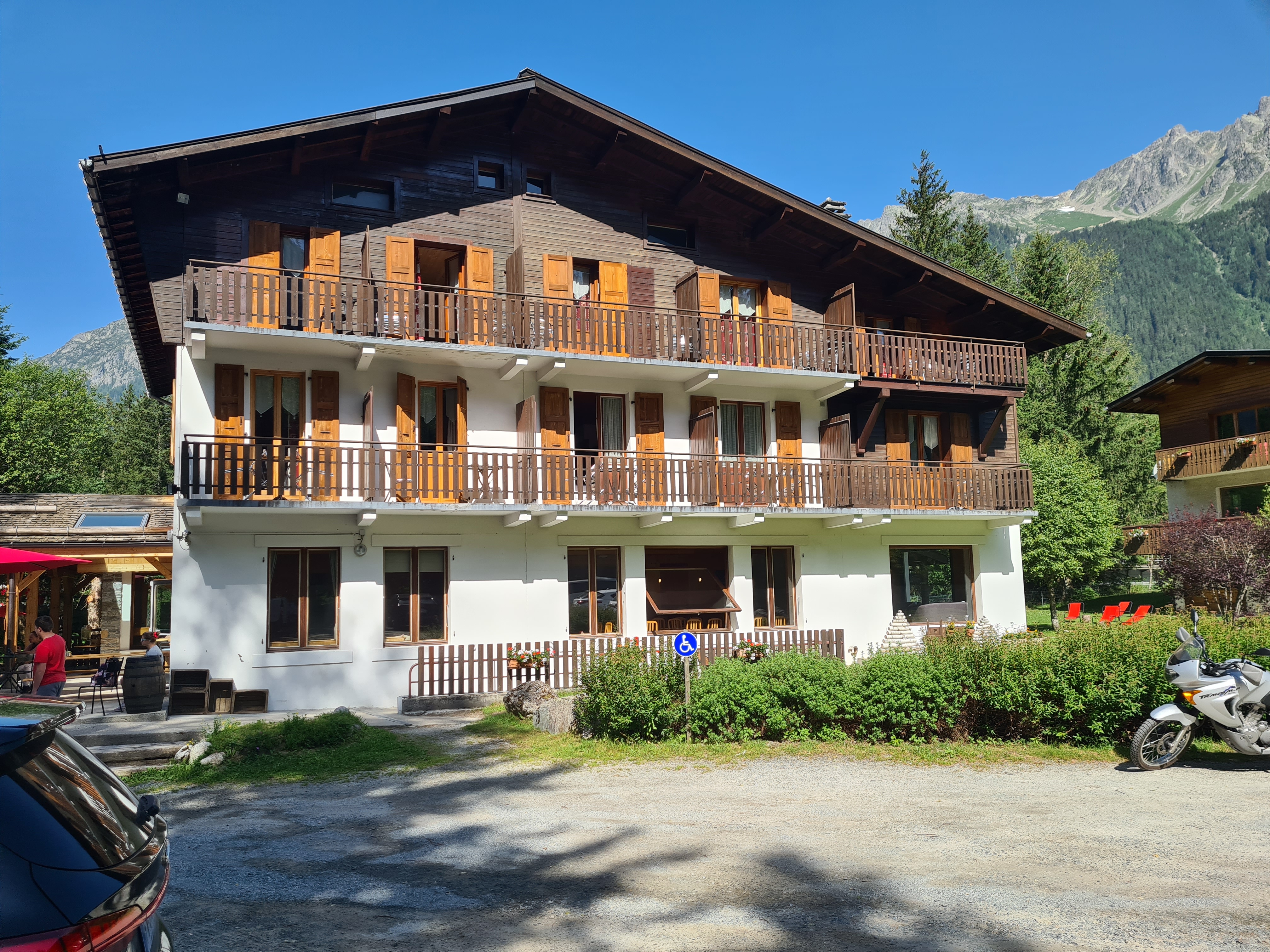 L'hôtel est situé juste à l'extérieur de Chamonix. Le bâtiment n'est pas très récent mais il est agréable. Jardin extérieur. Le stationnement est gratuit et facile. Lors de certaines soirées spéciales, ils font du barbecue et de la musique dans le jardin.