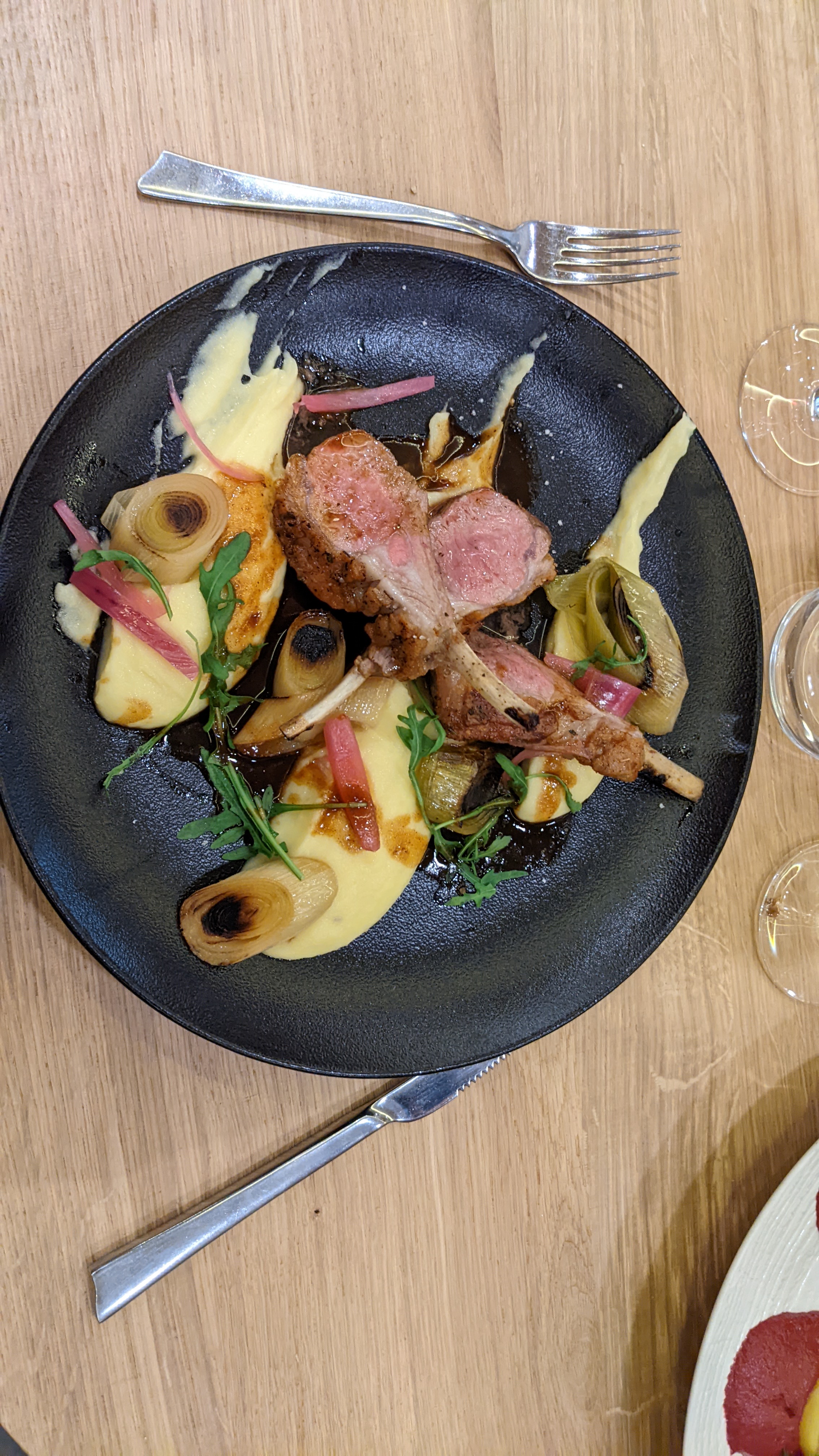 Un délice pour un déjeuner, carré d'agneau artichauts et pommes dauphines maison, poulpe fondant sur risotto de riz rouge, pavlova aux pêches et éclairs aux framboises.zero fautes, le sourire des serveuses en prime