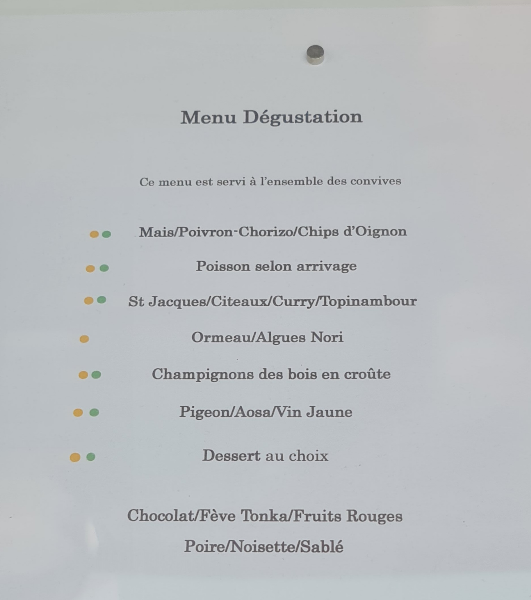 Super repas dégustation en 6 services et 2 desserts. Je recommande en plus le chef et le personnel sont super sympas. Très bonne adresse