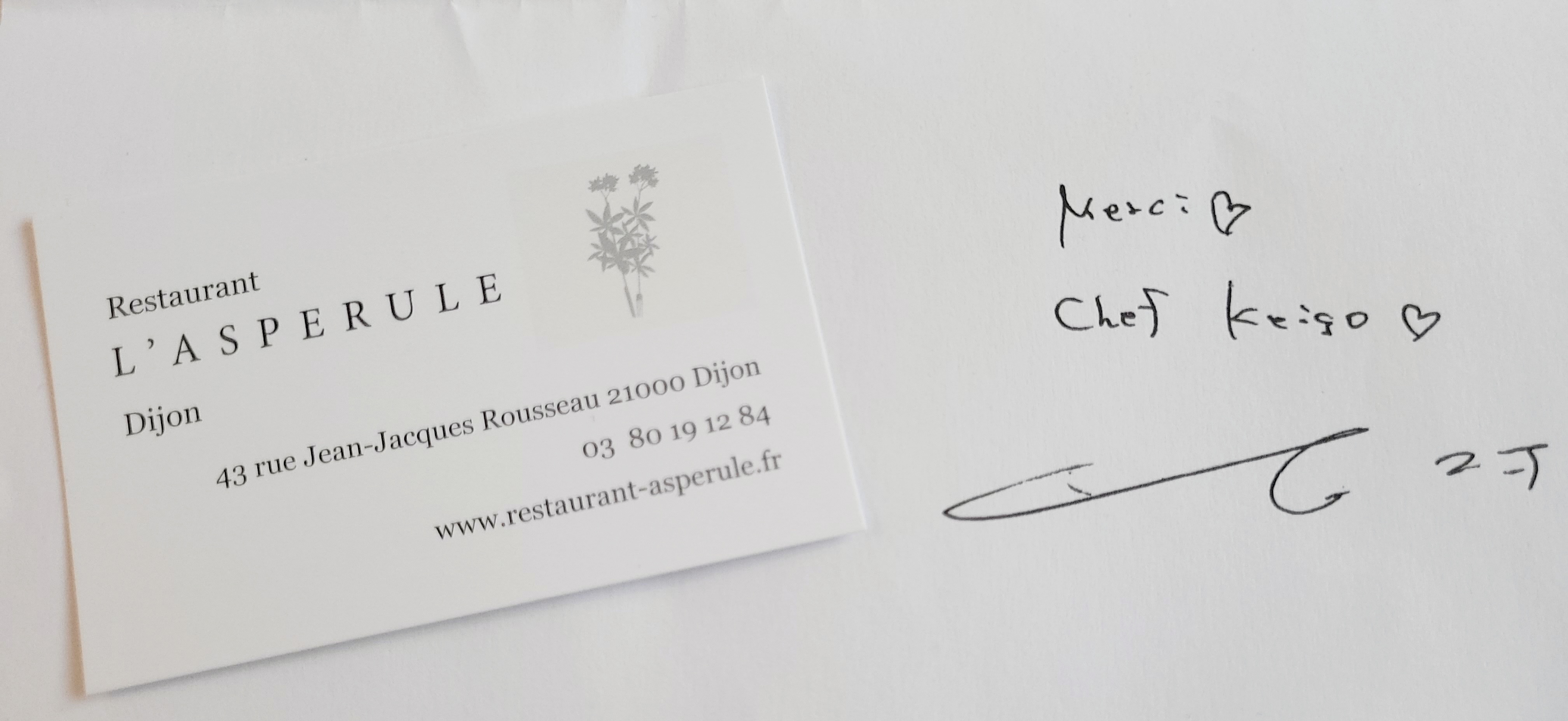 Il est des moments dans la vie où le temps s’arrête. Vous ne savez pas pourquoi mais vous rentrez en mode « contemplatif » ! Cela peut vous arrivez devant La vague de Kanagawa d’Okusai et ......devant le menu de l’Aspérule…. 5,6,7 tableaux…..oups ! Pardon ! Services….. L’énoncé des plats met votre imaginaire en activité intense et vos papilles en mode action ! Et.......Il n’y a encore rien sur la table. Puis commence la farandole des plats…..et là c’est un tsunami ! Un tsunami d’émotion, par les yeux d’abord et ensuite par les saveurs ! Belles, douces , subtiles, délicates, uniques. Je retiens mes larmes ….je ne vais tout de même pas pleurer pour de la nourriture ! Non ! mais l’émotion est là du début jusqu’à la fin du repas ! pas une fausse note ! que du bonheur ! de l'excellence ! Plus que de l’émotion , le chef a su faire passer dans la confection de ses plats de l’Amour. L'Amour de la beauté et du goût ! Mention particulière aux personnels très professionnels :un accueil parfait, une discrétion adéquate et un service idéal. Le plus du plus : Une bougie et un joyeux anniversaire sur mon assiette de dessert, une attention qui m'a beaucoup touchée ! merci ! Quelle chance de pouvoir vivre cette expérience unique à Dijon ! MERCI ! 💝 🙏💝
