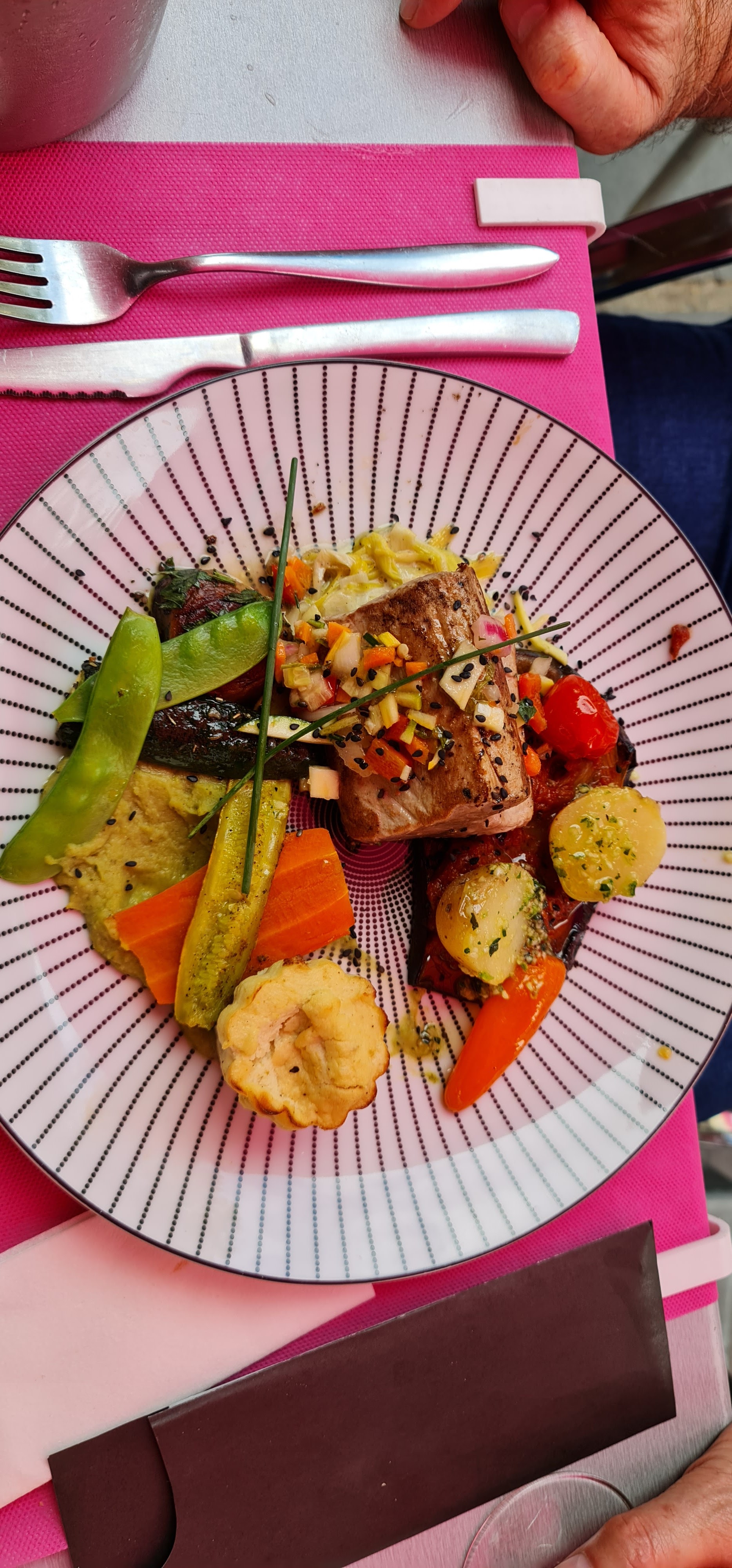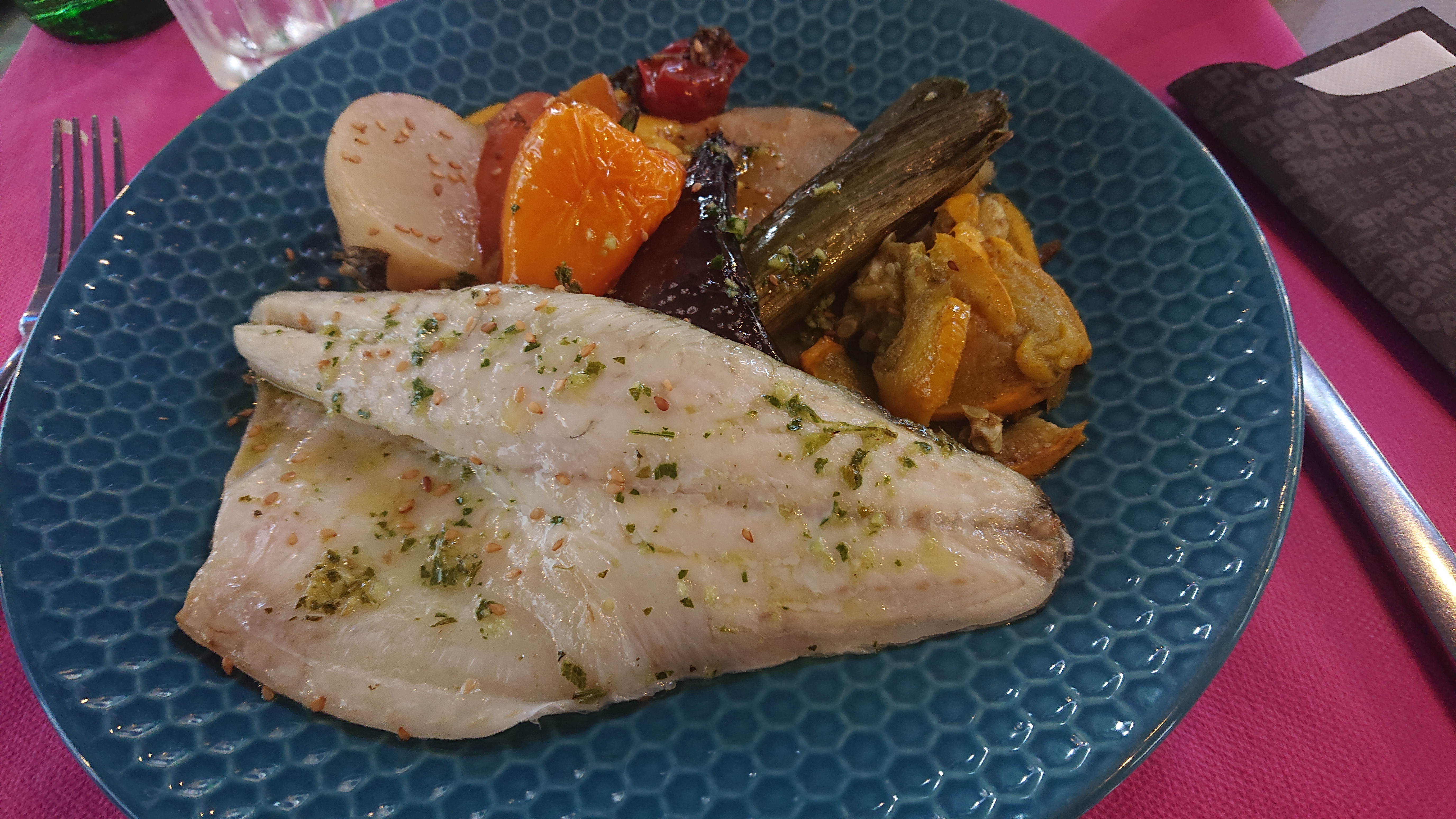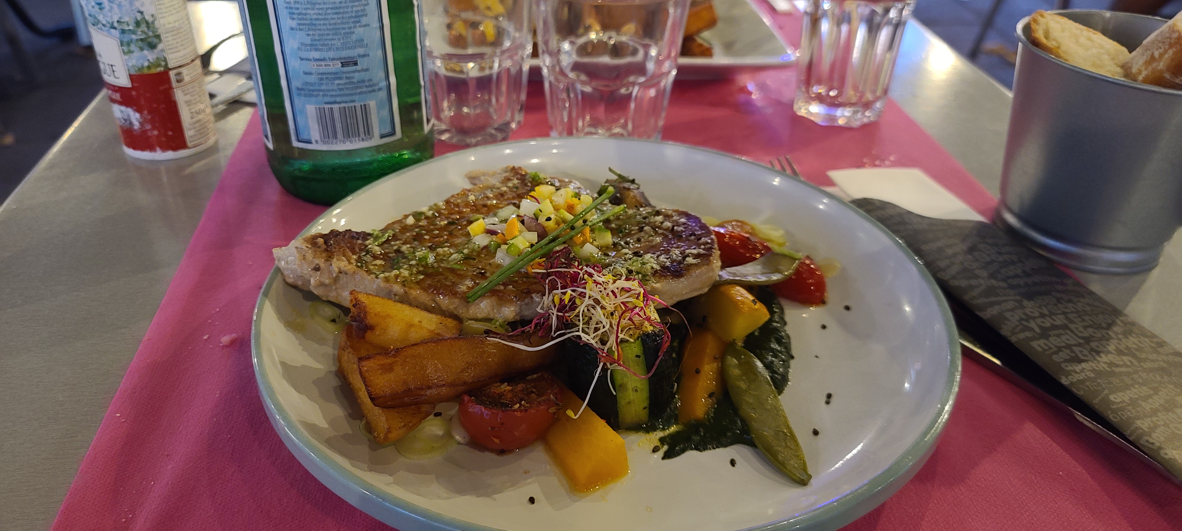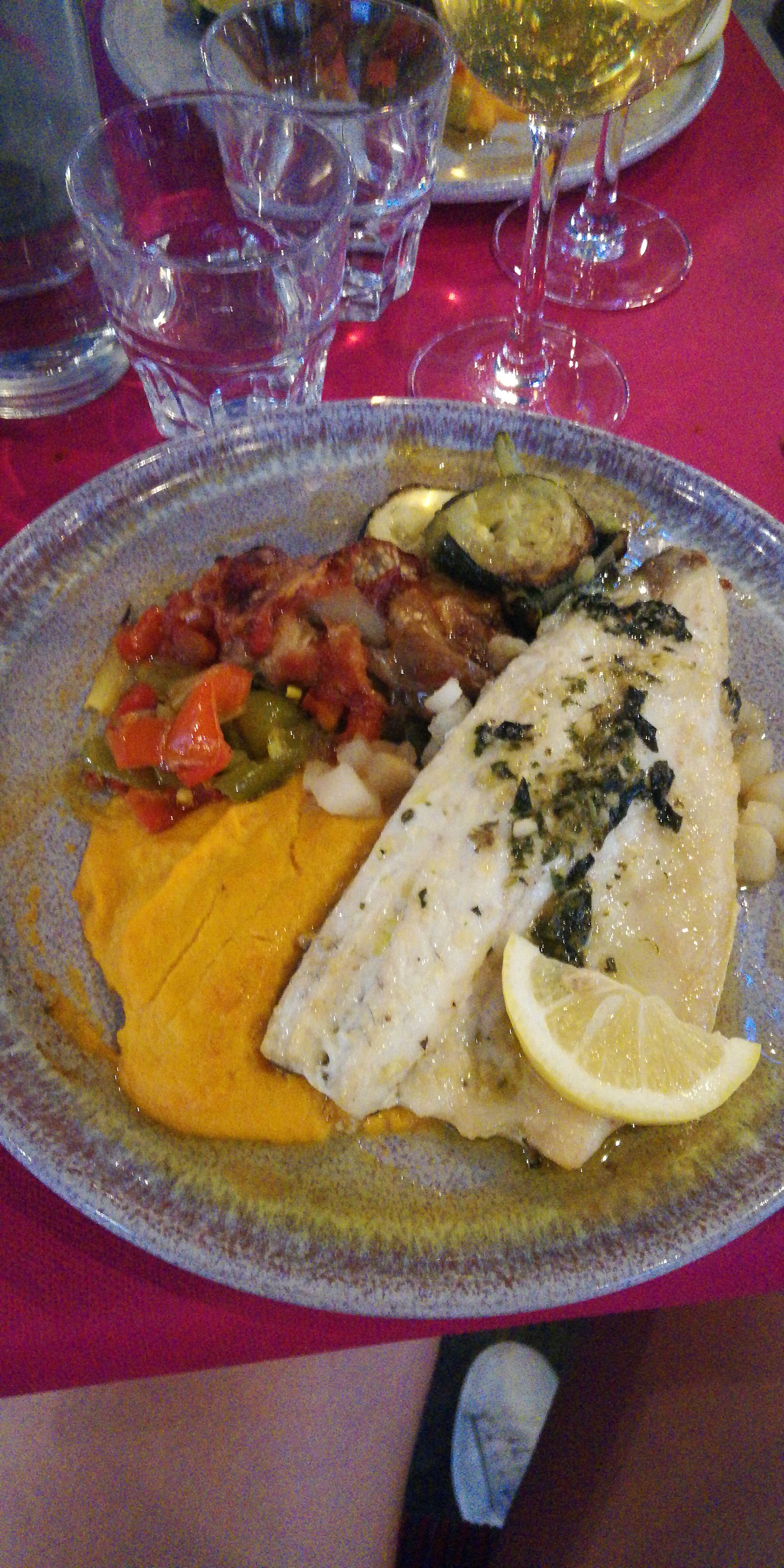Délicieux! Si vous souhaitez savourer du poisson ou du taureau c'est par ici ! Servi avec des petits légumes qui ont vraiment du goût. Gâteaux simples mais efficaces ! Dommage néanmoins que certains légumes ne soient pas de saison (courgettes en hiver....)