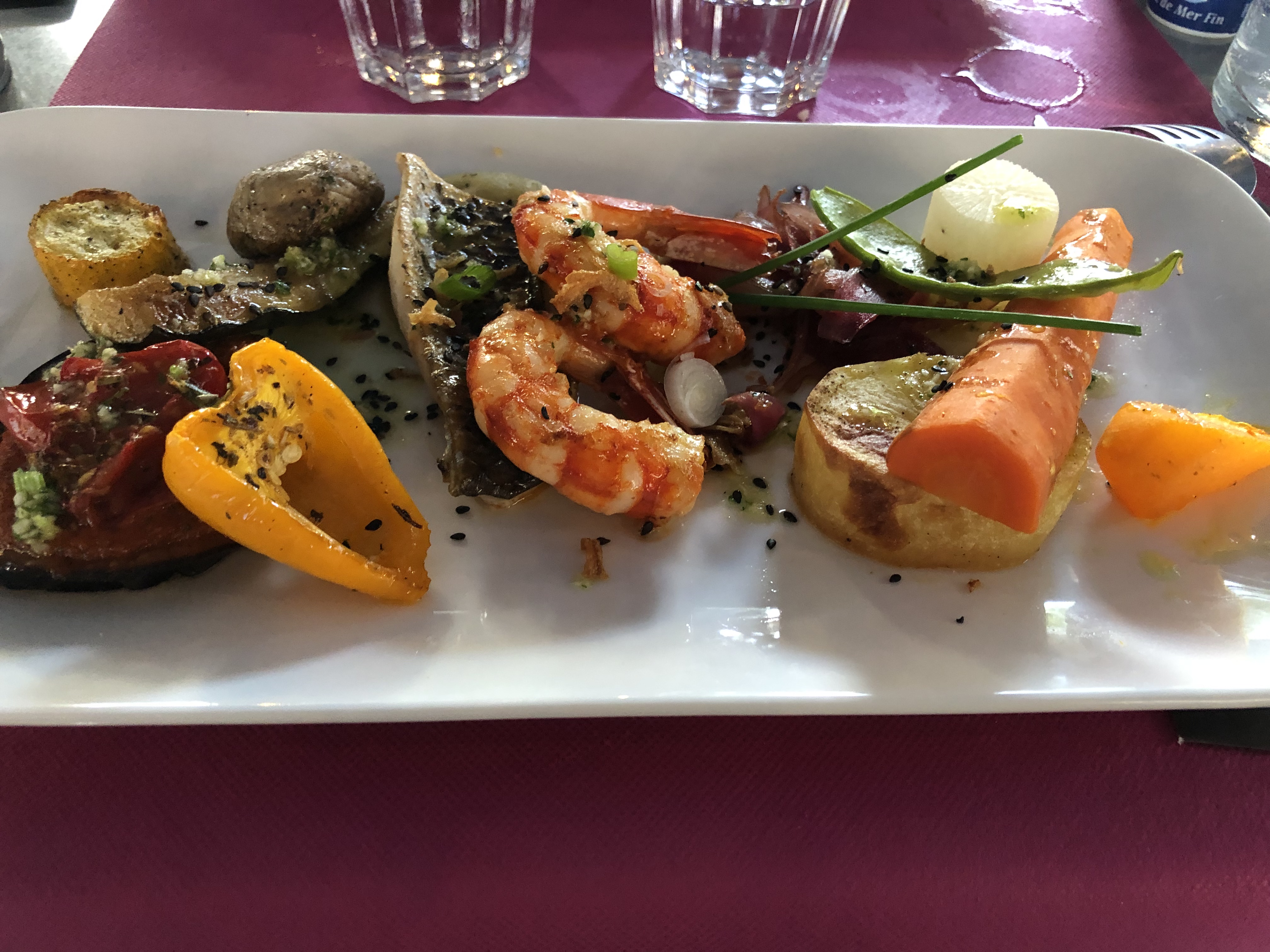 mitigés, nous avons mangés une excellente entrée,une des meilleurs de ma vie,par contre déçu par les plats,qui sont malheureusement rechauffé,croûte sur les purées,(assiettes preparé longtemps à l 'avance)gambas très sec,pas de cuisson a la minute,dommage ça aurait merité 5 etoile .personel très aimable.