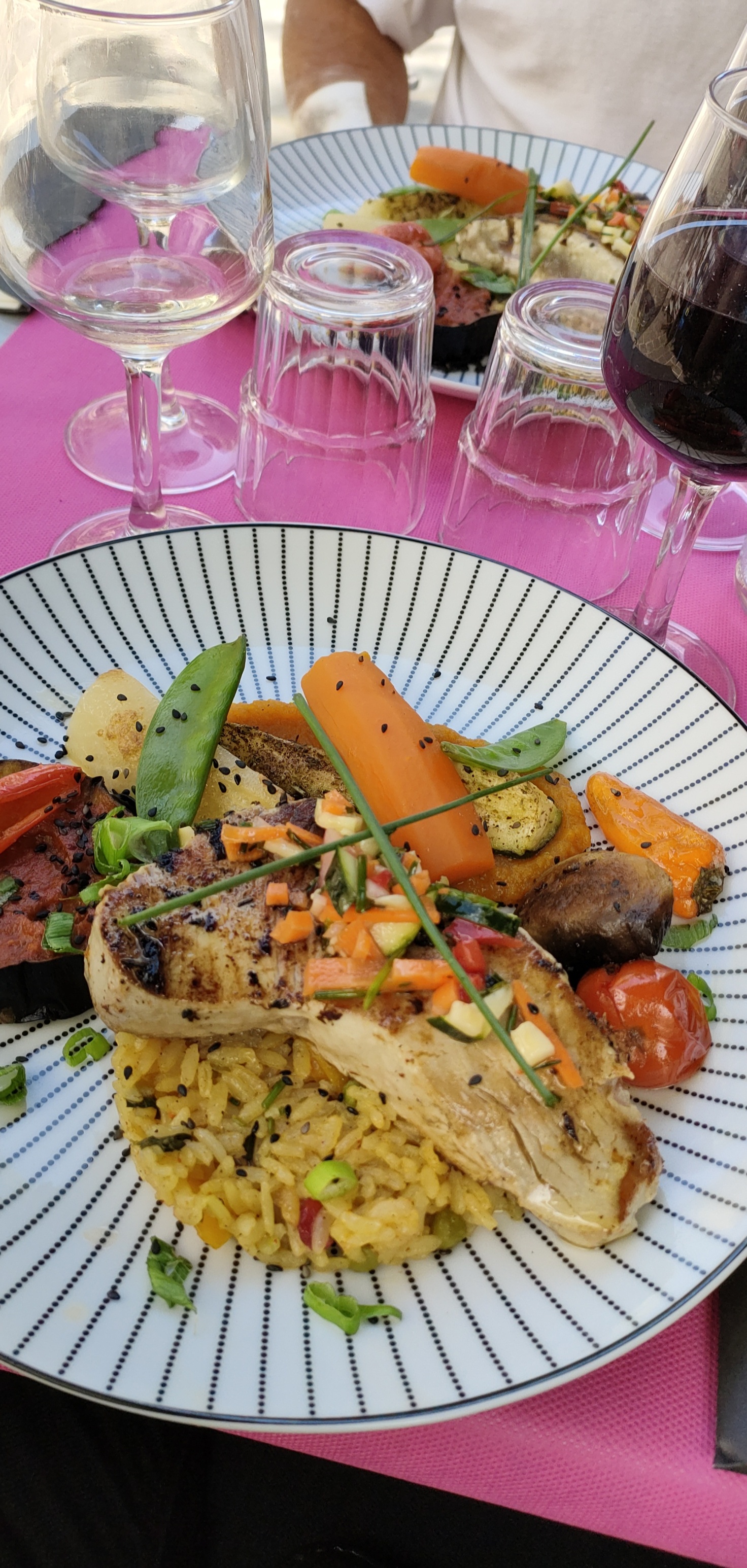 Serveur et serveuse sympathique. Entrée, plat, dessert très bon et prix résonnable pour les aliments proposés. Un peu déçu de la présentation de l'assiette (plat) Mais par contre bonne association de saveurs. Pas trop d'attente pour un resto en plein mois d'août. Juste un peu trop chaud le soir, il aurait fallu enlever les parasols pour avoir un peu d'air. Bonne quantité pour le repas enfant.