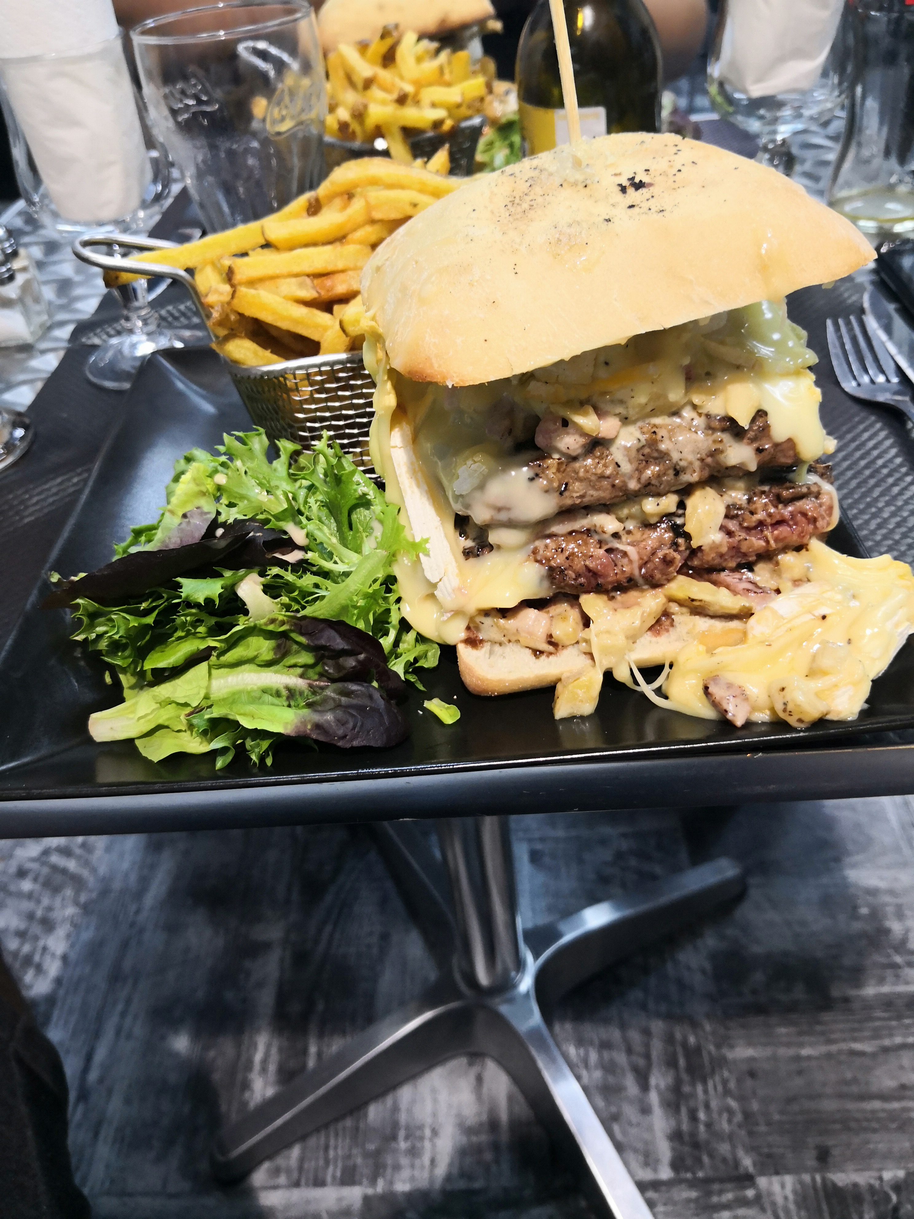 Visuellement, ça ne paye pas de mine il faut se l'avouer (façade peu visible, chaise/table de snack, dressage de table minimal...). On se demande un peu qu'est ce qu'on fait là ! Mais quand arrive l'assiette, c'est autre chose :) Ma compagne a pris un burger simple (10€70), elle voulait une galette de patate en plus, le cuistot lui a ajouté sans supplément. Moi j'ai pris un savoyard 2 steaks (17€), trop bon et tu finis ton burger tu n'as plus faim ! Frites maison en accompagnement, très bonnes aussi. Le cuistot nous a offert avant de partir le(s) digestif(s) ! Je suis pas trop fans de ce genre de chose mais ça reste une attention particulière ;) Ne faites donc pas attention à votre 1er opinion, osez franchir la porte :)