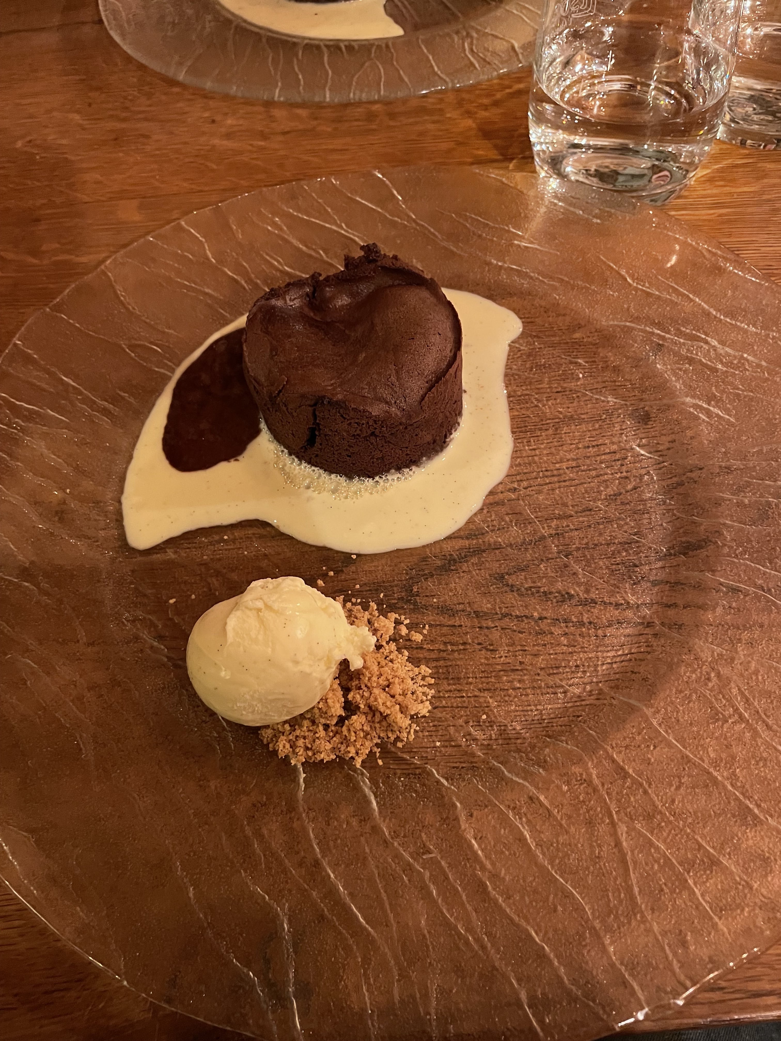 Bonne nourriture. J'ai adoré le butternut farci aux champignons sauvages et aux châtaignes. Délicieux gâteau de lave.