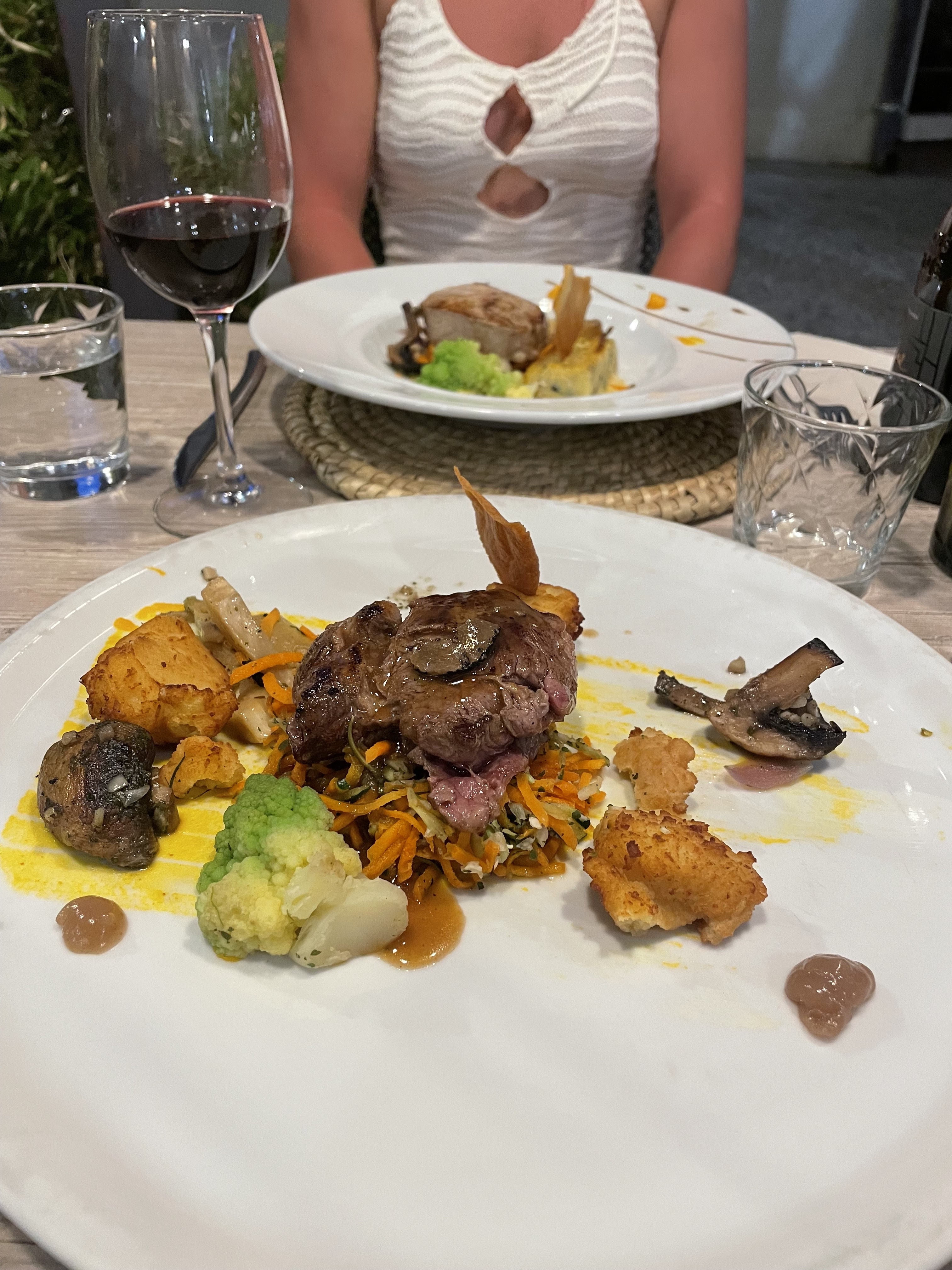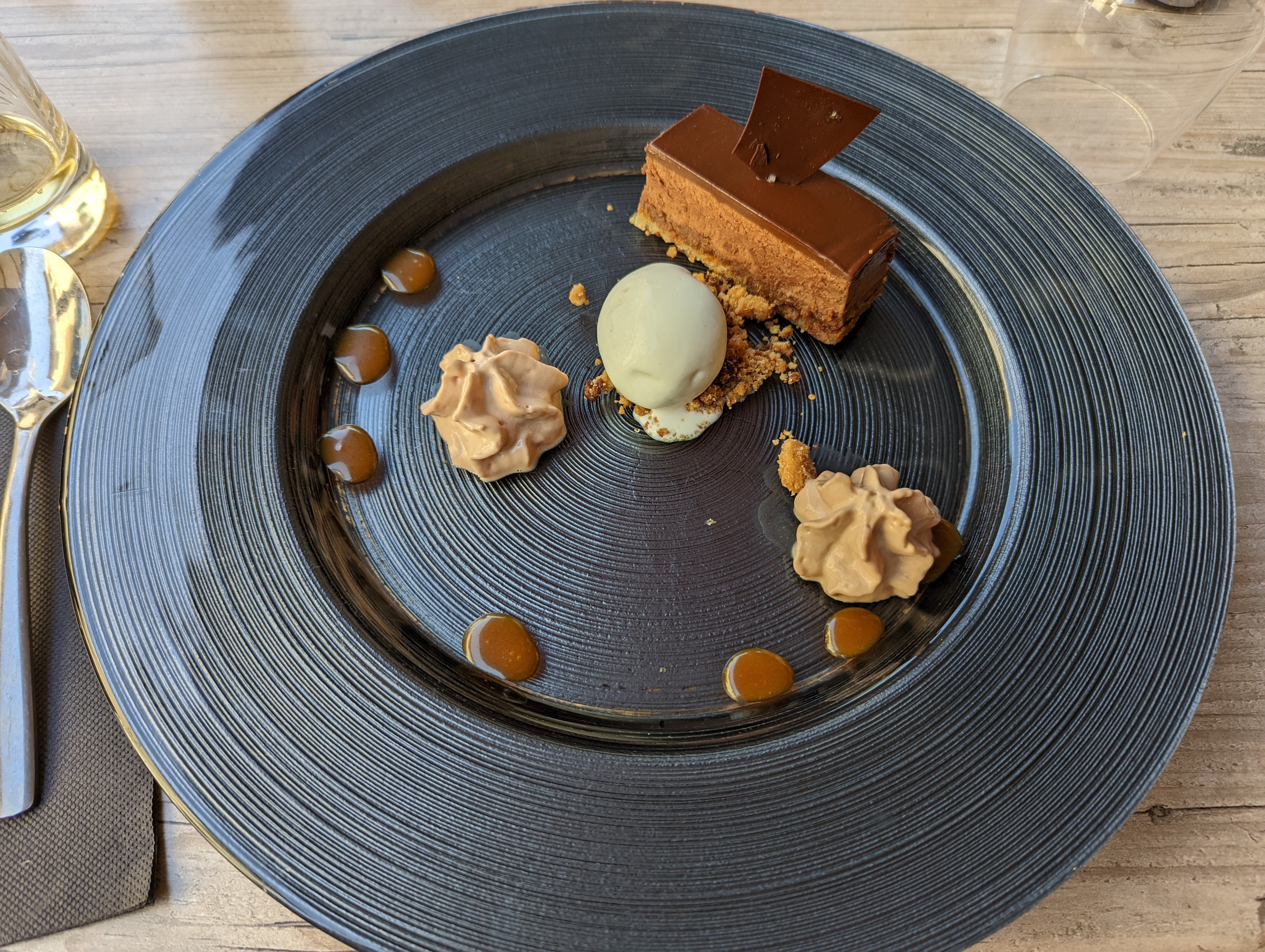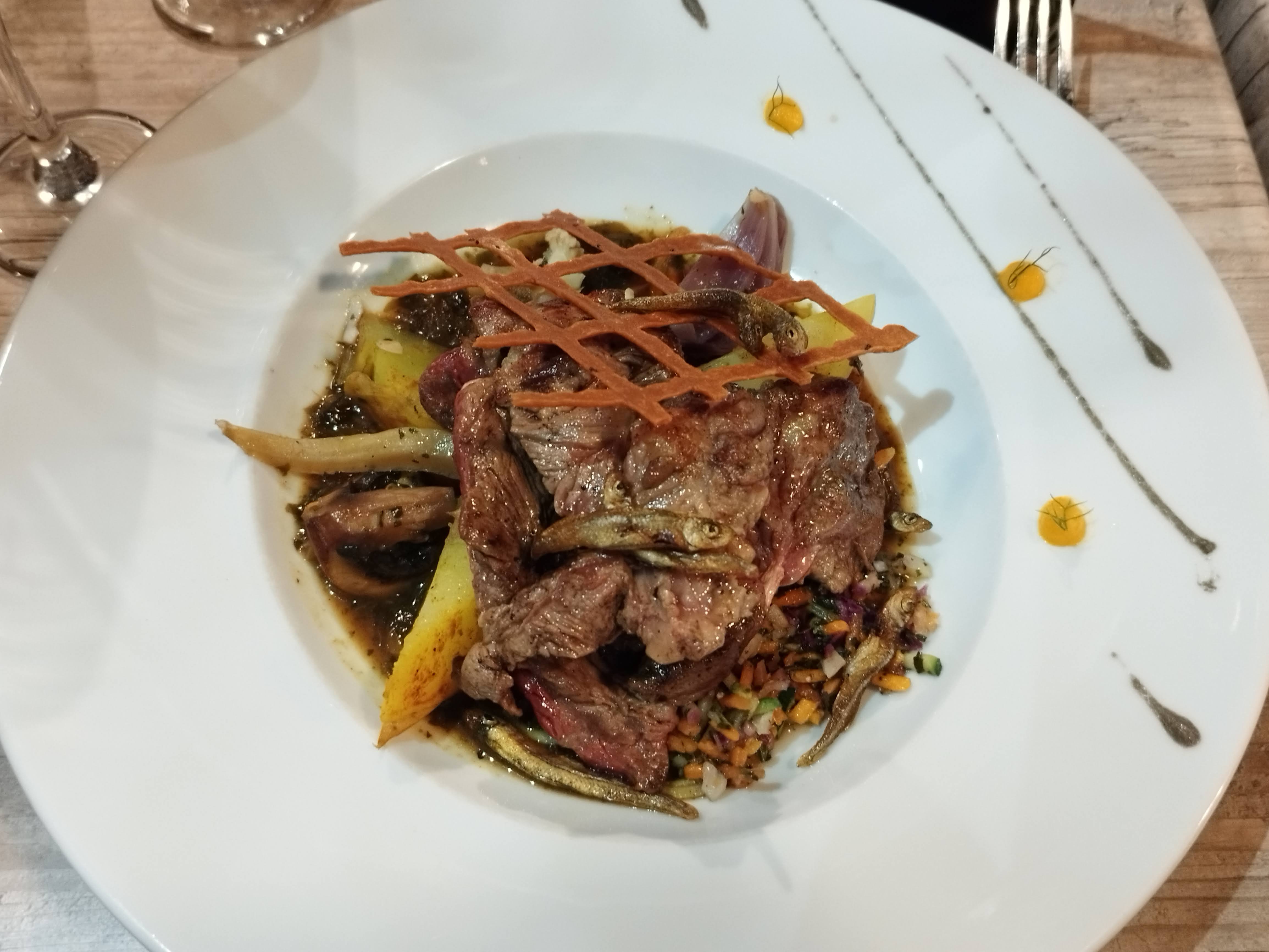 L'assiette n'est pas gourmande en fait, c'est fin mais pas du tout copieux. La pavé de bœuf à 25€ semble être du filet (ou un très bon rhumsteack), d'environ 110 à 130 grammes, mais l'accompagnement est ridicule en quantité : 3 pommes de terre Dauphines maison (oui vous avez bien lu, c'est 3), 1 champignon et quelques grammes de purée de toutes sortes. J'ai été surpris par la vitesse du service: moins de 5 minutes après la commande (je laisse le soin au restaurateur d'expliquer). Il a fallu fromage et dessert pour ne pas avoir besoin de reprendre un plat ailleurs. La glace est excellente, mais la quantité minimale (acceptable tout de même). Nous ne sommes pas de très gros mangeurs (poids de 60 et 69 Kg), même si ce jour là, comme tous les autres de cette semaine de CP nous avons fait 140km de vélo. Au final le bilan est mitigé même si on ne peut pas mettre moins de 4/5 car cuisine fine et travaillée.