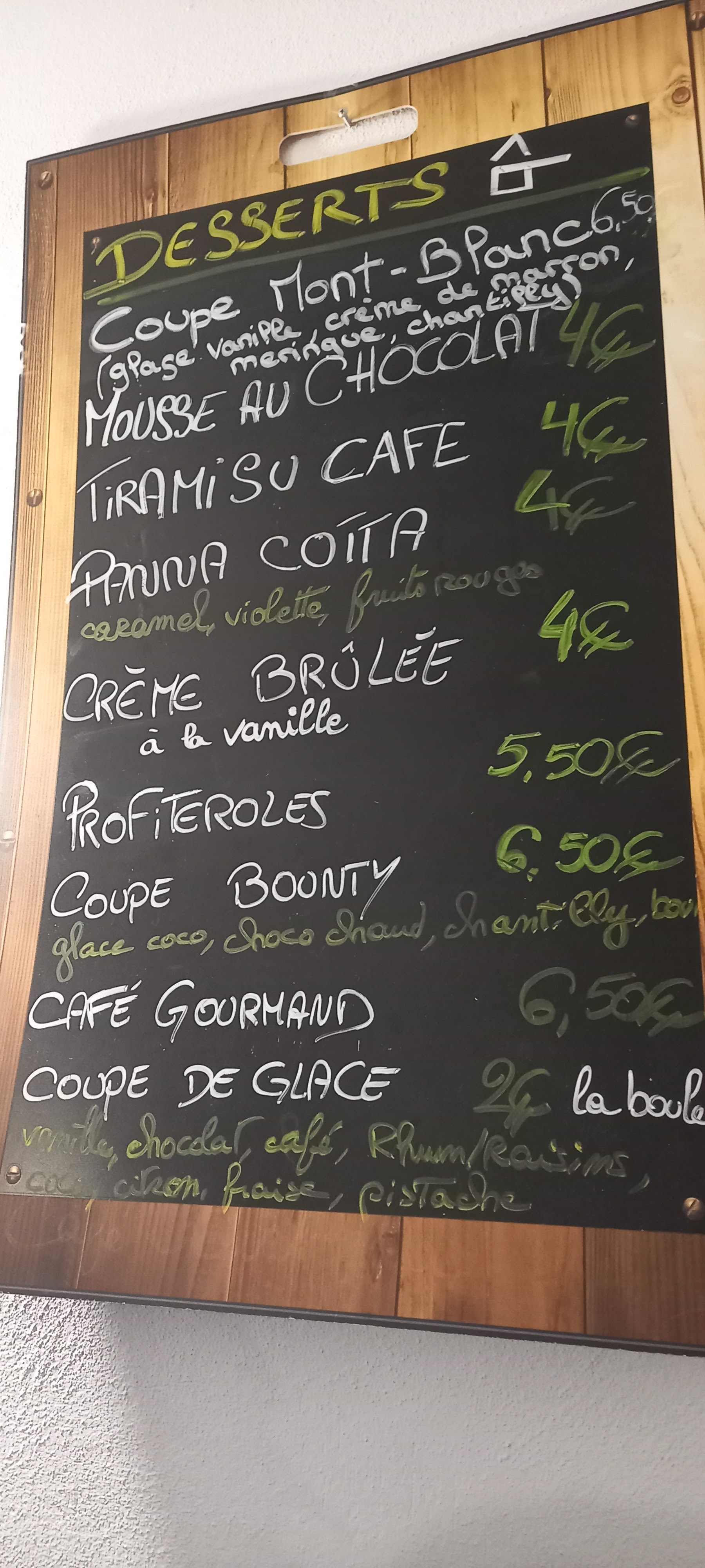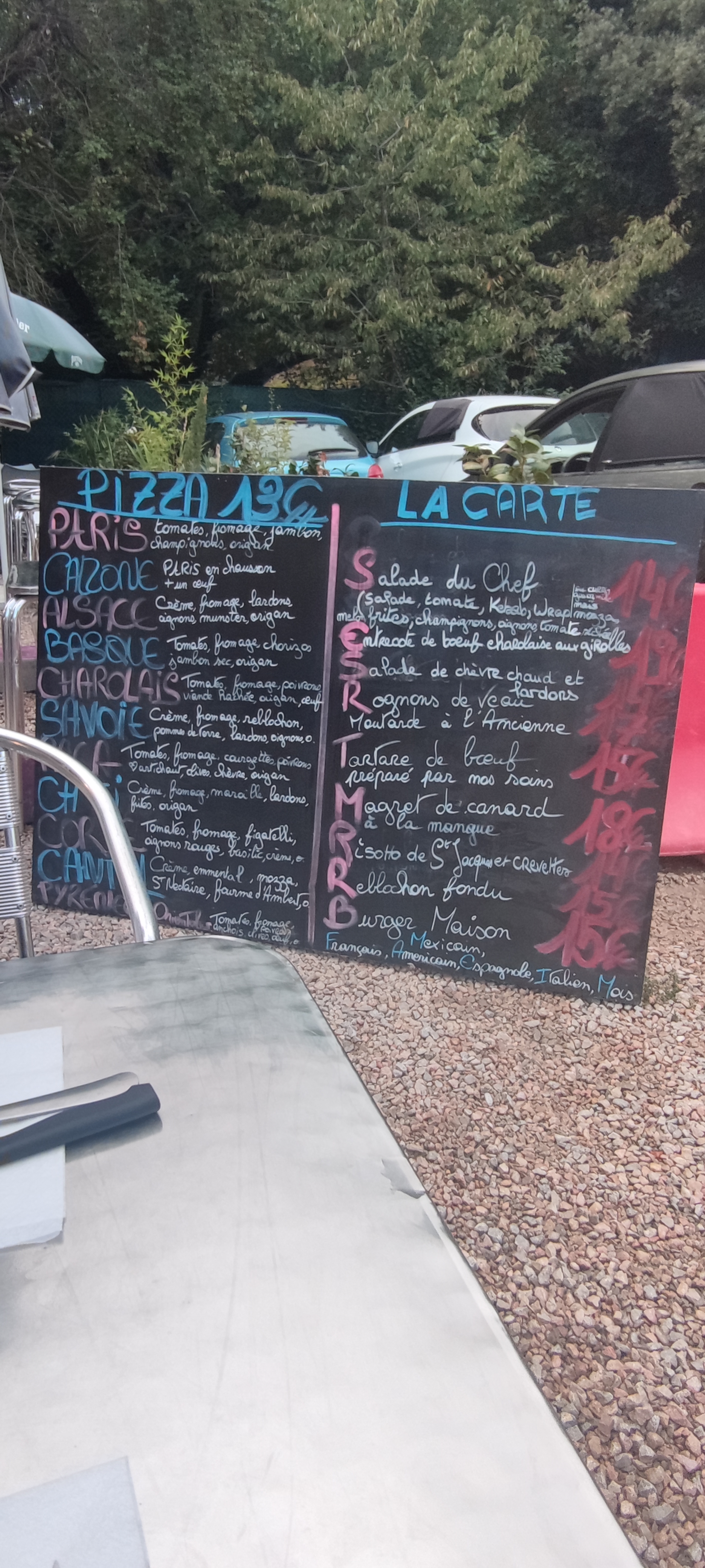 Pizza trop de fromage,et dommage que côté jardin il n'y ai t pas de balustrades en bois avec des fleurs pour faire vraiment côté jardin, car c'est pluton côté parking voiture dommage, il y a du potentiel, les serveuses super agréables. Et pas beaucoup de choix de digestifs.