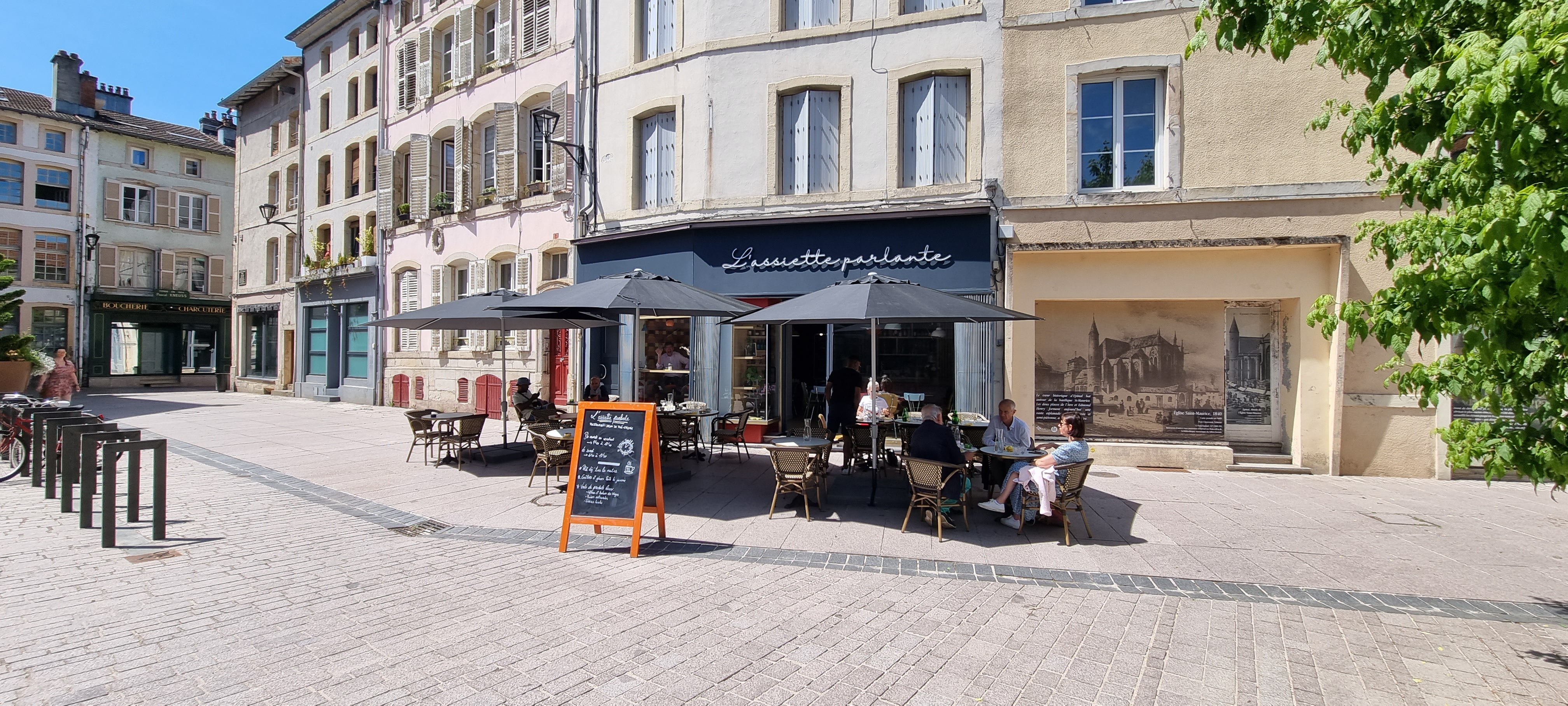 Un restaurant situé dans le vieux quartier d'Épinal à côté de la basilique St Maurice. Une grande terrasse et quelques places à l'intérieur. J'ai commandé une box pour la sans Valentin 😁 et je dois dire que j'ai été surprise par la qualité des plats. Tout était hyper frais et bien cuisiné. C'était très bon. De l'entrée au dessert, un zéro faute. Un accueil sympathique que j'ai beaucoup apprécié. J'irai bientôt goûter un menu du jour. 😋 J'oubliais ! Un petit mot à l'intérieur du sac, tout mimi 🥰