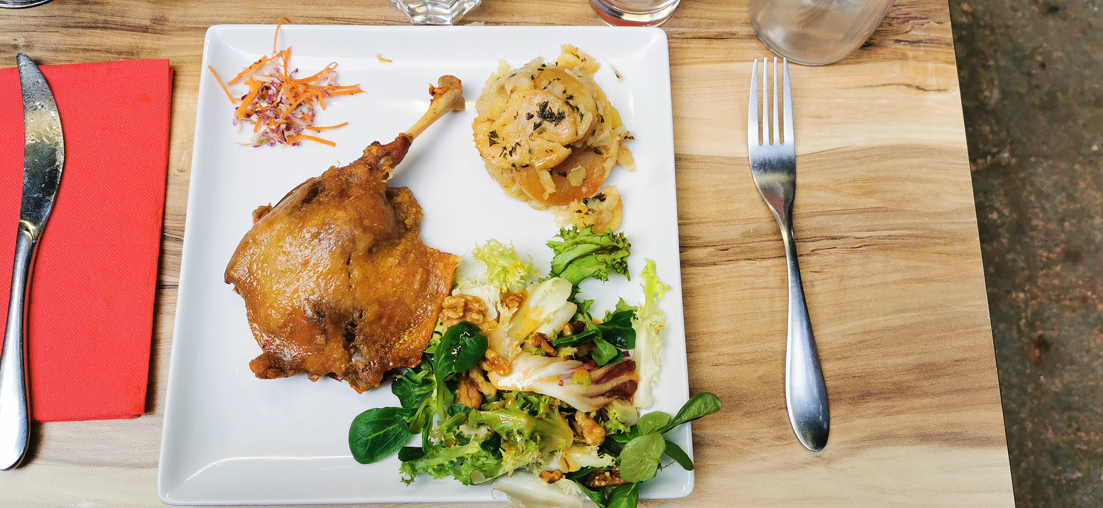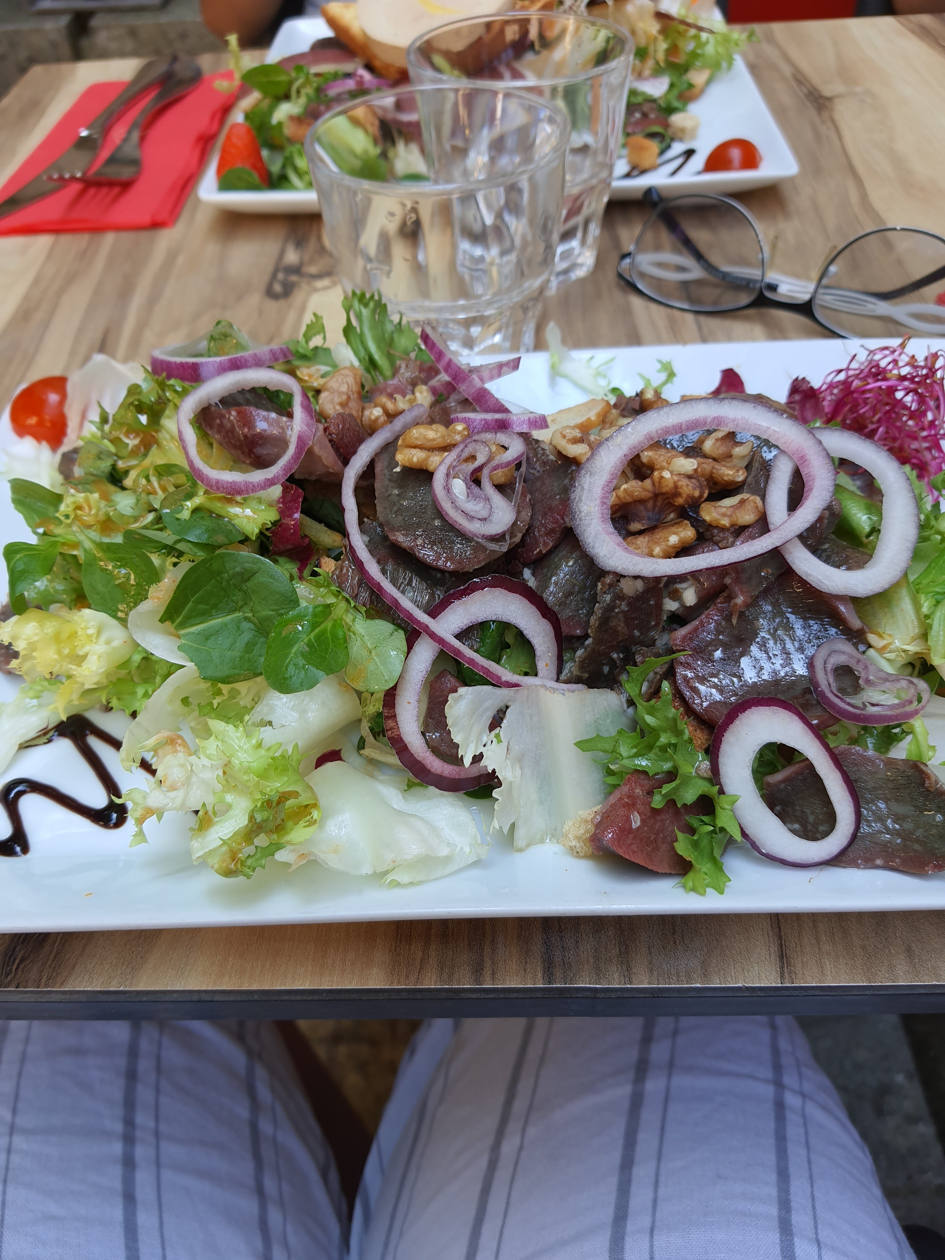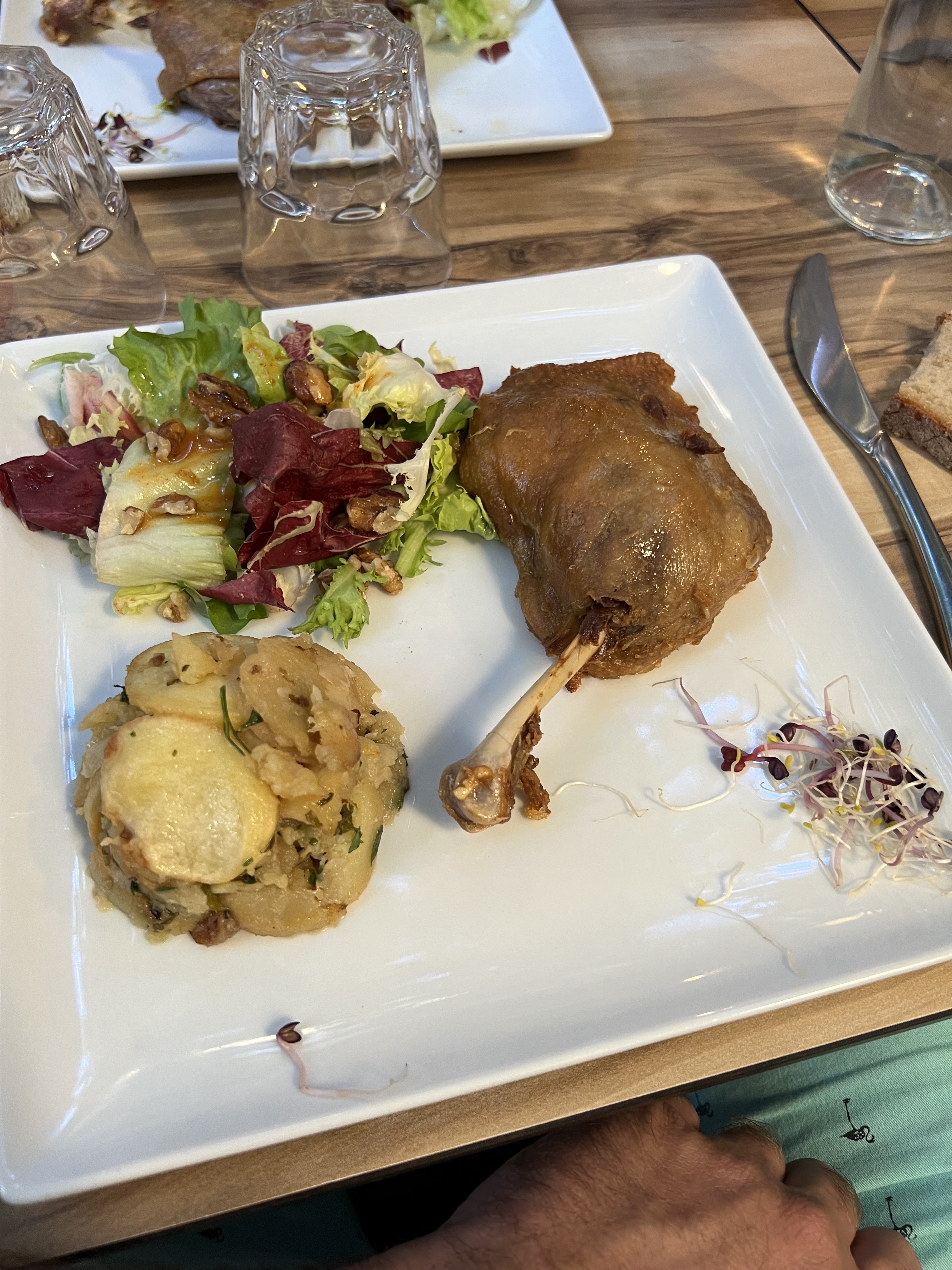 Arrivés par hasard dans ce restaurant,c'est la charmante terrasse ombragée qui nous a plu au premier abord. Nous avons pris une salade perigourdine et un confit de canard , repas délicieux et copieux . Service rapide .