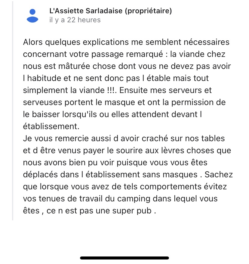 Votre commentaire nous fais perdre la tête. Qui croire ? Justement avec ma femme nous sommes venus récemment et le constat est flagrant ! Manque de professionnalisme du personnel qui nous as servis sans masque ou sinon sur le menton. Et pour reprendre la même réflexion nous avons eu l’impression d’être observé. Je ne peux pas donner d’avis sur la viande car nous avons pris du magret (très bon) En lisant votre réponse votre restaurant reste peu agréable à côtoyer. Aymeric et Jessica du 17