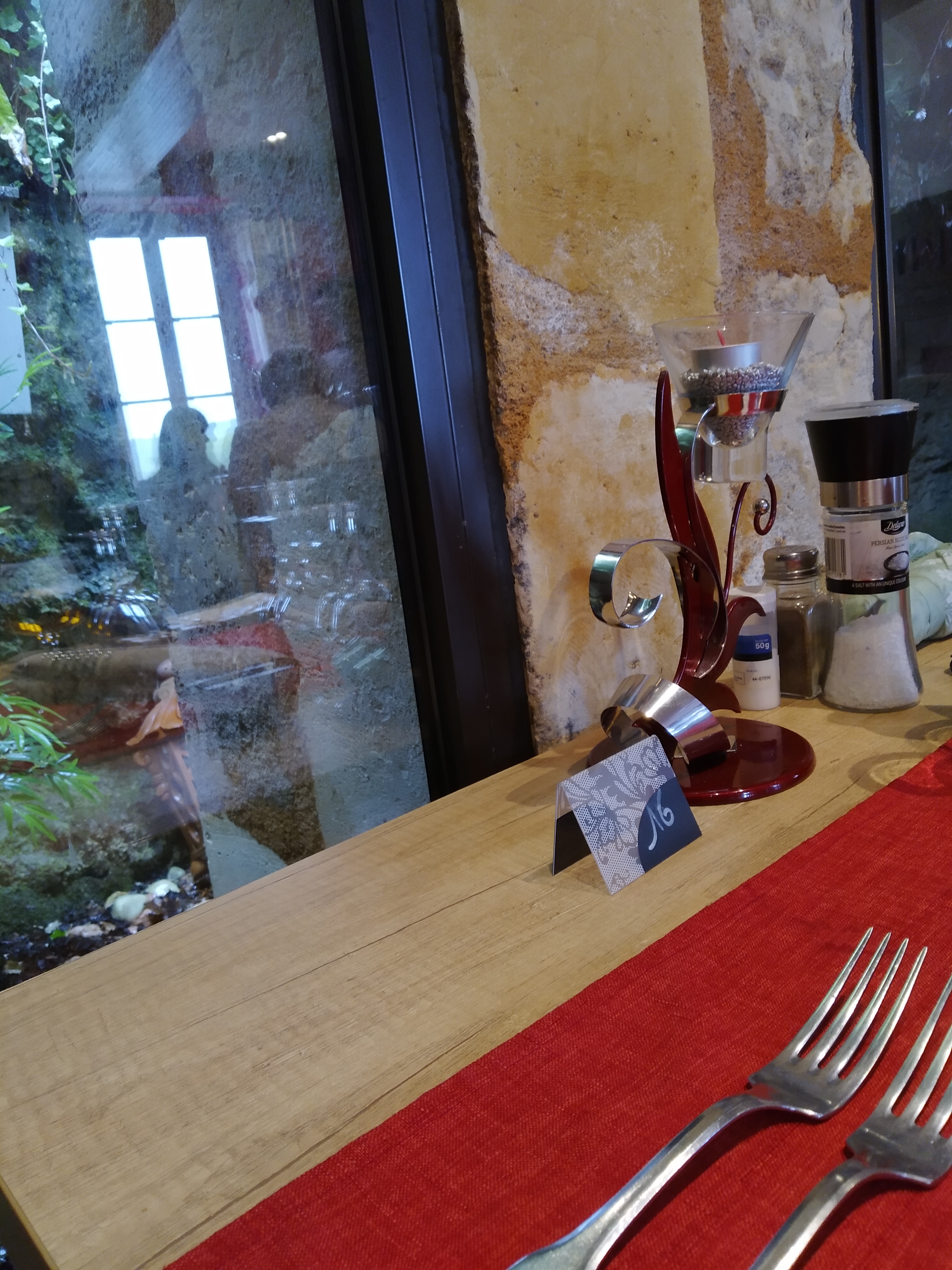 Bonjour Point positif le cadre eau qui circule et la paroi rocheuse à l'intérieur du restaurant. Bon accueil serveuse. Ça se complique au moment de la prise de commande, il faut choisir l'accompagnement légumes ou féculents pas possible de faire à moitié ou un peu de salade sinon s'est supplément, de plus le CHEF est monter à l'étage pour spécifier que s'est LUI qui décide et n'est pas a l'écoute de ses clients. Pour la première fois nous sommes tombés sur un sacré c..... Je vous laisse deviner la suite et bie