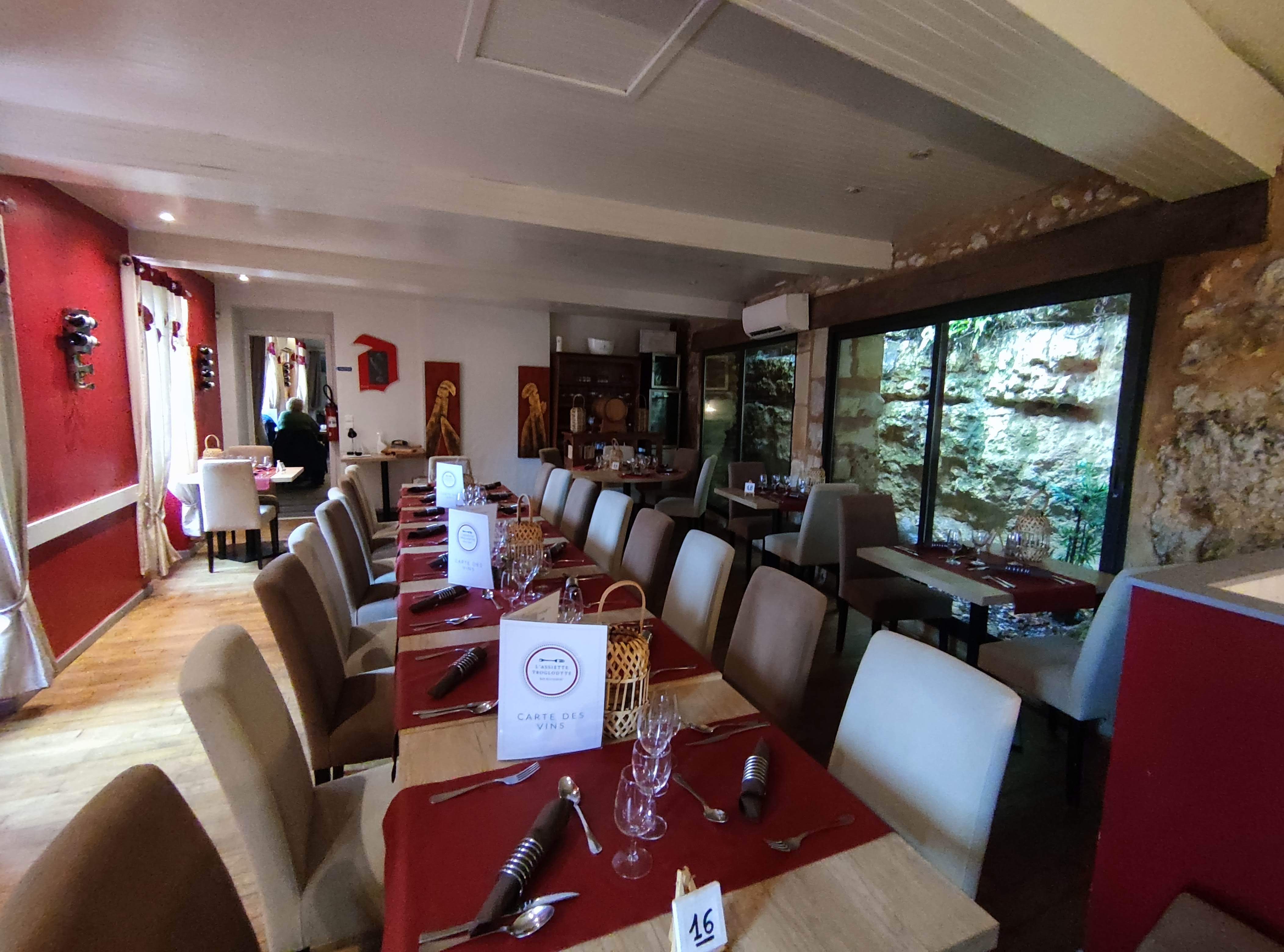 Découverte de passage, nous avons dîné (paella plat unique, une version gastronomique et généreuse éloignée de l'ennuyeuse paella classique) et petit déjeuner le lendemain (petit déjeuner complet pour 3 pour la modique somme de 13€!). Le cadre est incroyable pour les touristes que nous sommes (à même la roche creusée), le service chaleureux et attentif, le prix de 66€ pour 3 personnes incluant un menu complet et du vin le soir est incroyable, d'autant plus pour la qualité et le soin apporté. Une petite perle qui vaut le détour! Pour les campeurs: juste en face un parking gratuit équipé et propre permet de passer la nuit avec vue sur la rivière et le grand vert. Un grand merci au restaurant et à la mairie de Sourzac qui permet cette escapade