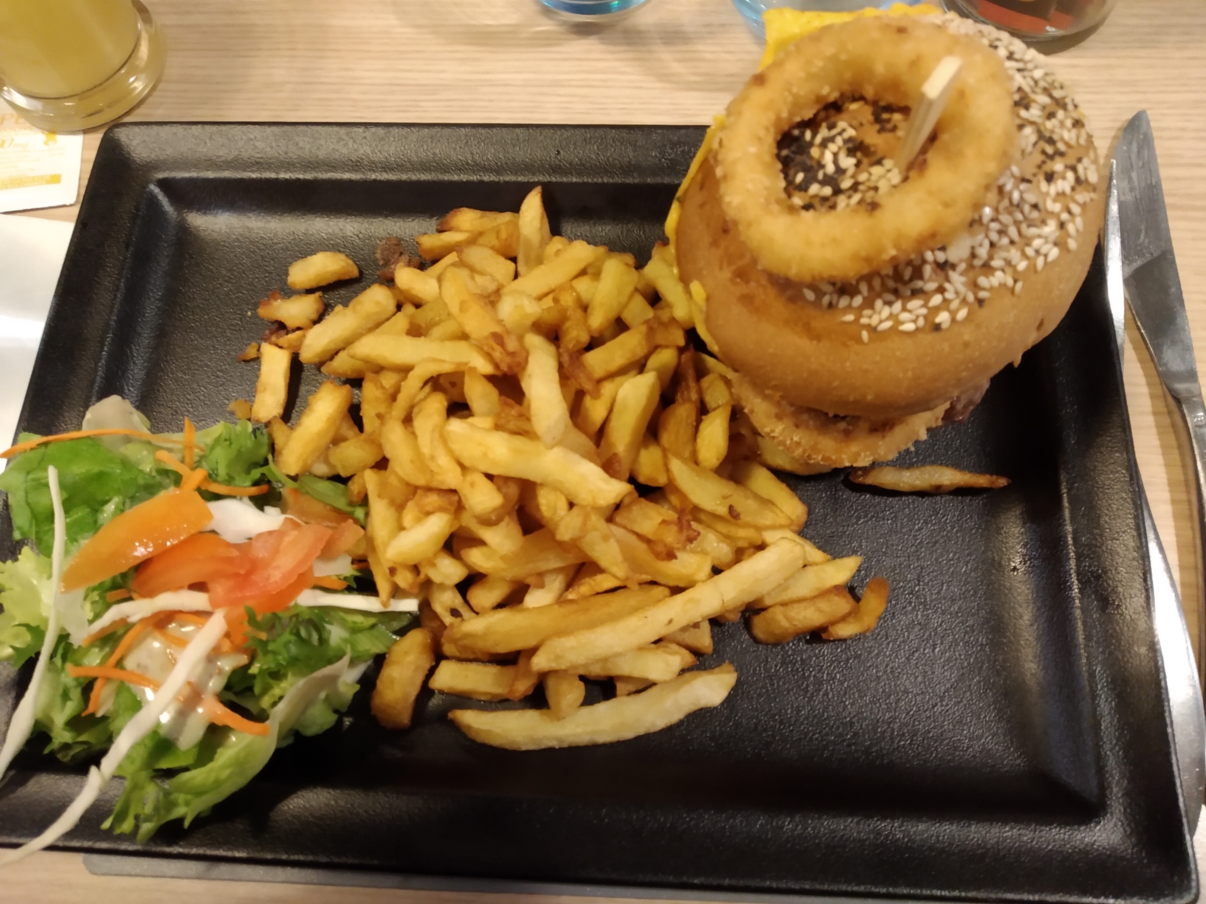 Dommage que les frites et le hamburger soit sec ,trop cuit,le steak bon mais le reste pas bon,très bon accueil par contre et bien servi.